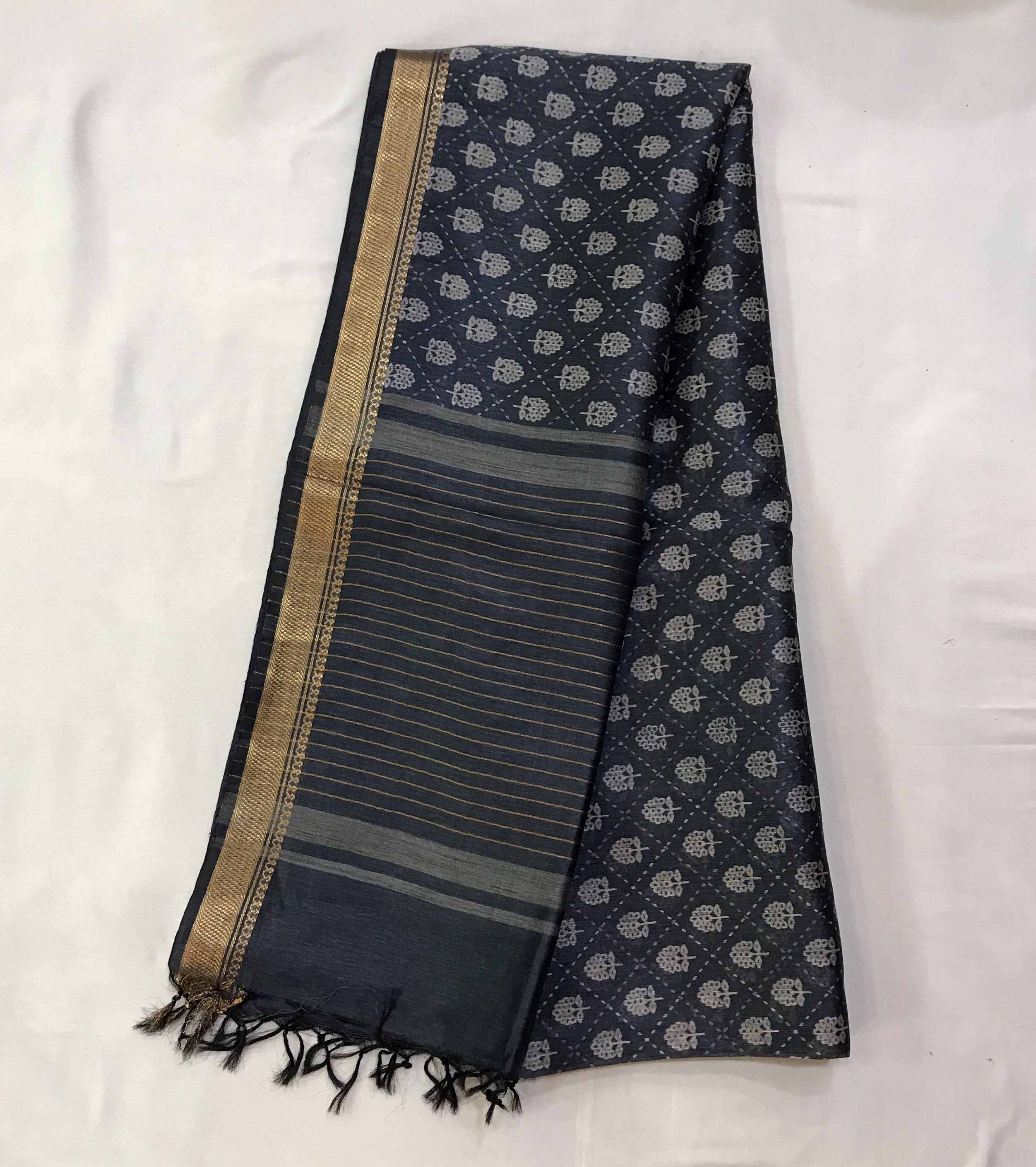 This printed design Blue color saree in pure Tussar Silk style saree with self coloured pallu looks fantastic. This saree is light in weight and looks fantastic at corporate events, casual brunches as well as get-togethers.