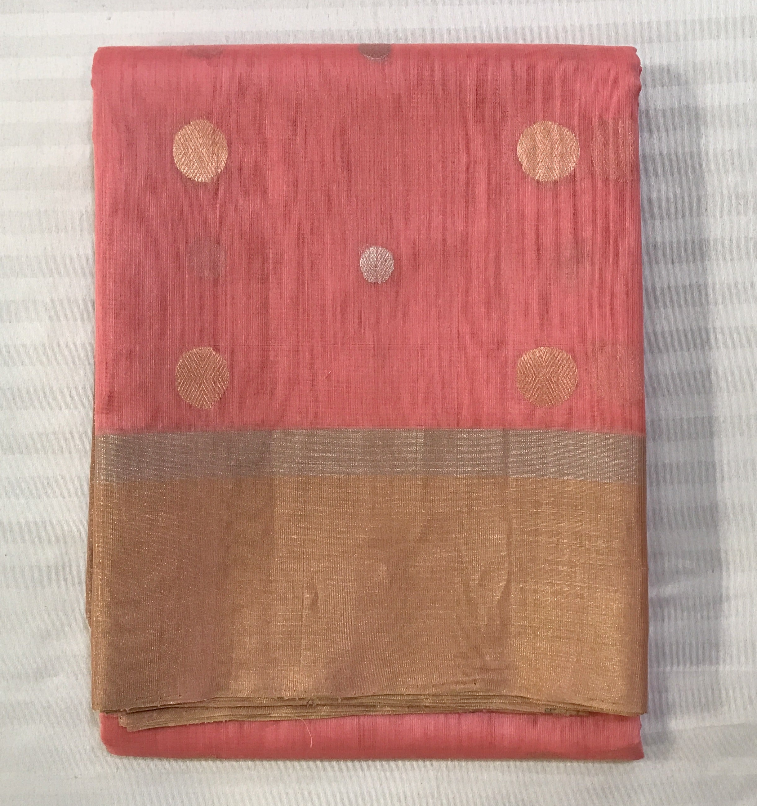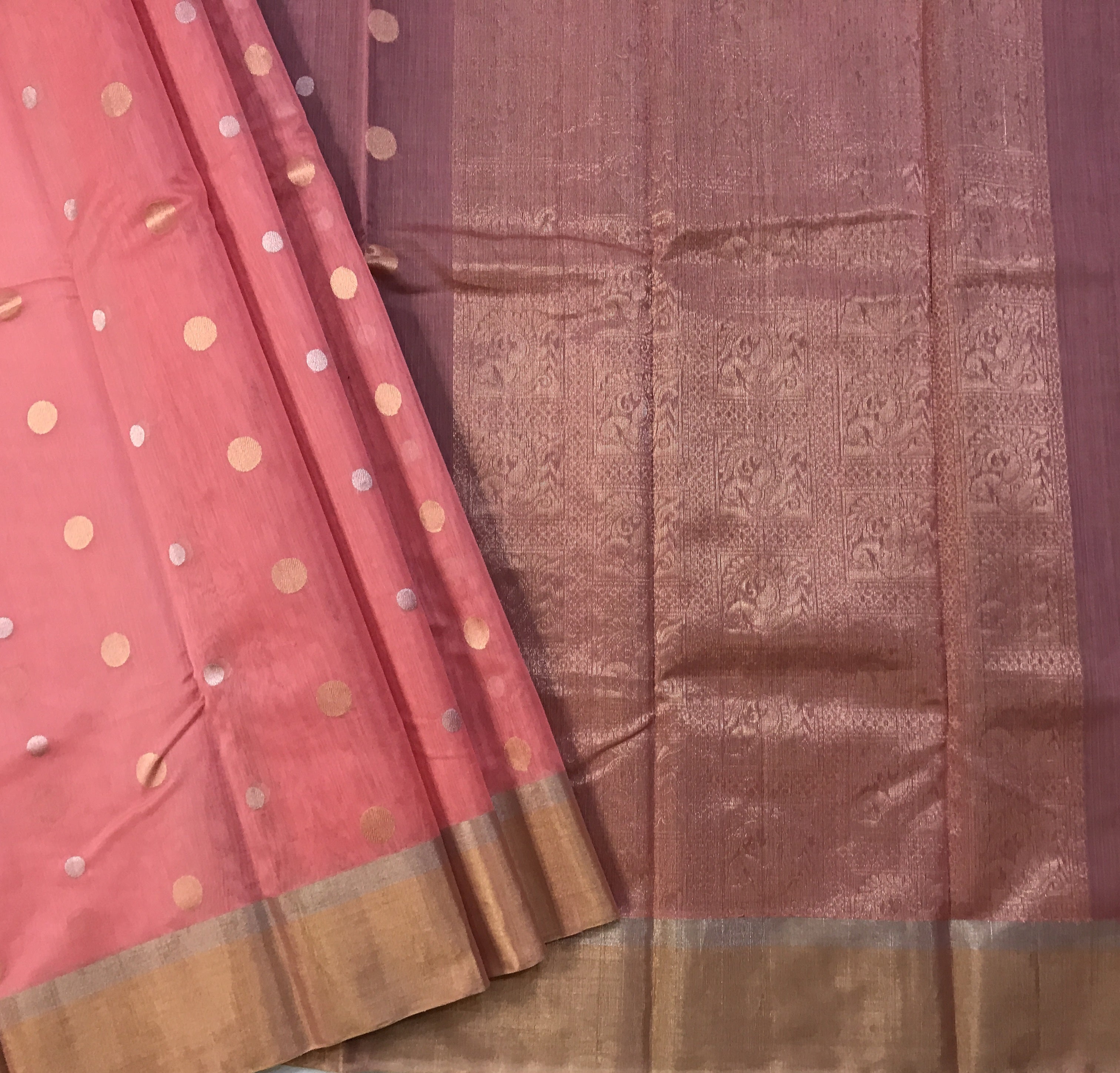 A shade of pink colour with round small silver and golden big zari butta this Silk Cotton Traditional saree is perfect for summers! The butti design and double ( silver-golden )zari border looks very outstanding with contrast zari pallu. Light in weight and easy to drape.