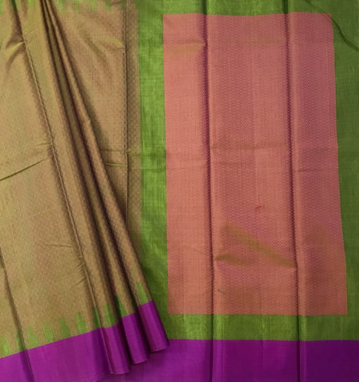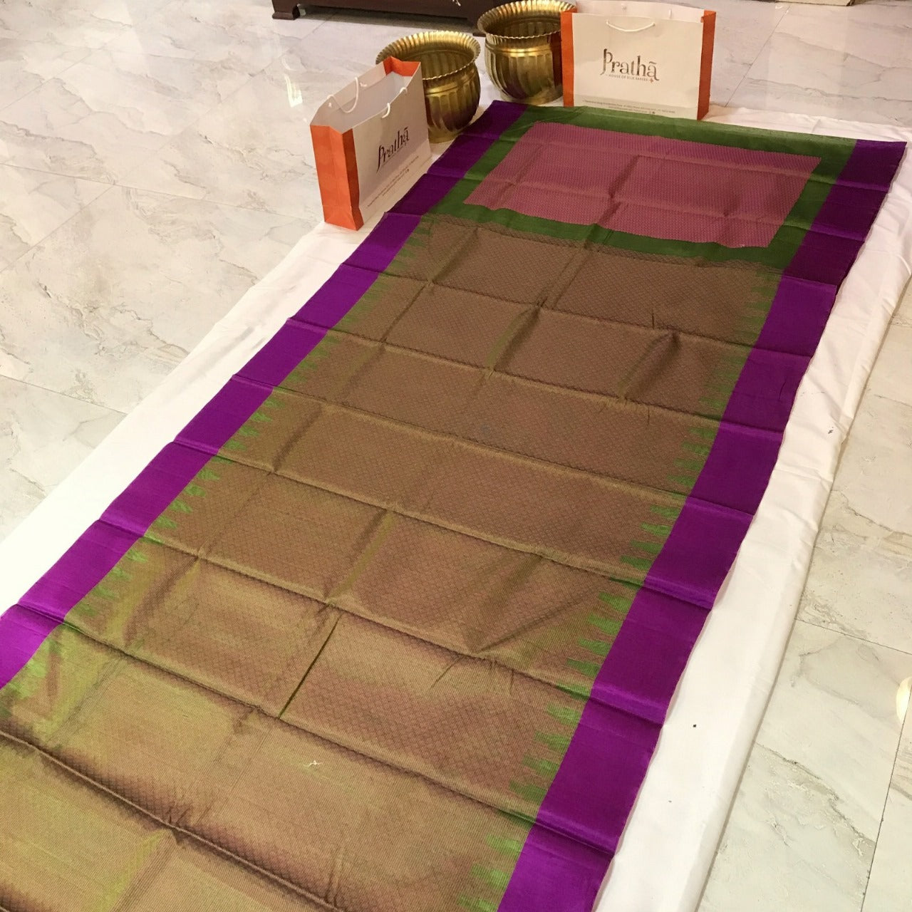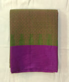 A very different type and nice and rotating shade of Brown and Green coloured Silk Cotton Traditional saree , perfect saree for summers! Don't miss the self texture design without motifs with temple design broad border is looks very outstanding and pallu. Light in weight and easy to drape.