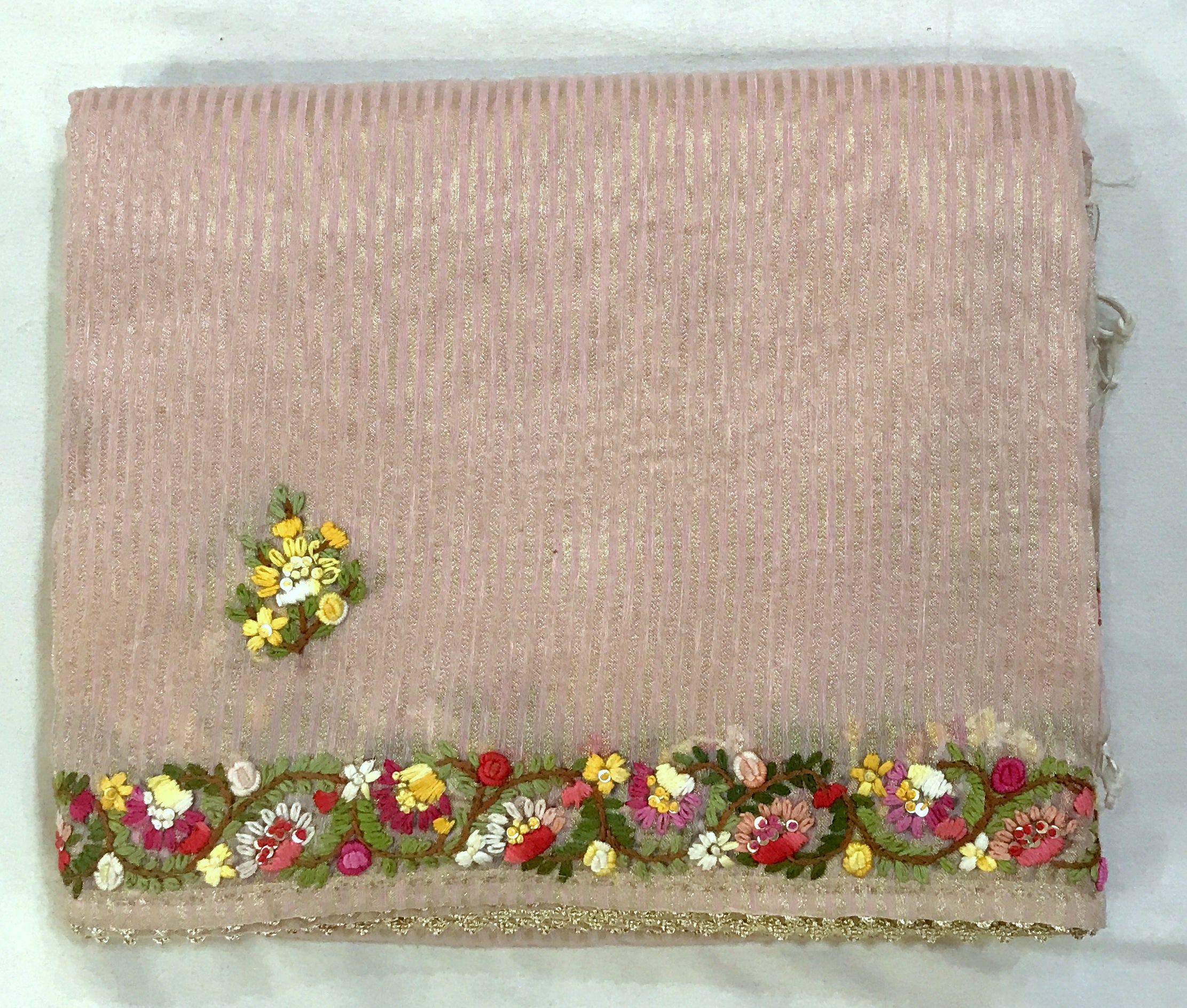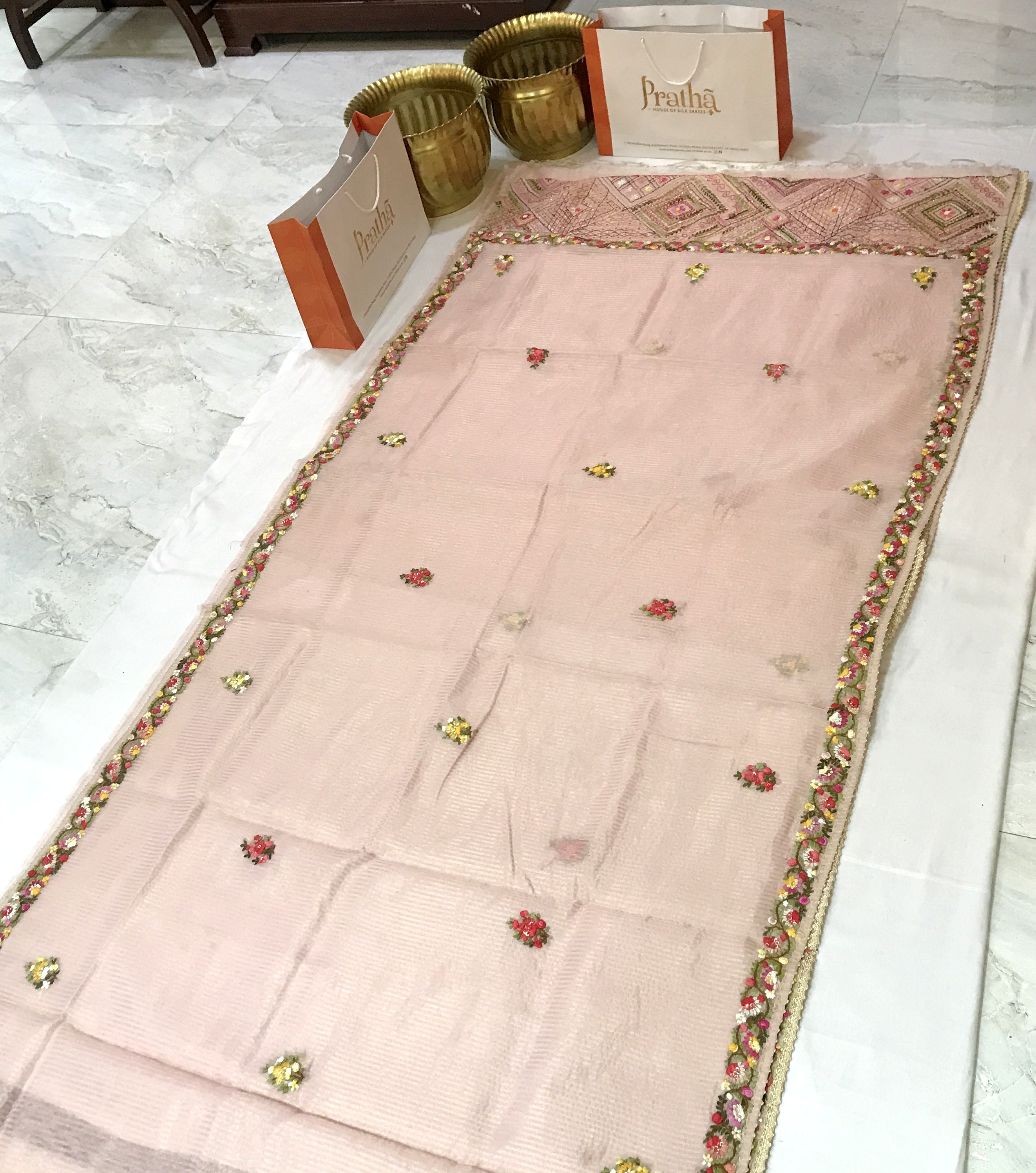 This elegant pastel pink Kota tissue saree beautifully blends subtlety with grace. Adorned with delicate floral buttis across the body. The soft tissue texture enhances its sheer appeal, while the understated golden zari border adds a touch of richness without overpowering its elegance. Lightweight and graceful, this saree is perfect for formal gatherings, festive occasions, or even intimate celebrations, making it a timeless wardrobe treasure.