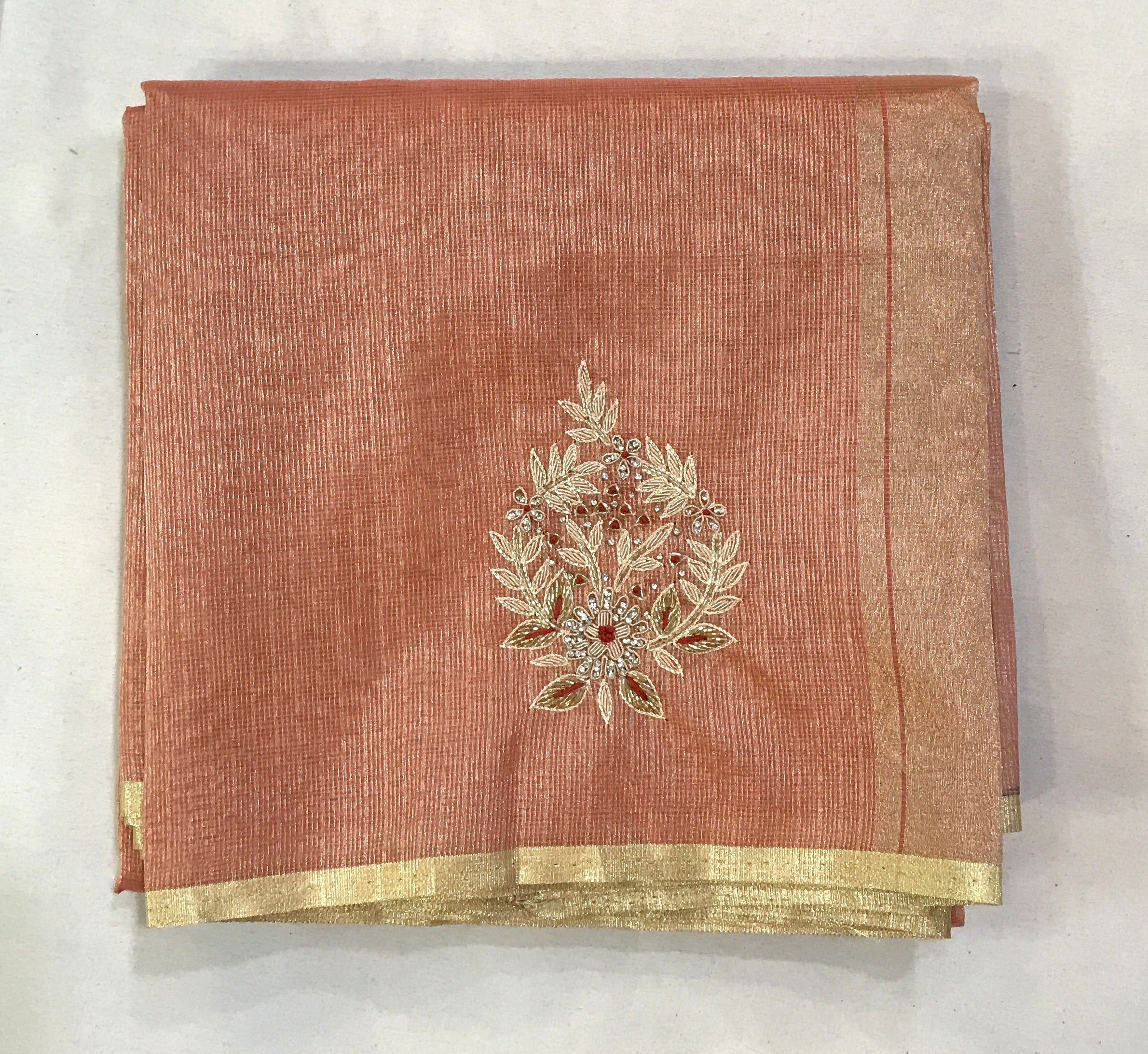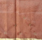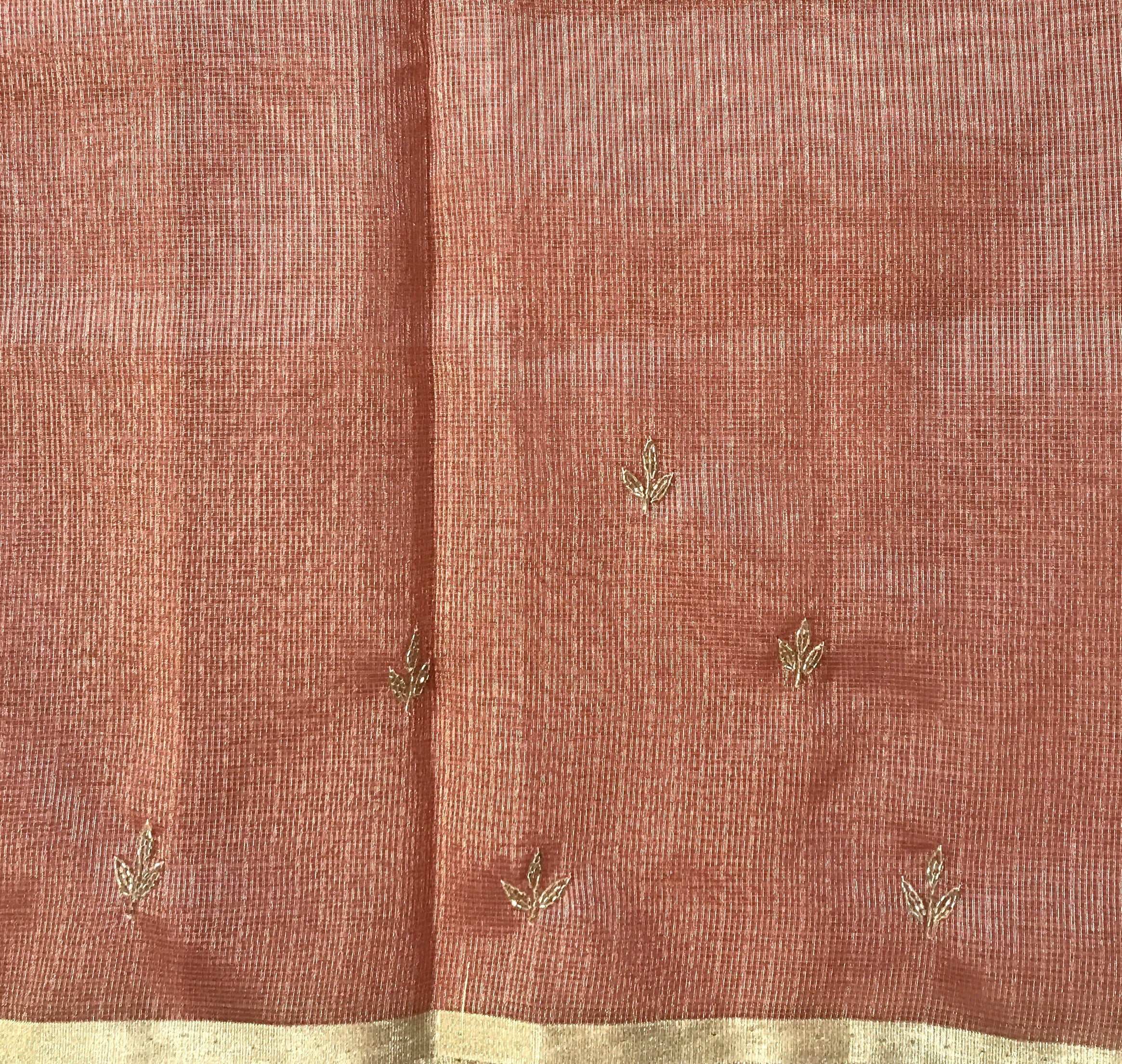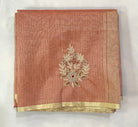 This elegant pastel peach-pink Kota tissue saree beautifully blends subtlety with grace. Adorned with delicate floral buttis across the body, highlighted with a touch of red in the motifs, it exudes a refined charm. The soft tissue texture enhances its sheer appeal, while the understated golden zari border adds a touch of richness without overpowering its elegance. Lightweight and graceful, this saree is perfect for formal gatherings, festive occasions, or even intimate celebrations, making it a timeless wardrobe treasure.