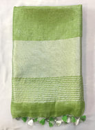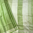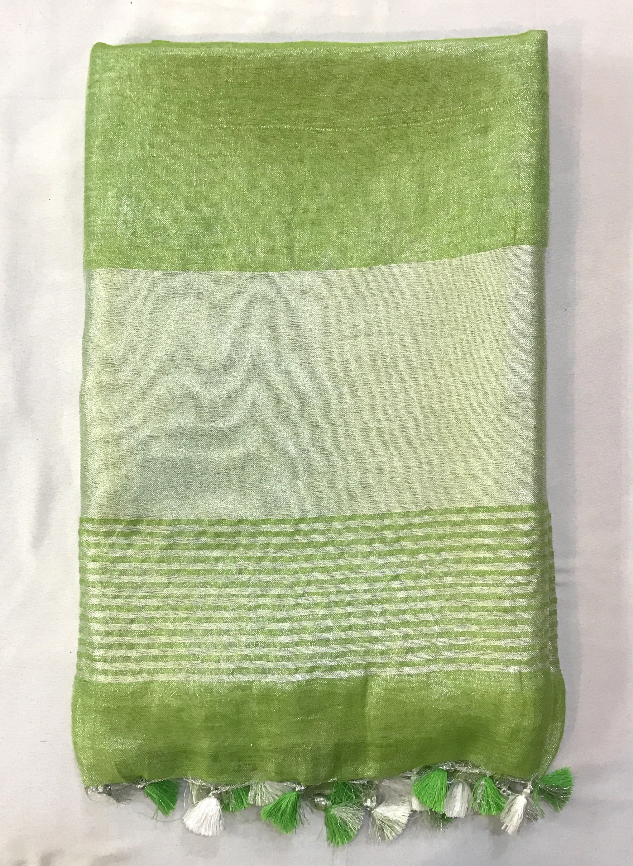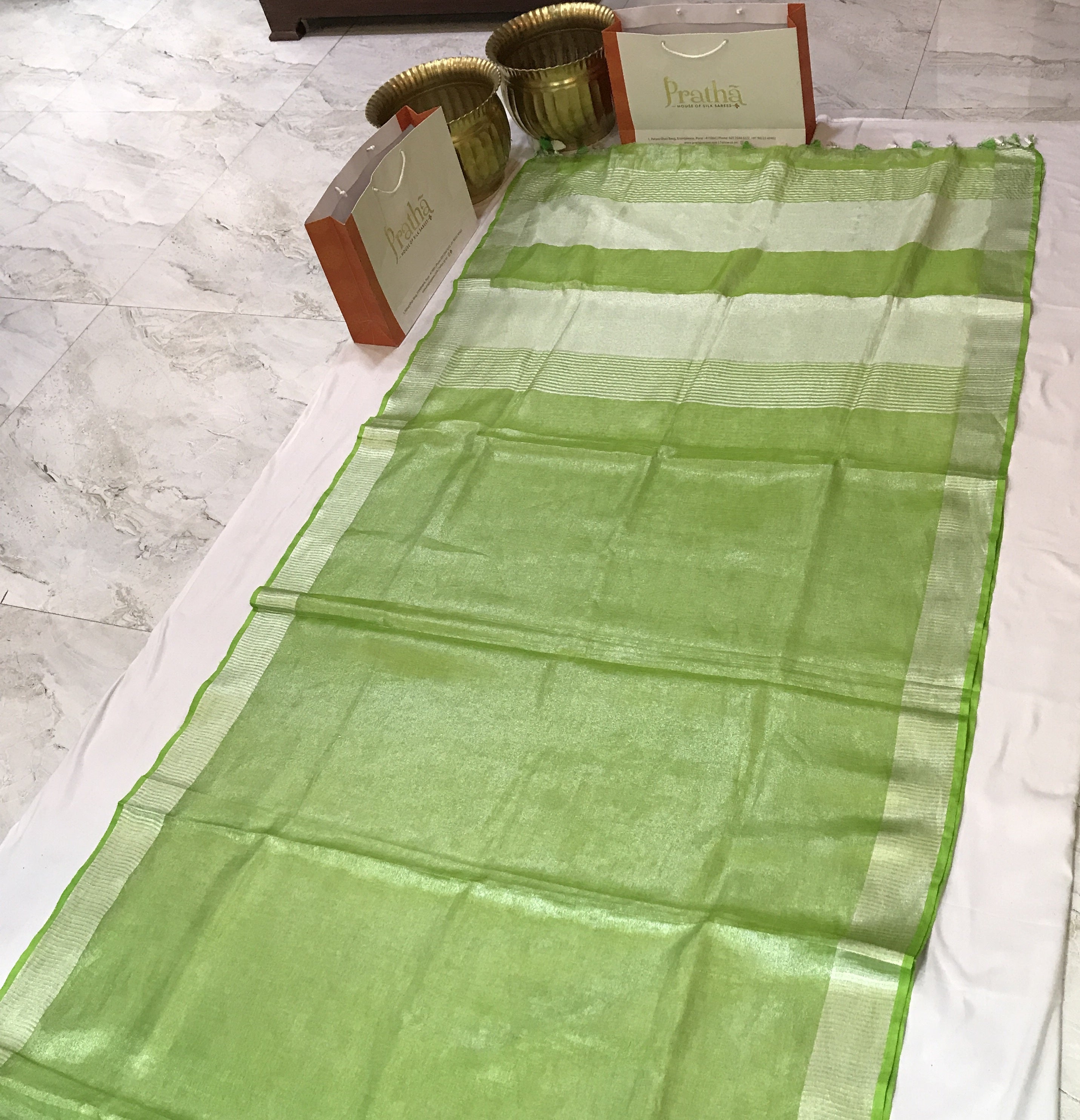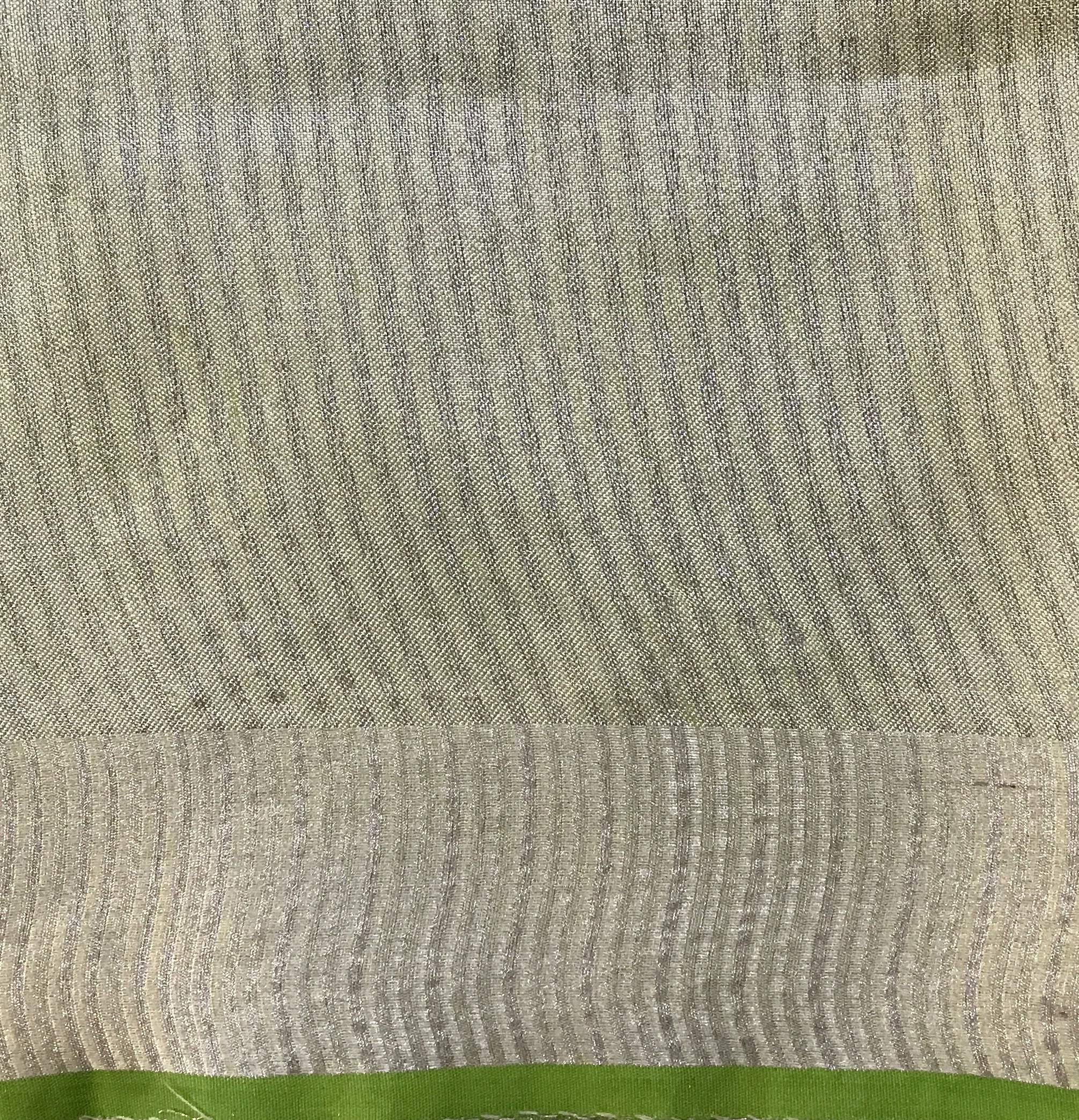 A beautiful cusp of Tissue and linen weaving, this saree style is loved by so many! The sheen because off tissue and the lightness of linen both are pleasing to the eyes and comfortable to drape! The 'green' shaded of Linen, with bold and beautiful silver zari border with zari pallu looks casual and festive at the same time! This saree is light in weight and looks great at parties, corporate events, casual occasions as well as festive ones. This piece is a stunner and perfect for Summers.