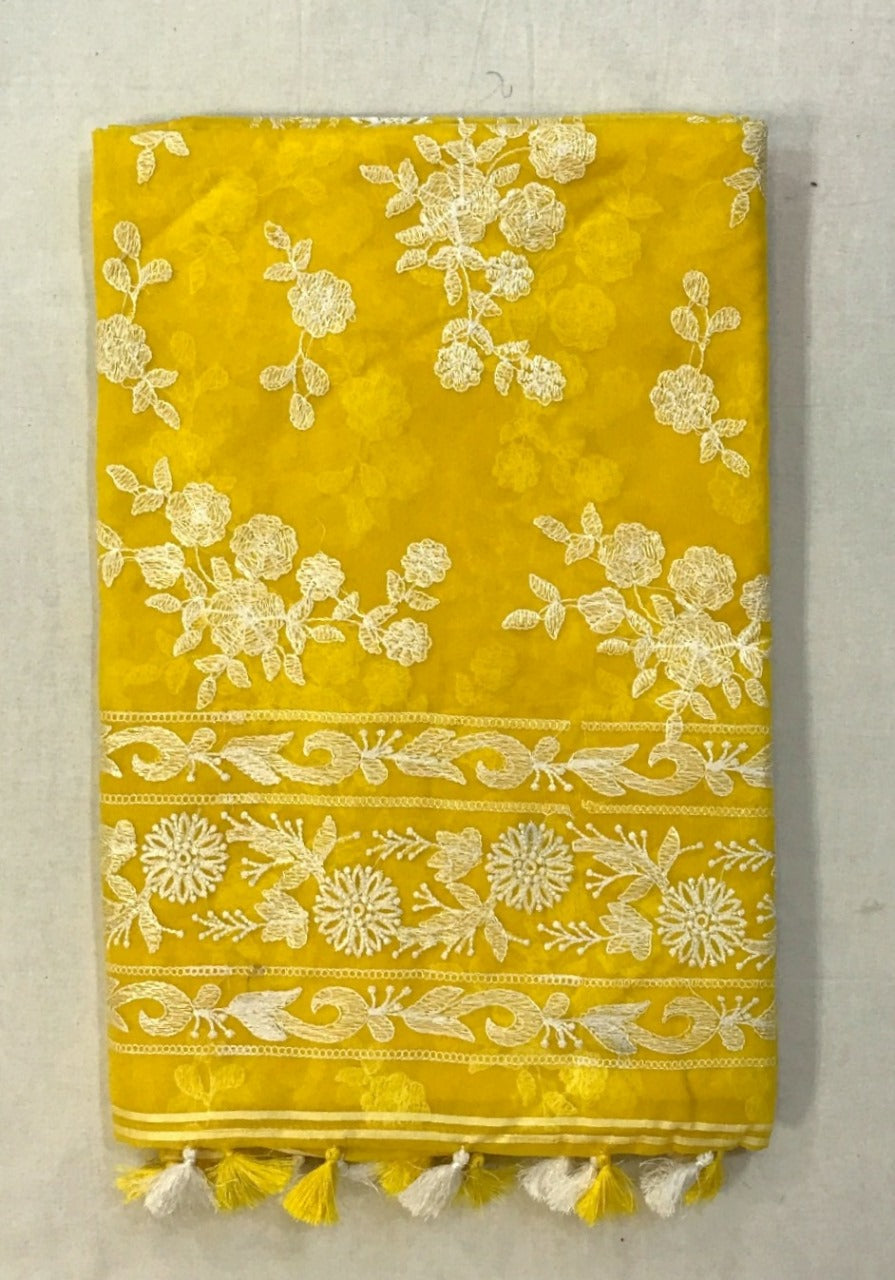 Step into luxury with this exquisite yellow silk designer saree, crafted for the modern woman who appreciates tradition with a contemporary twist. The rich silk fabric drapes beautifully, offering a regal charm with its smooth texture and natural sheen. Intricate embroidery adorns the saree with delicate floral and paisley motifs, shimmering threads, and subtle sequin embellishments, exuding sophistication.