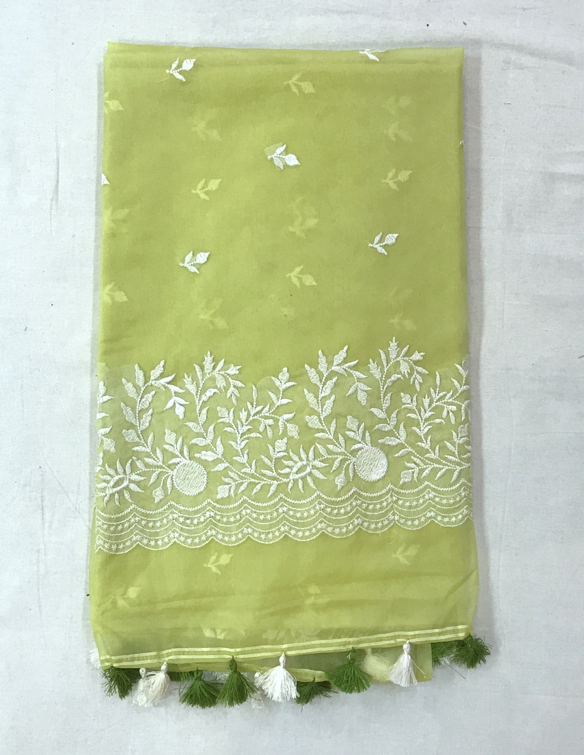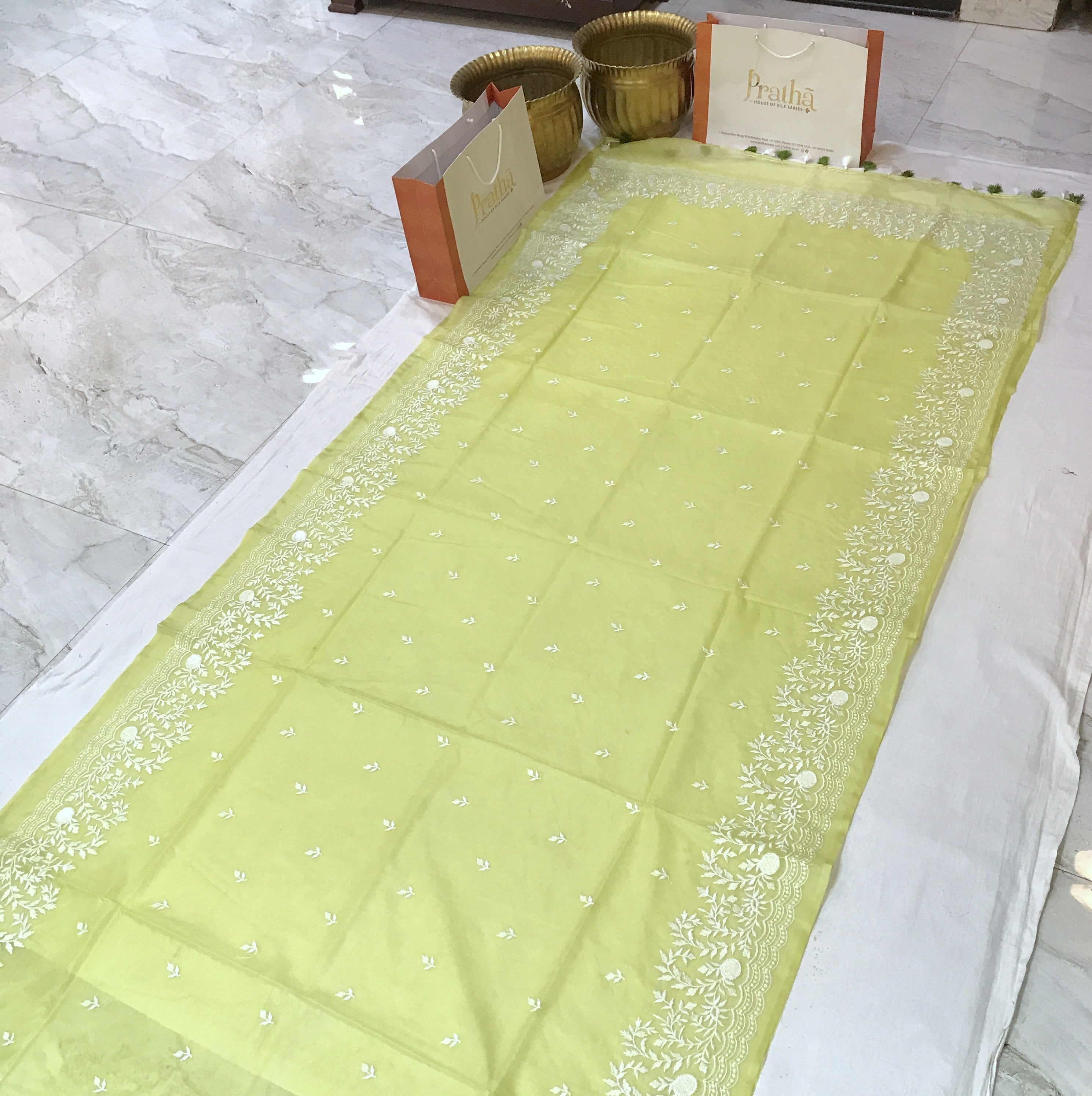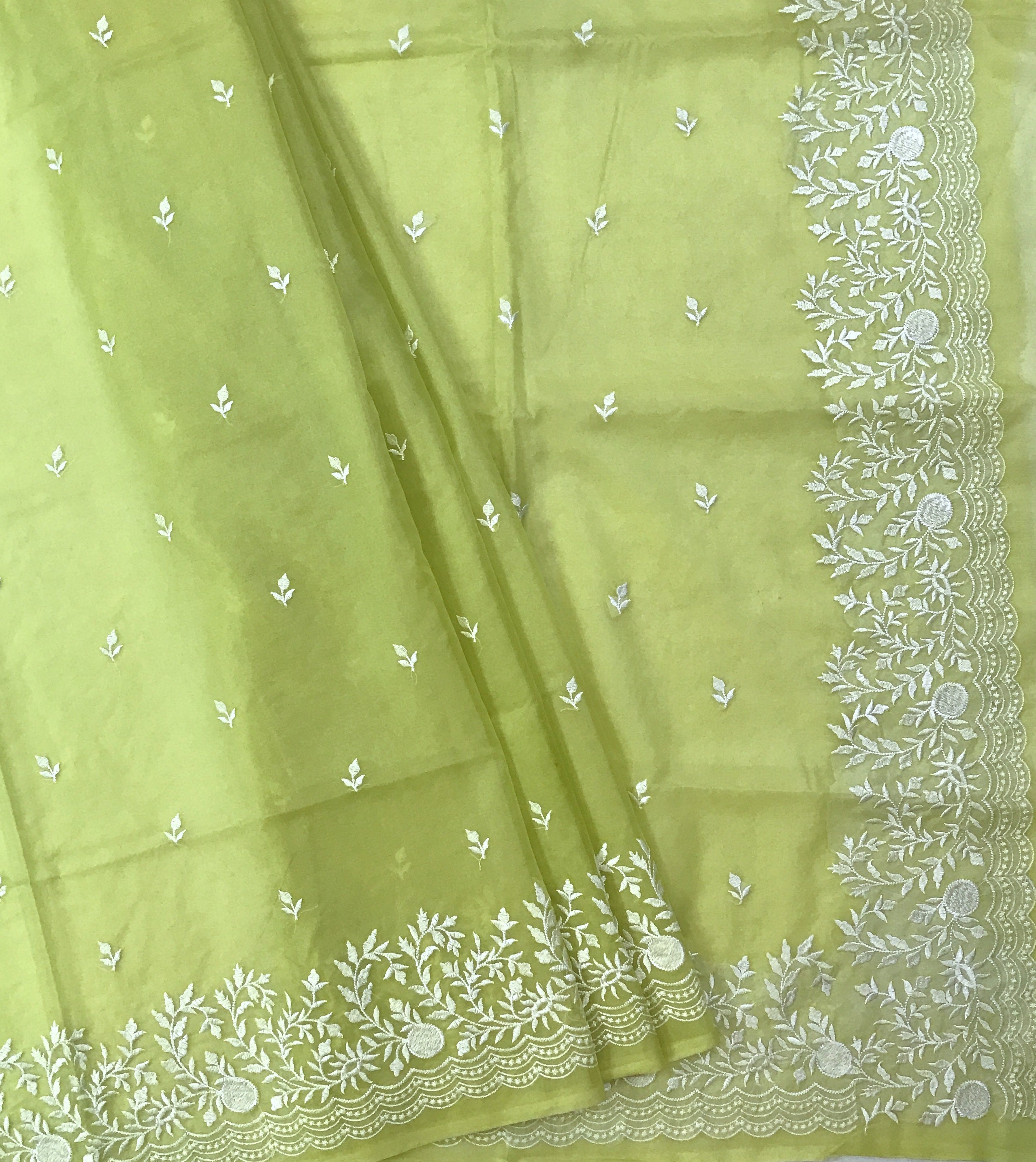 Step into luxury with this exquisite lime-green silk designer saree, crafted for the modern woman who appreciates tradition with a contemporary twist. The rich silk fabric drapes beautifully, offering a regal charm with its smooth texture and natural sheen. Intricate embroidery adorns the saree with delicate floral and paisley motifs, shimmering threads, and subtle sequin embellishments, exuding sophistication.