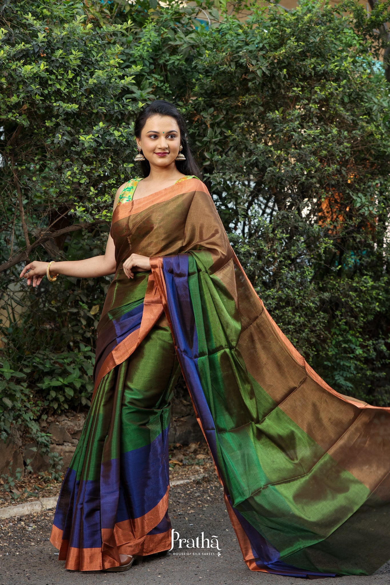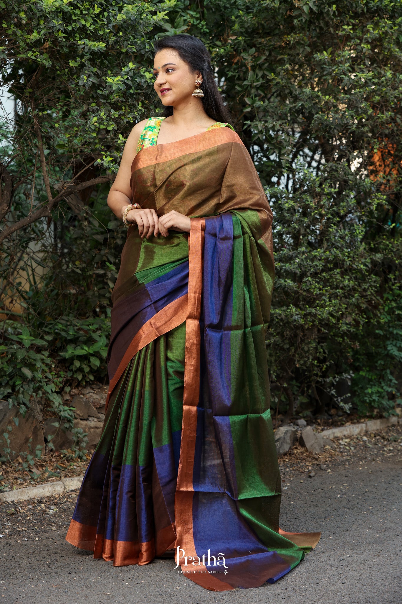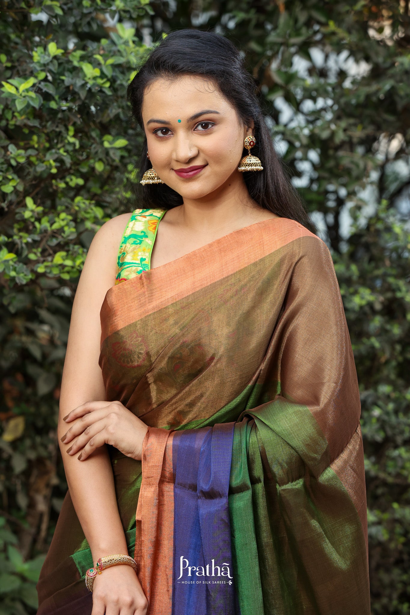 A beautiful cusp of designer Tissue and linen weaving, this saree design style is loved by so many! The sheen because off tissue and the lightness of linen both are pleasing to the eyes and comfortable to drape! The 'green blue purple' shade of Linen, with bold and beautiful pallu looks casual and festive at the same time! This saree looks great at parties, corporate events, casual occasions as well as festive ones. This piece is a stunner and perfect for Summers.