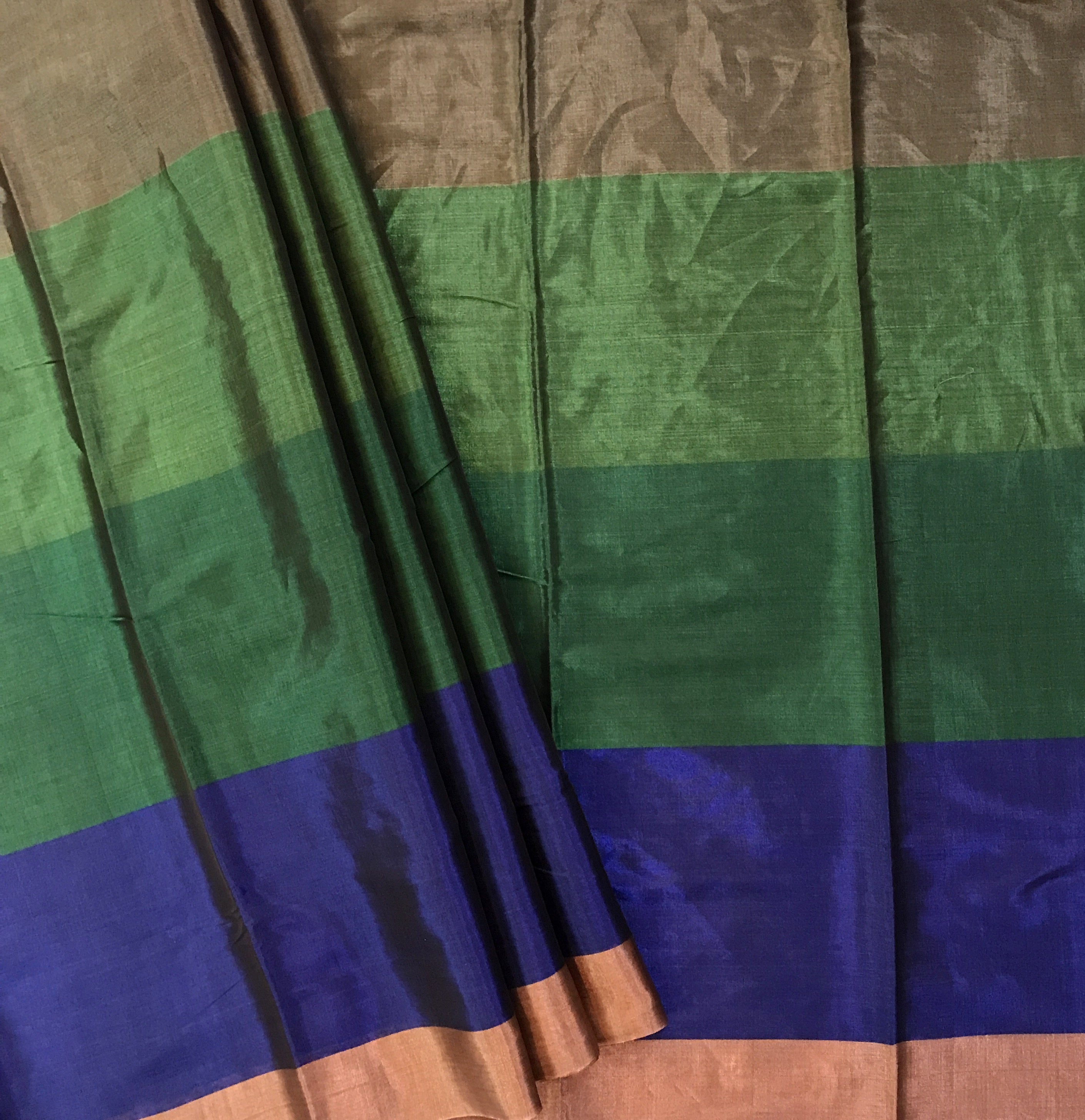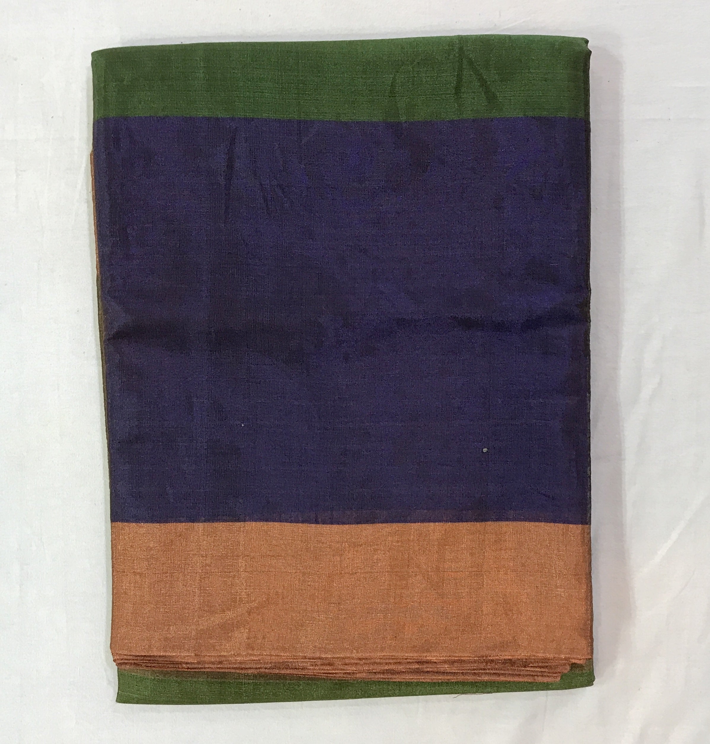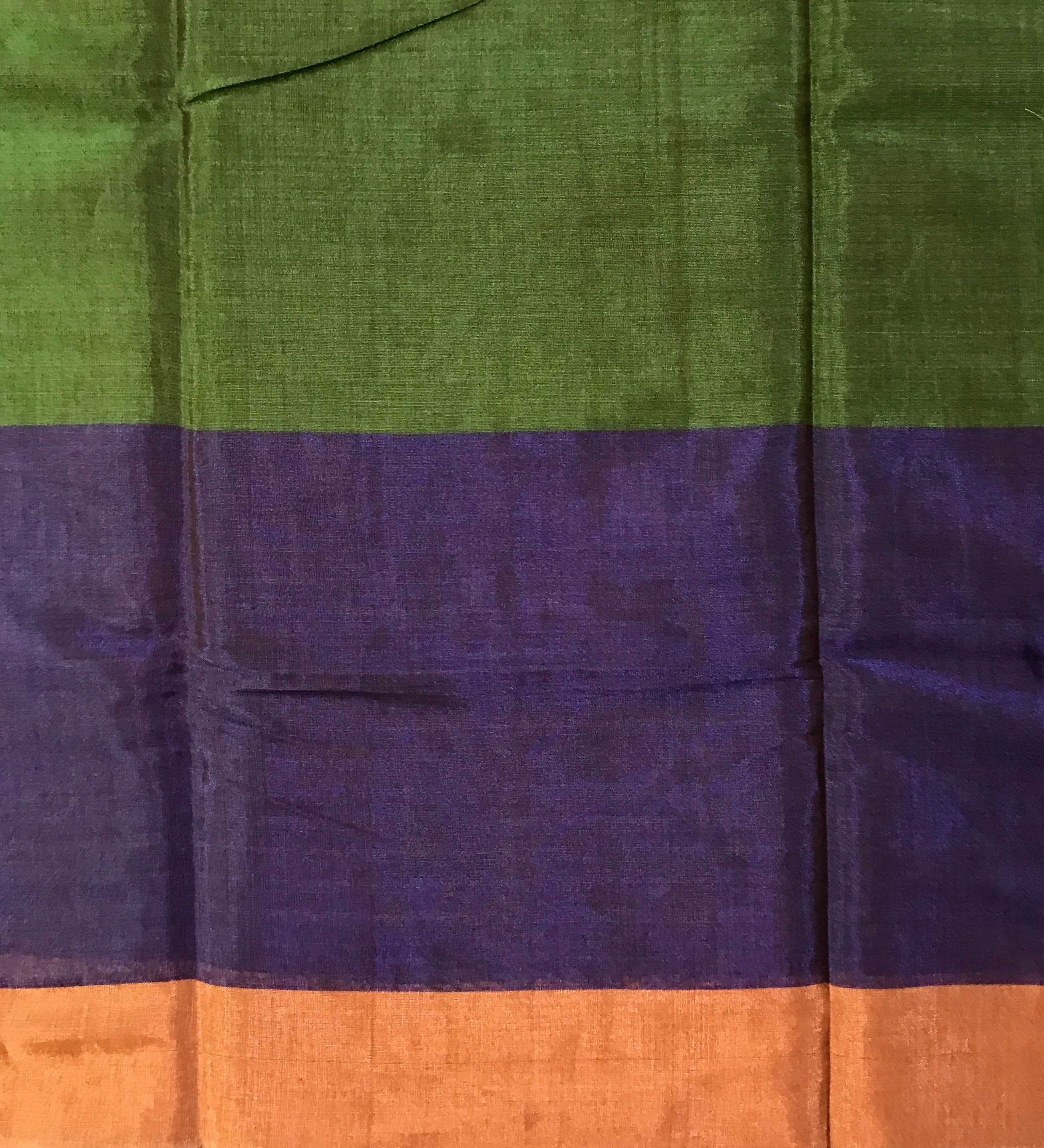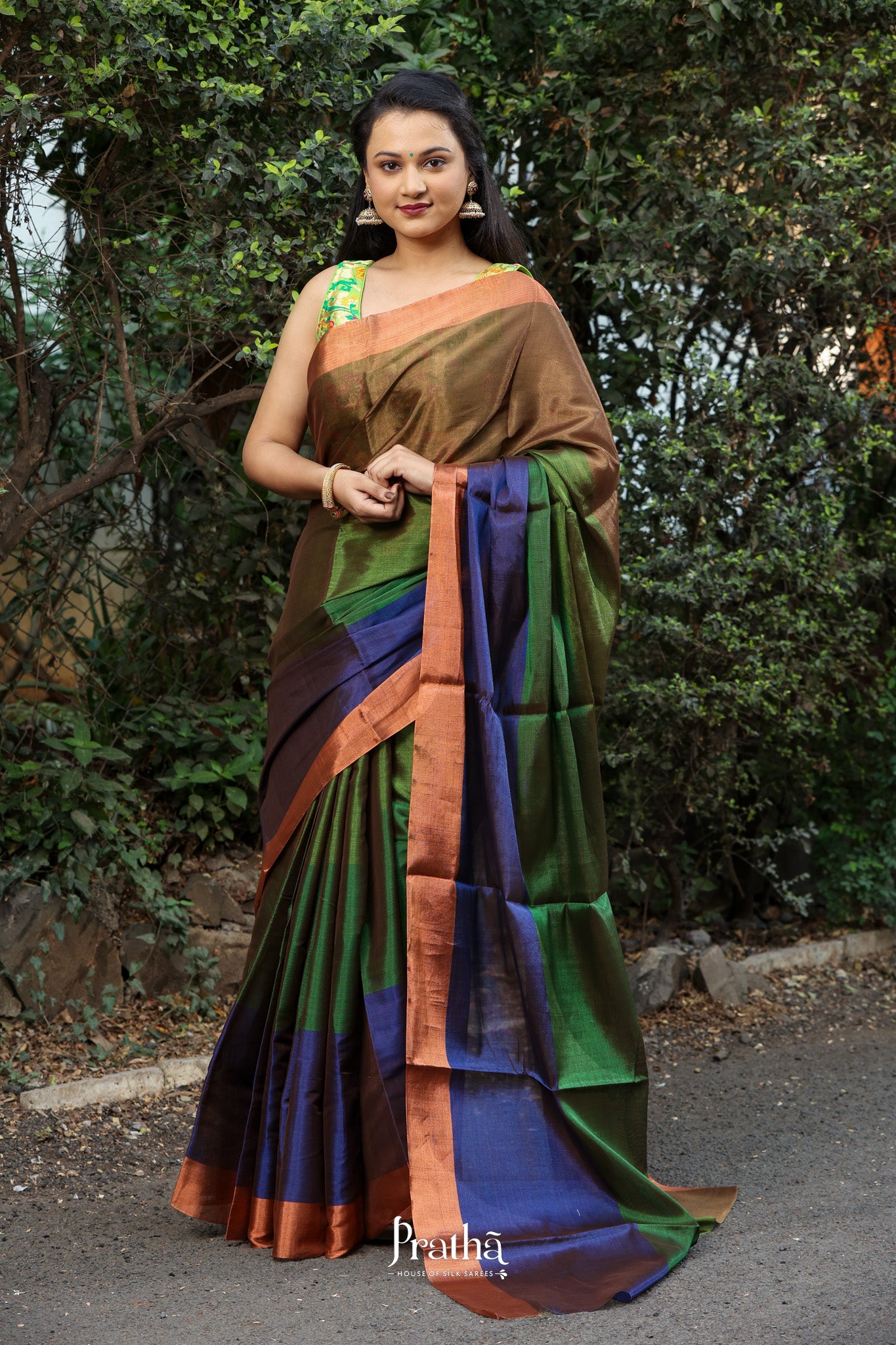 A beautiful cusp of designer Tissue and linen weaving, this saree design style is loved by so many! The sheen because off tissue and the lightness of linen both are pleasing to the eyes and comfortable to drape! The 'green blue purple' shade of Linen, with bold and beautiful pallu looks casual and festive at the same time! This saree looks great at parties, corporate events, casual occasions as well as festive ones. This piece is a stunner and perfect for Summers.