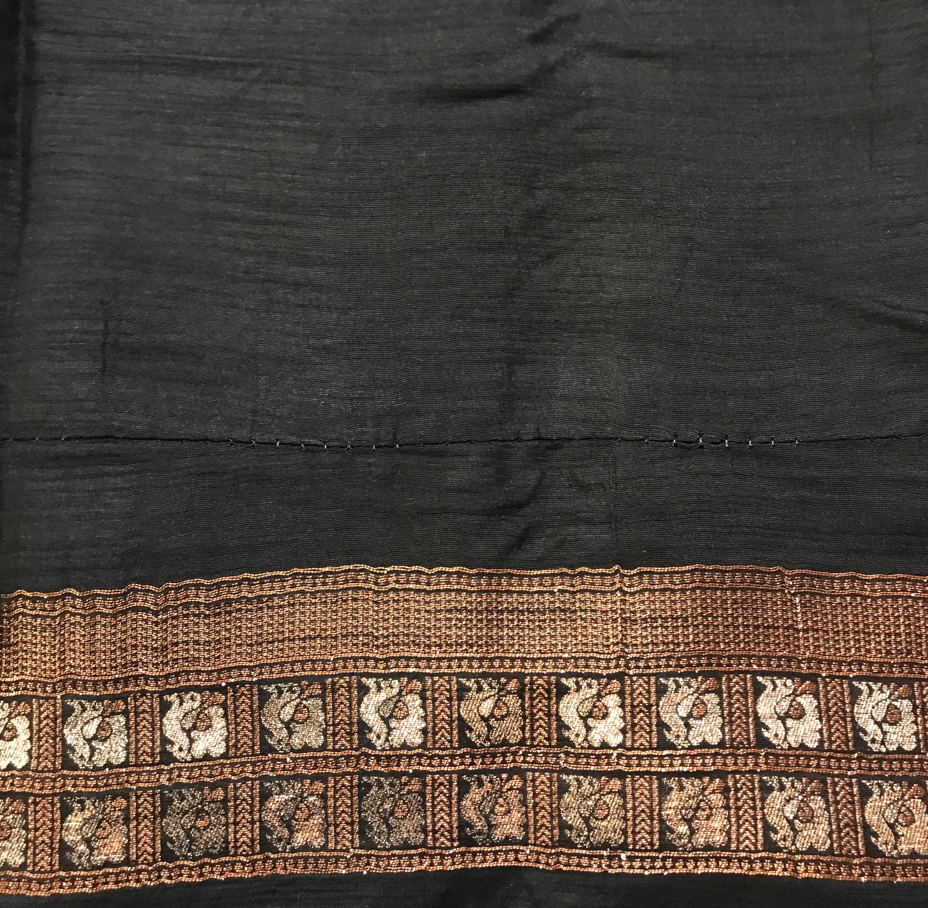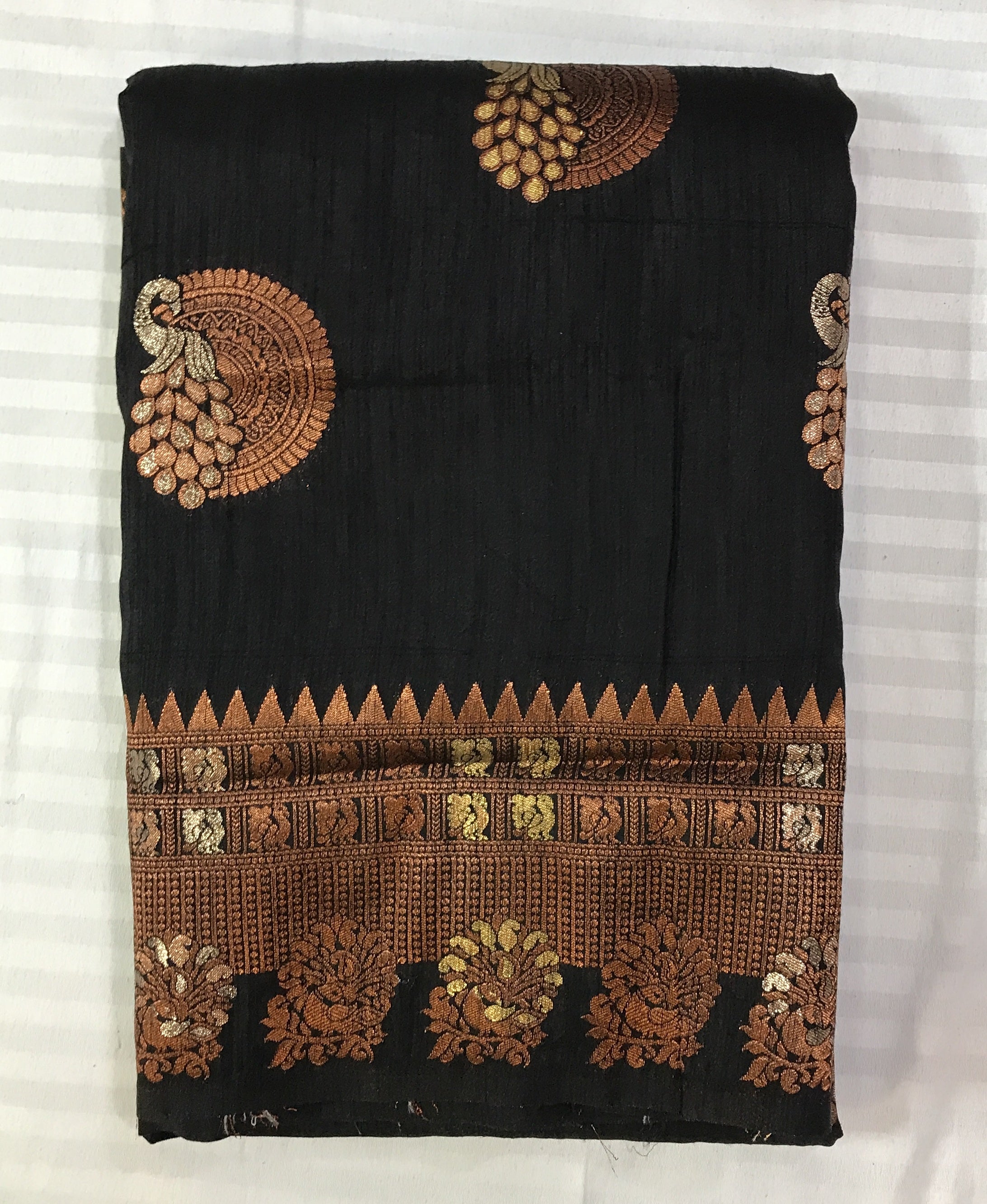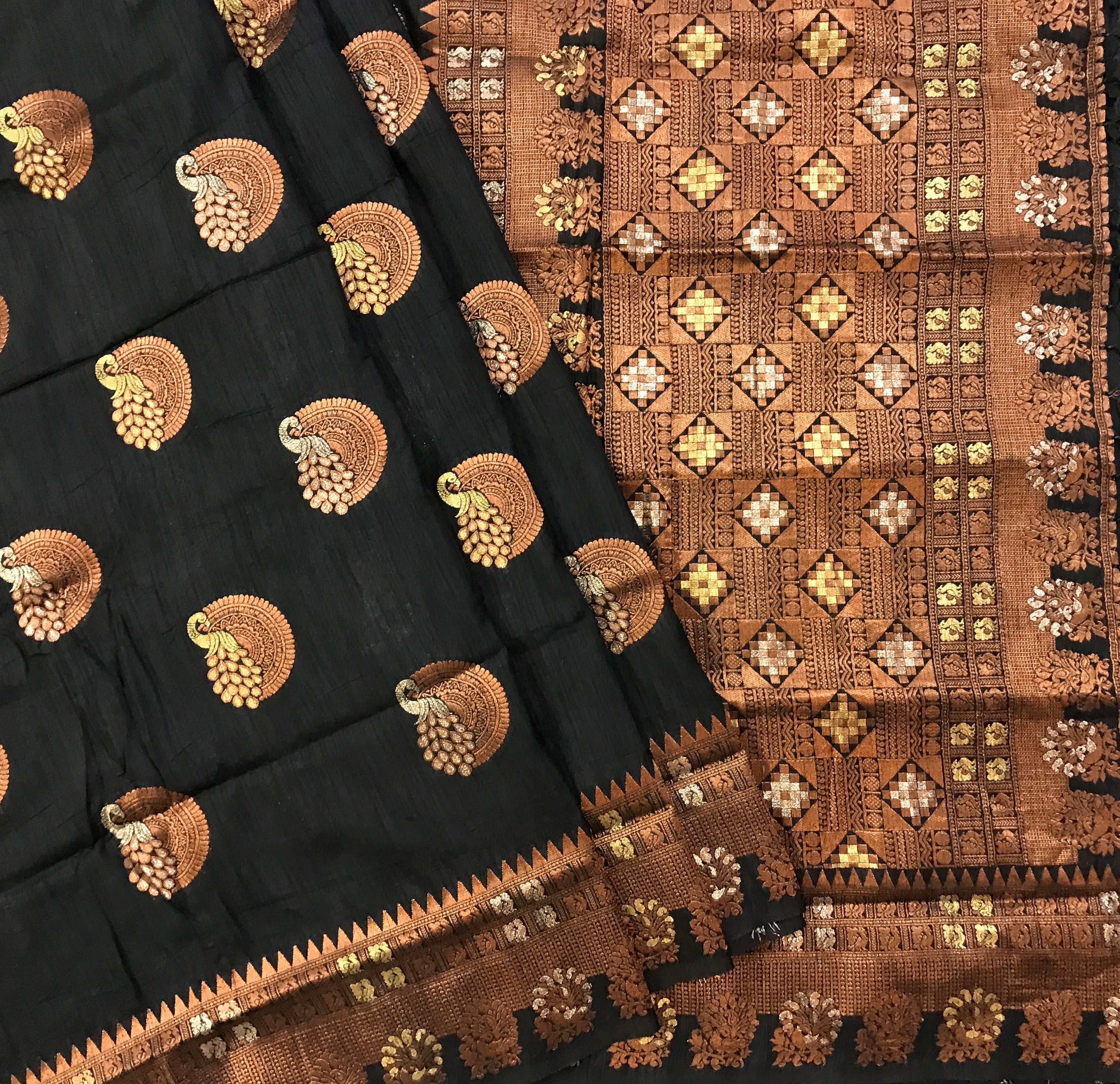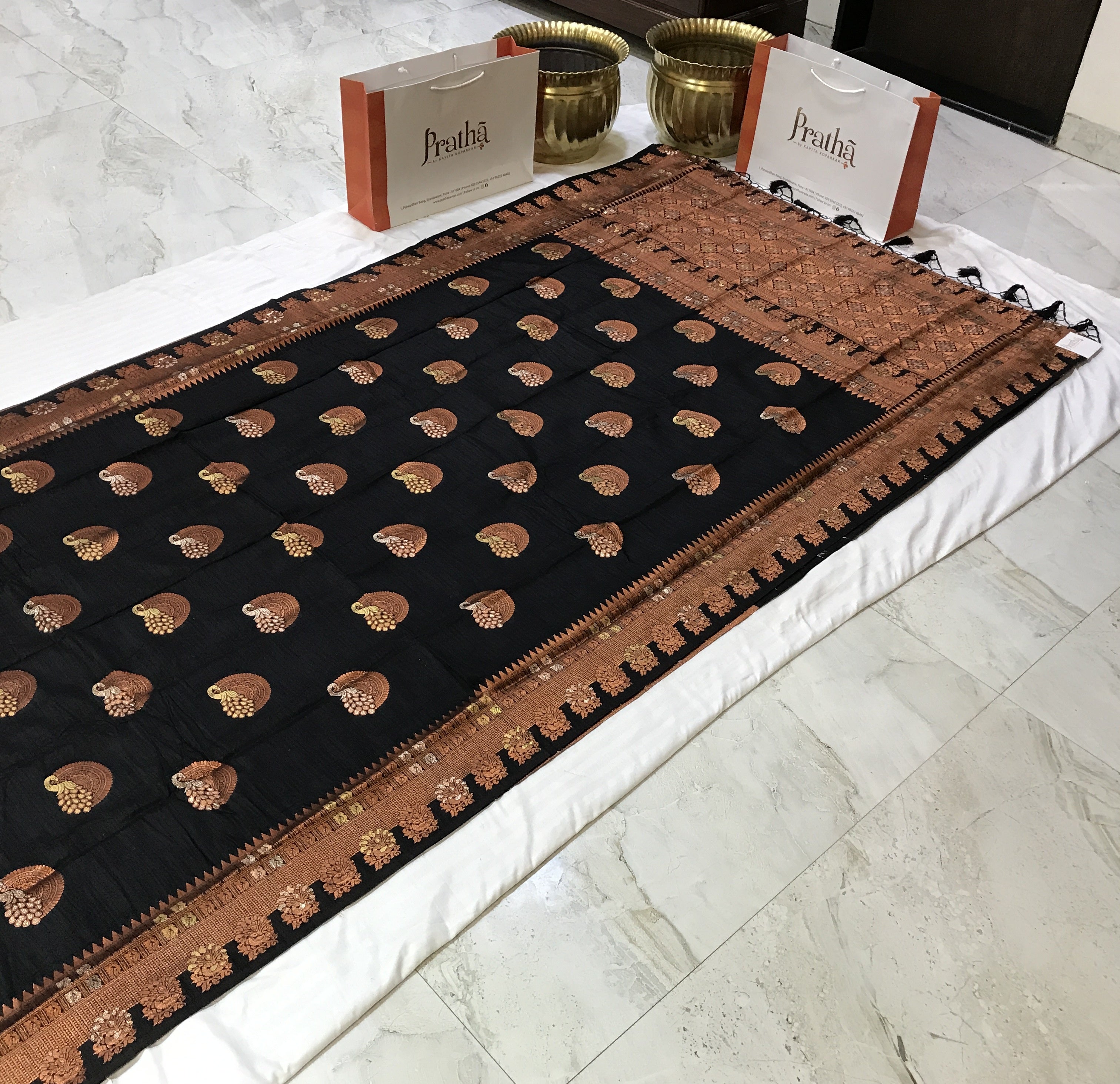A trendy silk saree in black coloured, soft at feel and easy to drape. Intricate and very beautiful peacock butti and copperish zari border, this saree type is one of Pratha's fastest selling ones! Adorn these lovely dola silk sarees at any special occasion and look your best! These sarees make for perfect gifts for your loved ones.