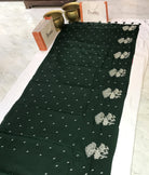 A very beautiful green saree with delicate woven buttis all over the body looks extremely classy and elegant. The lower edge of the saree is adorned with intricate motifs in shimmering zari, adding a rich traditional touch. Be it a casual outing, festive celebration or a small function, this saree will make you look effortlessly graceful.