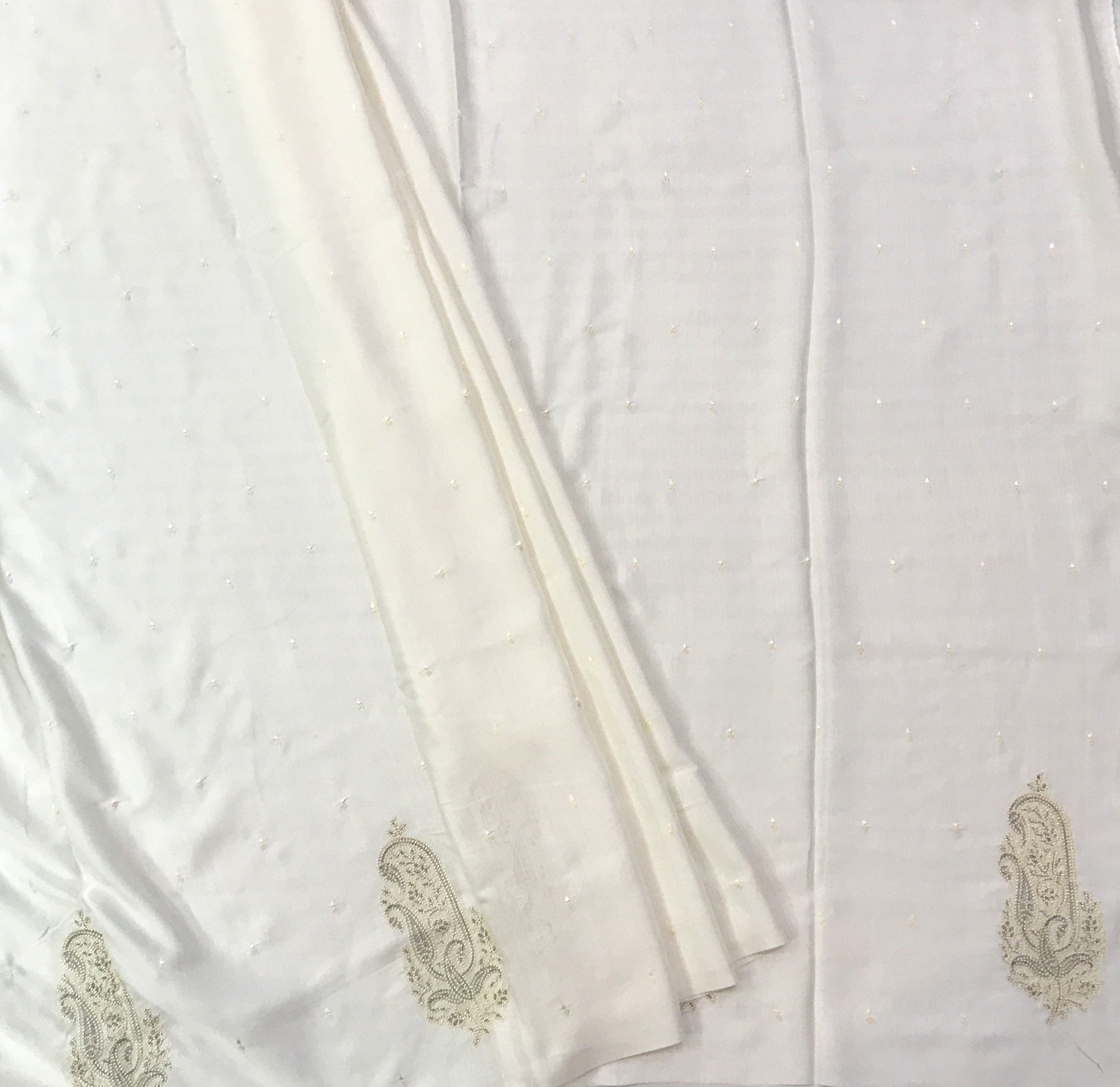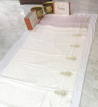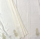 A very beautiful white saree with delicate woven buttis all over the body looks extremely classy and elegant. The lower edge of the saree is adorned with intricate motifs in shimmering zari, adding a rich traditional touch. Be it a casual outing, festive celebration or a small function, this saree will make you look effortlessly graceful.
