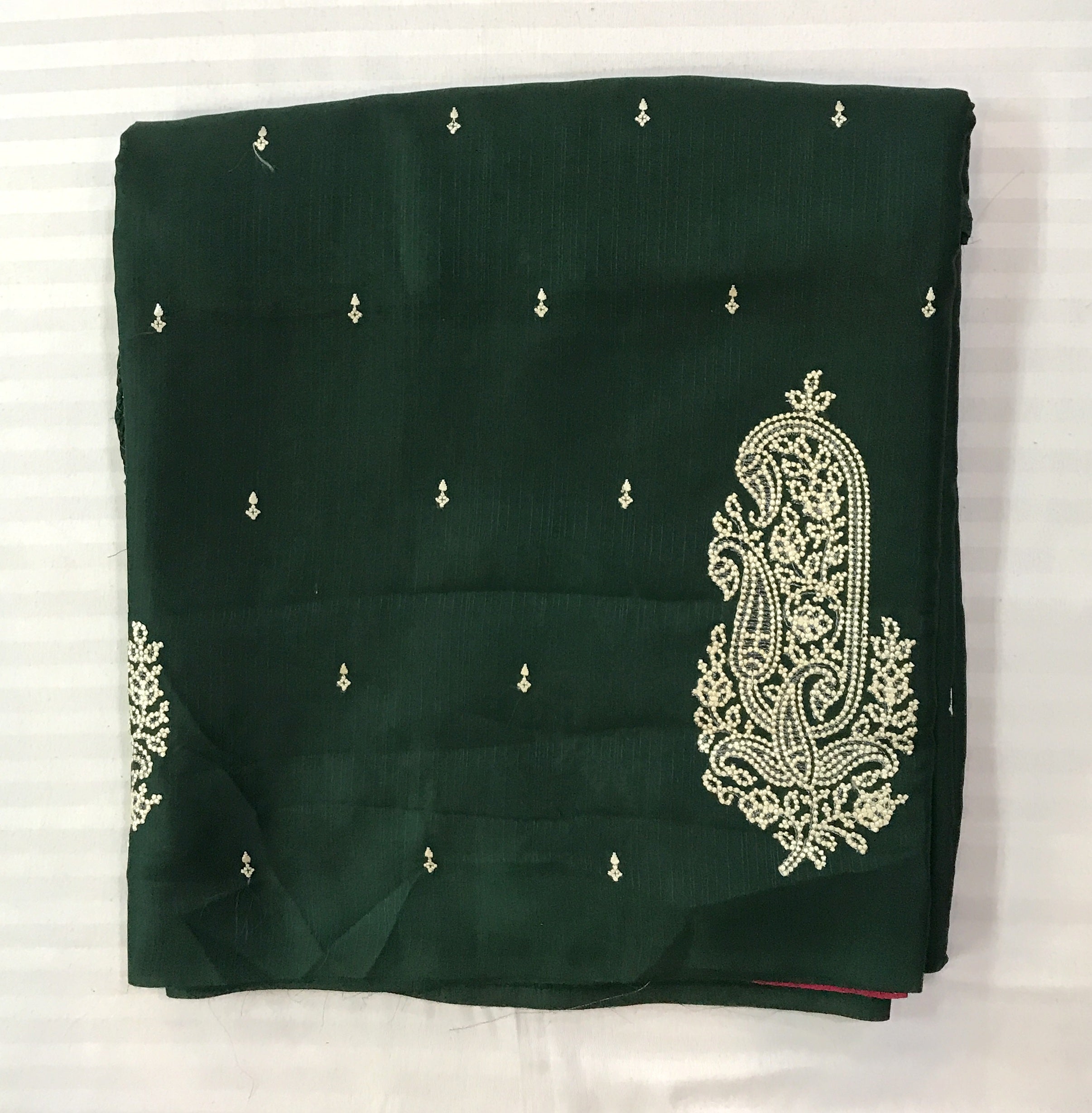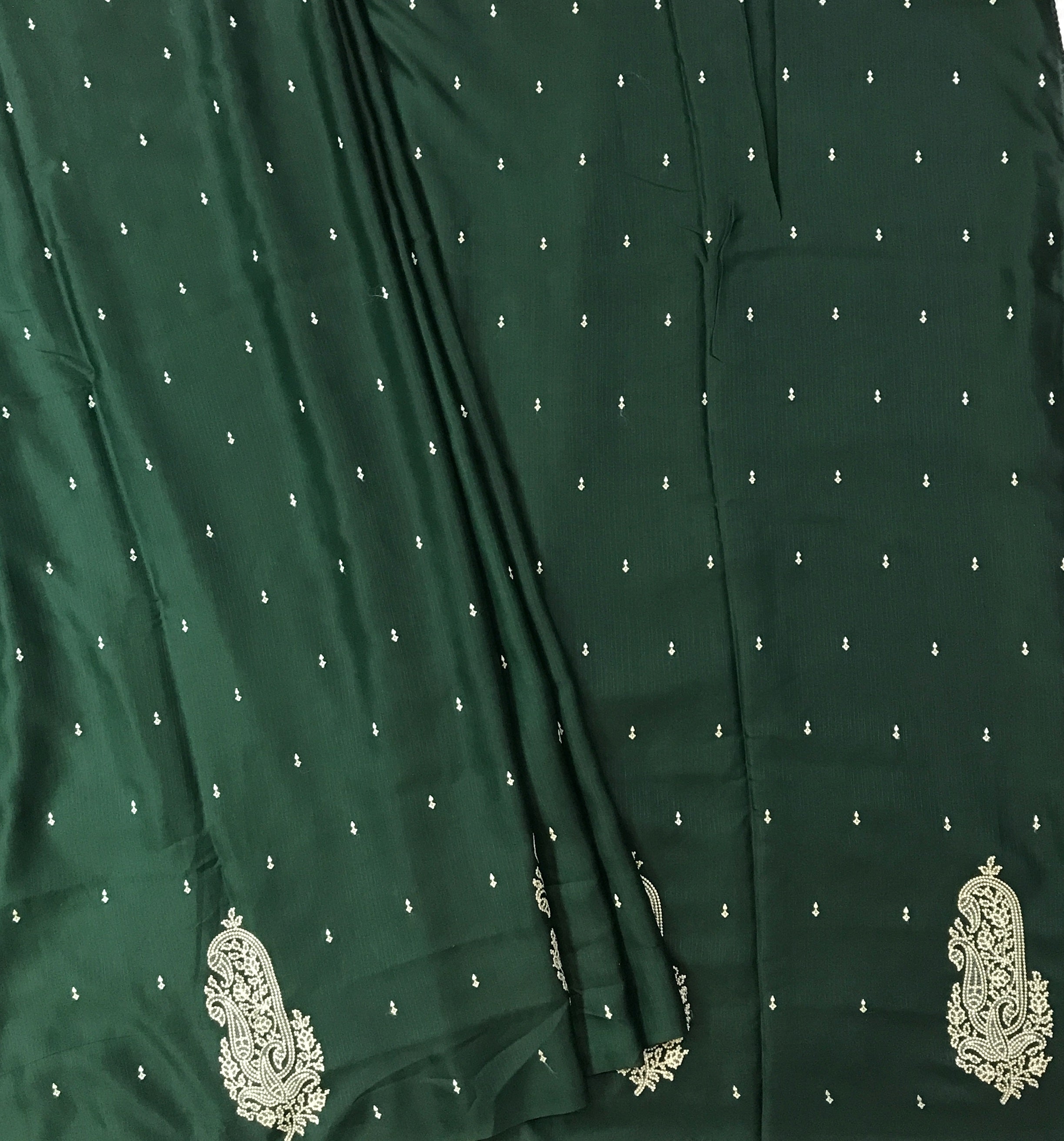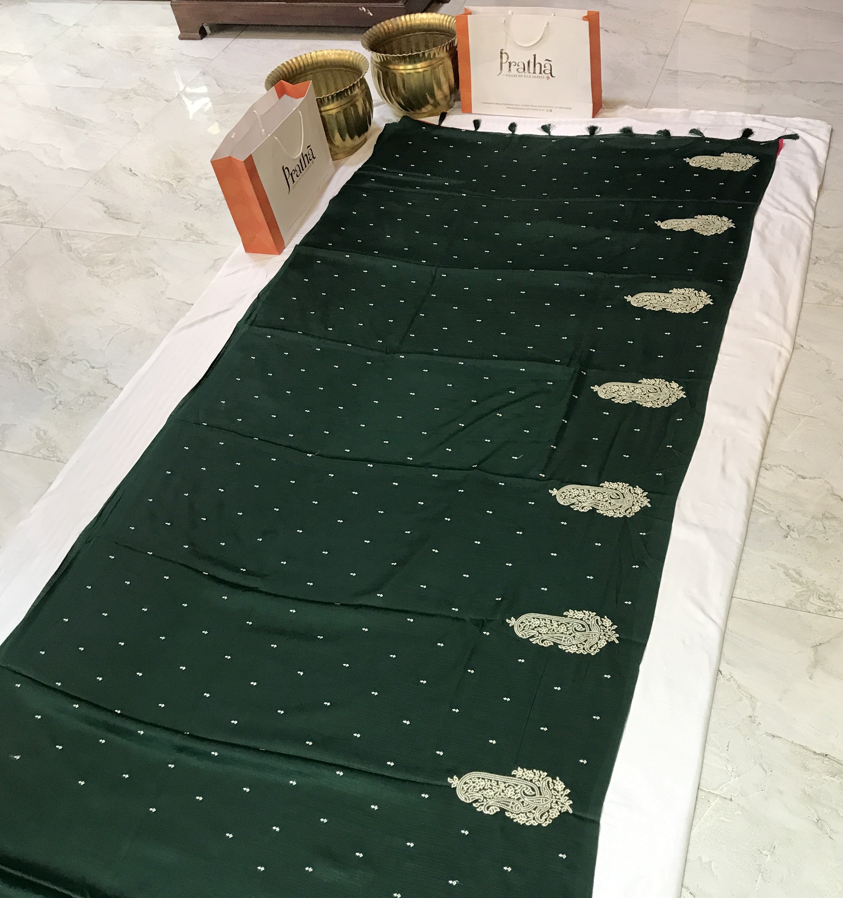 A very beautiful green saree with delicate woven buttis all over the body looks extremely classy and elegant. The lower edge of the saree is adorned with intricate motifs in shimmering zari, adding a rich traditional touch. Be it a casual outing, festive celebration or a small function, this saree will make you look effortlessly graceful.