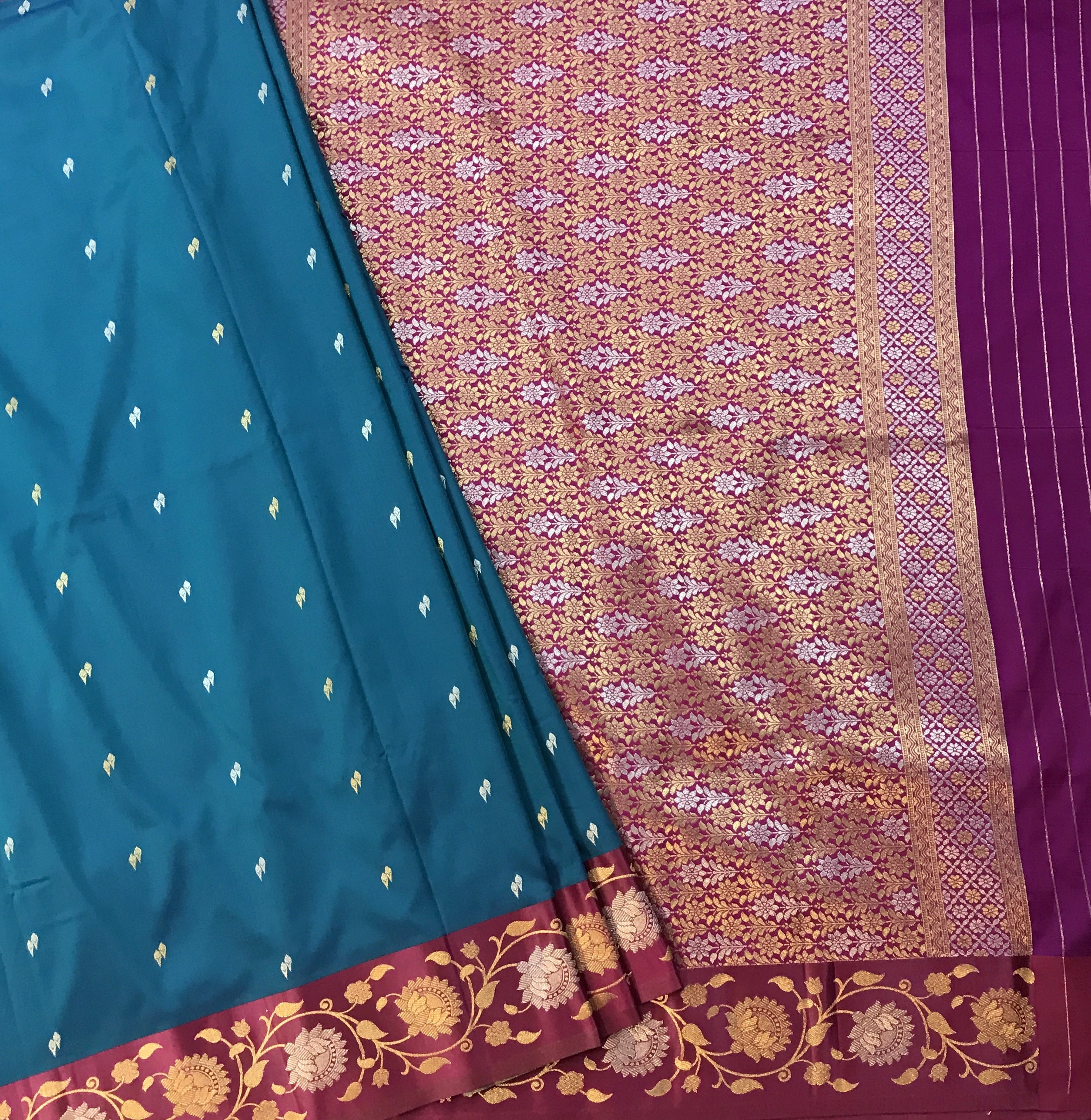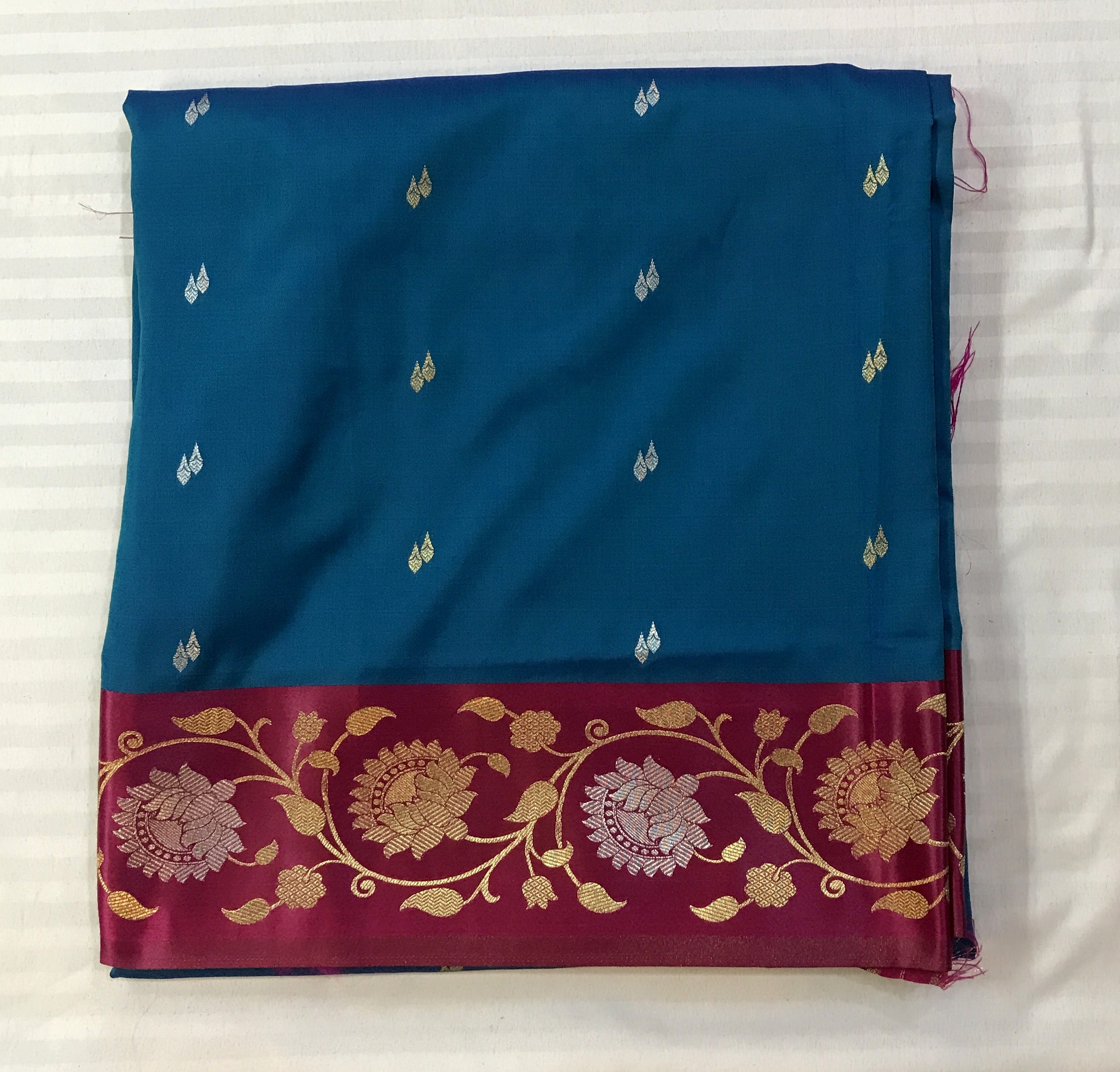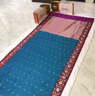 Bold and stylish, this beautiful blend of blue and magenta malai silk saree features eye-catching, uniquely shaped buttis spread across the body. Paired with a designer border, it blends traditional charm with a modern twist, perfect for standout festive looks.