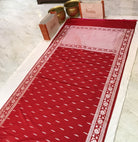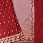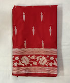 Bold and stylish, this Red Malai silk saree features eye-catching, uniquely shaped buttis spread across the body. Paired with a designer border, it blends traditional charm with a modern twist—perfect for standout festive looks.