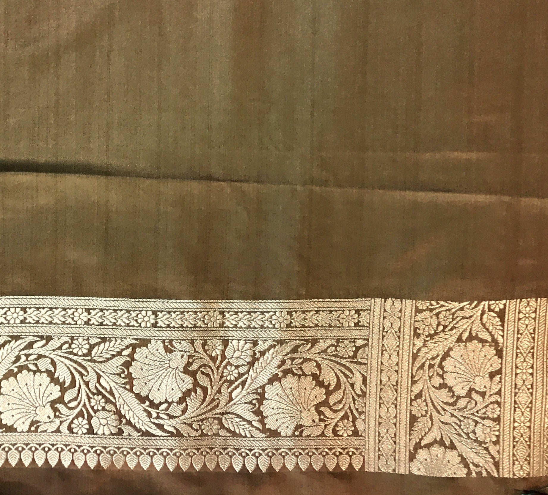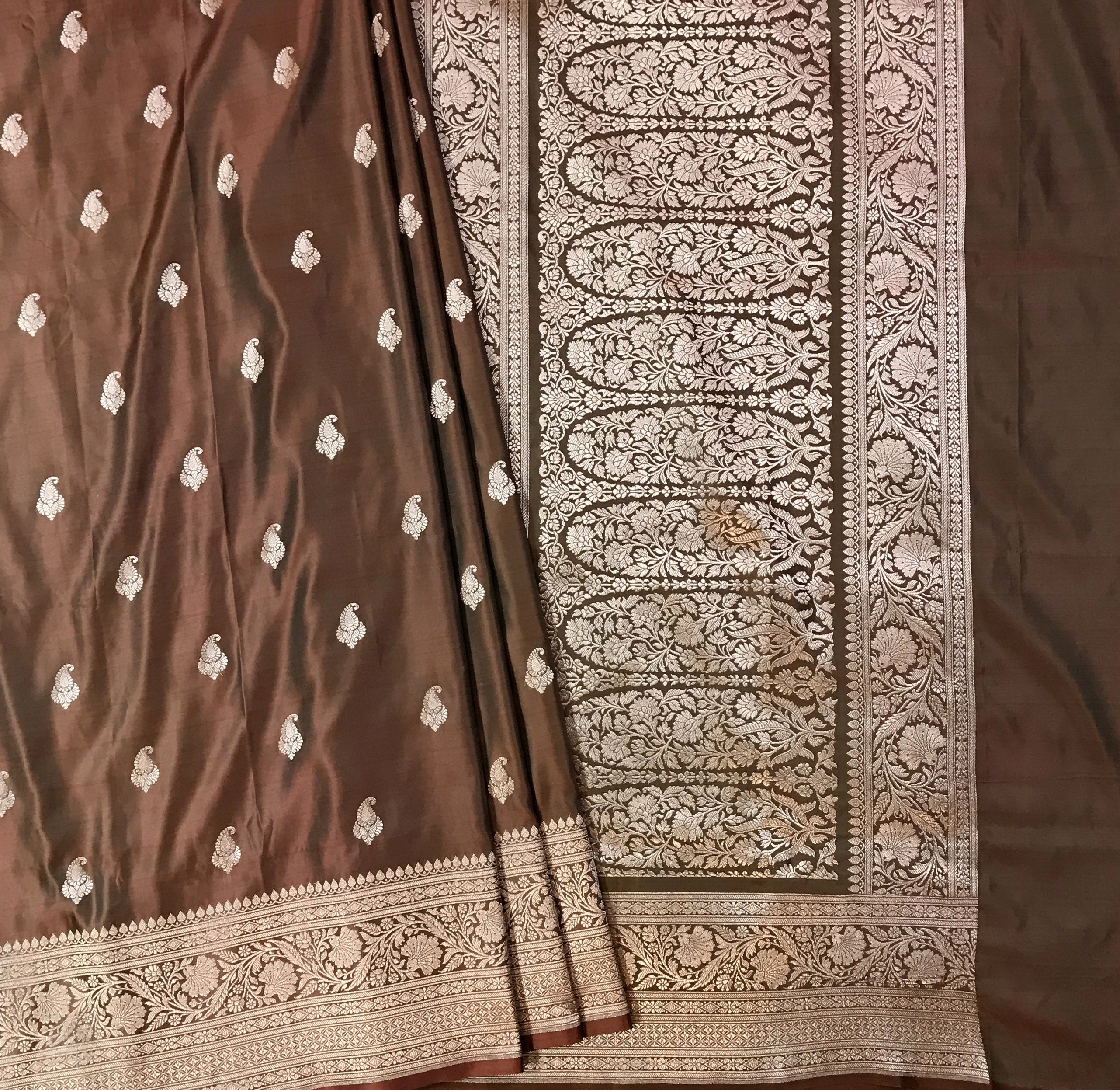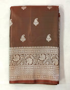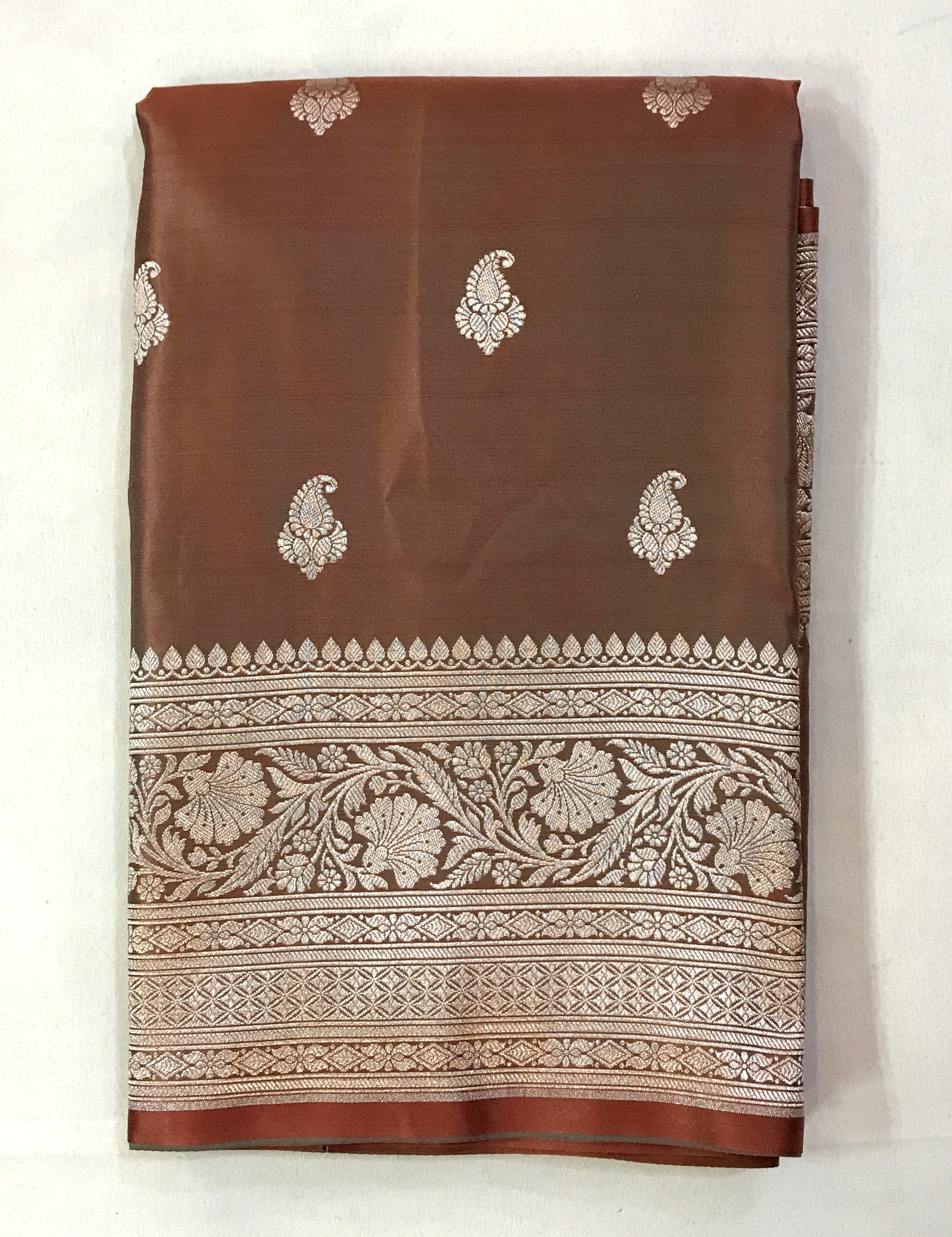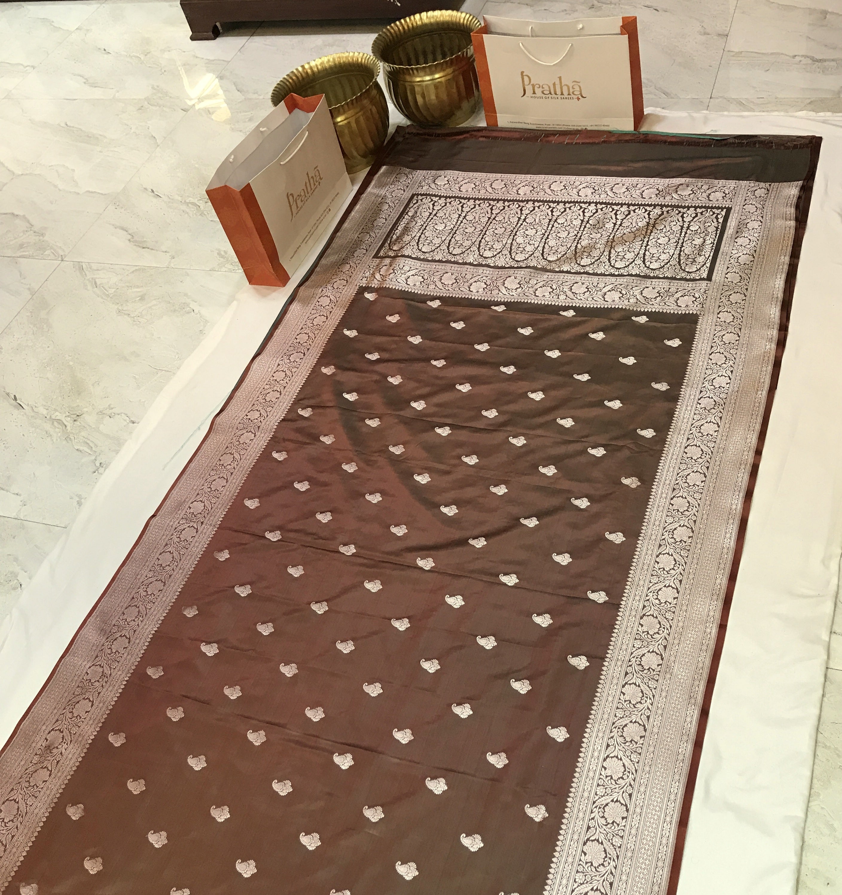 A trendy silk saree in brown coloured, soft at feel and easy to drape. Delicate koyari shaped butta and delicate zari border, this saree type is one of Pratha's fastest selling ones! Adorn these lovely malai silk sarees at any special occasion and look your best! These sarees make for perfect gifts for your loved ones.