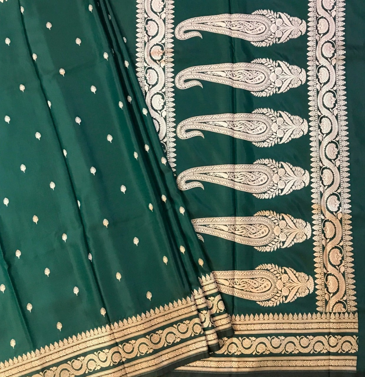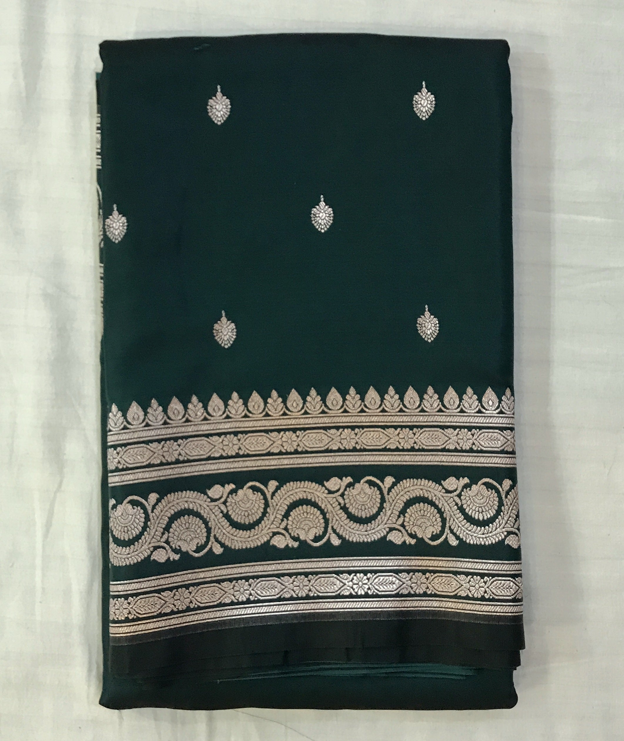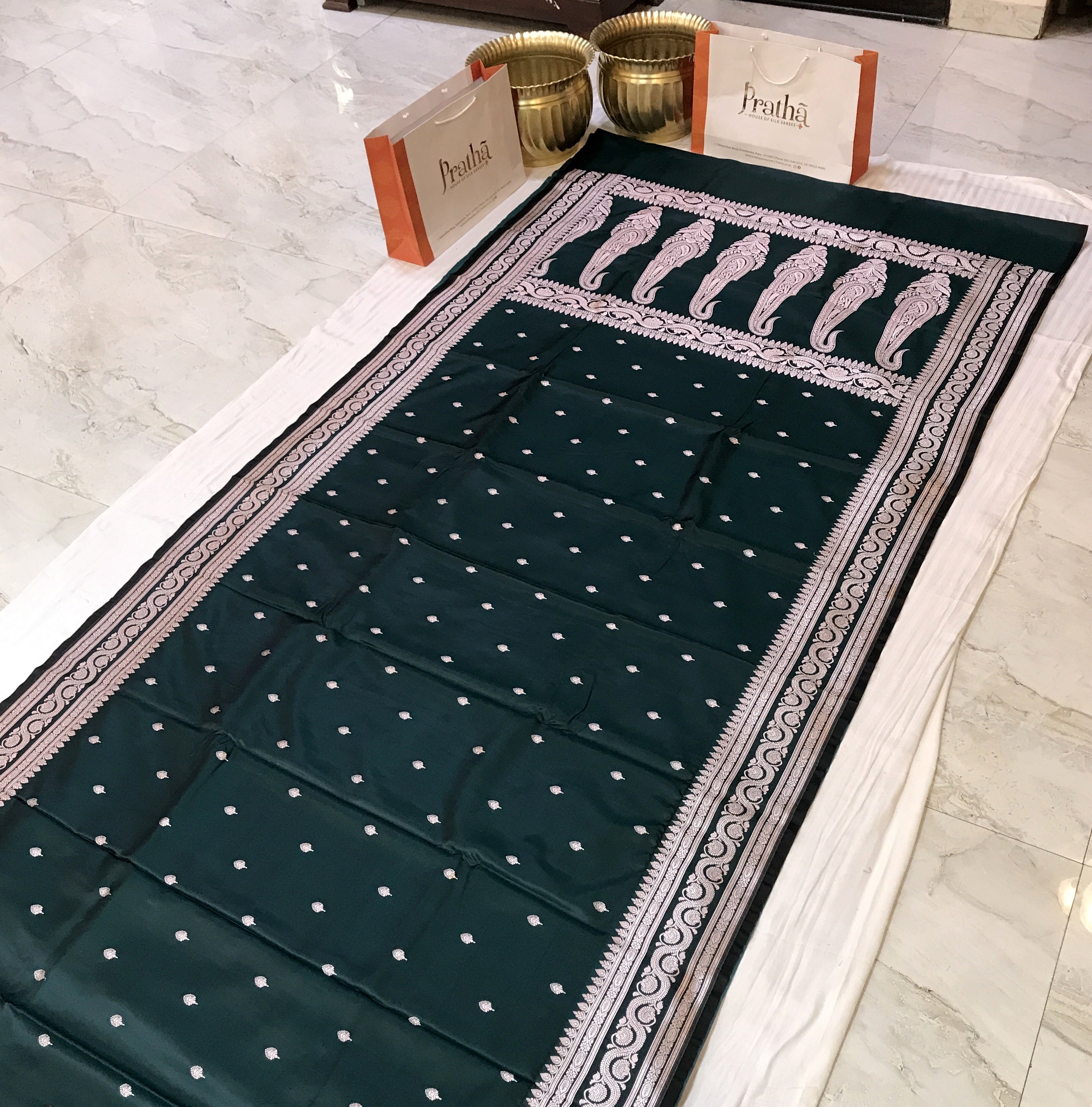 A trendy silk saree in green coloured, soft at feel and easy to drape. Delicate leaf shaped butta and delicate zari border, this saree type is one of Pratha's fastest selling ones! Adorn these lovely malai silk sarees at any special occasion and look your best! These sarees make for perfect gifts for your loved ones.