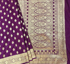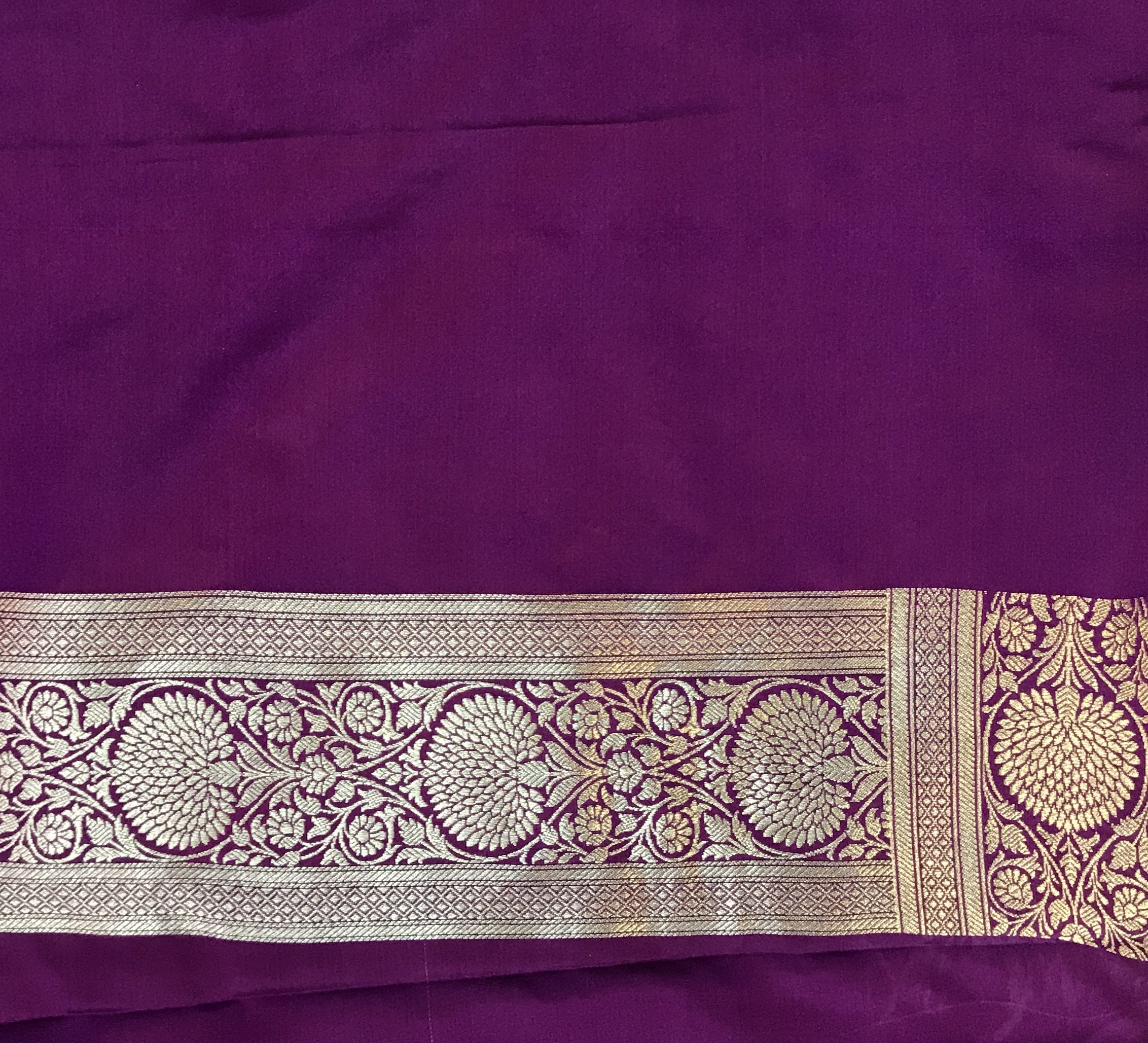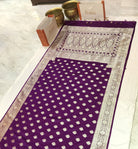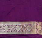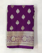 Stylish and timeless, this purple silk saree is adorned with leaf motifs that bring a bold, artistic flair. The look is elevated by a beautifully crafted intricate border, making it a perfect pick for celebrations and special events.