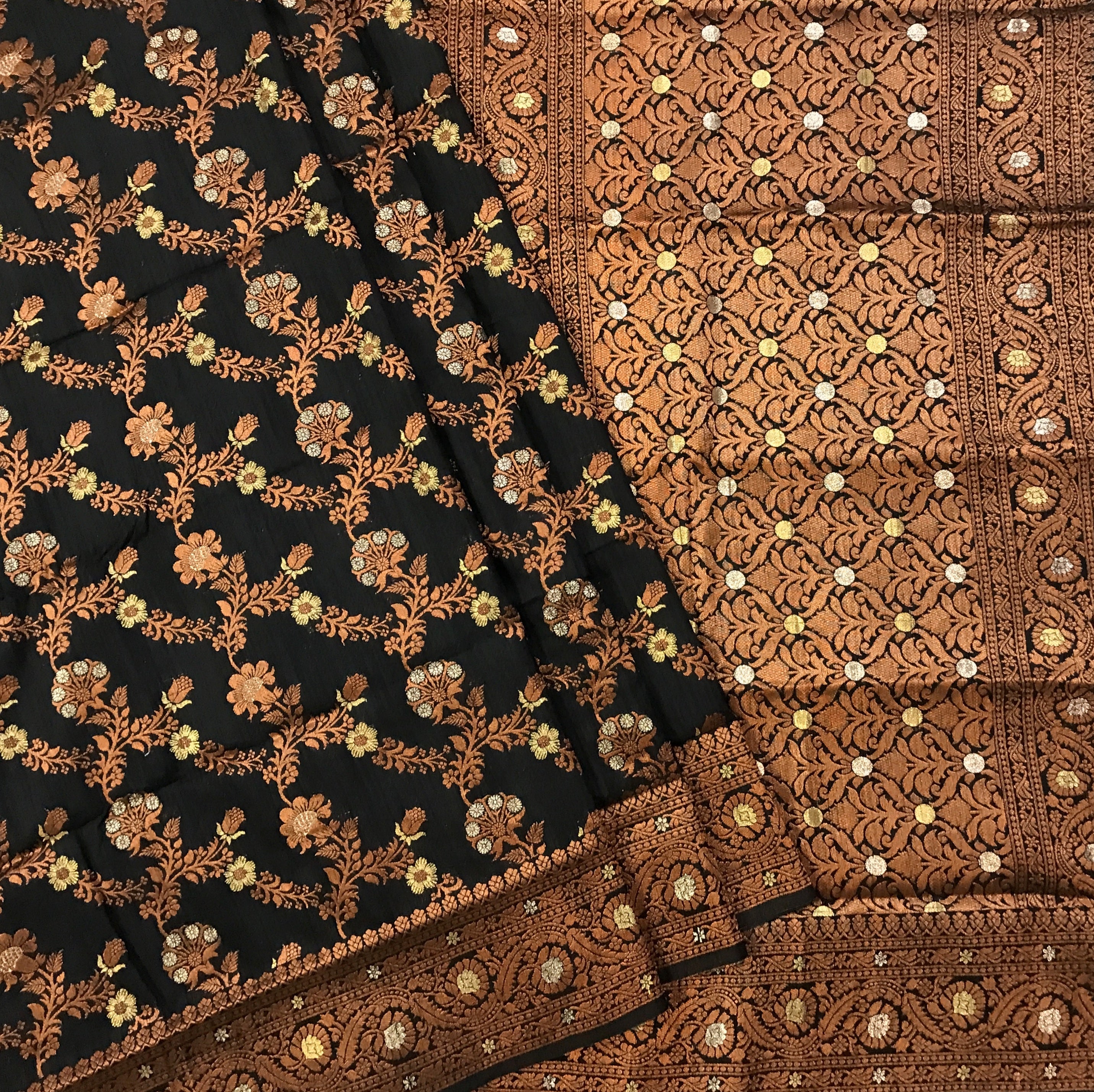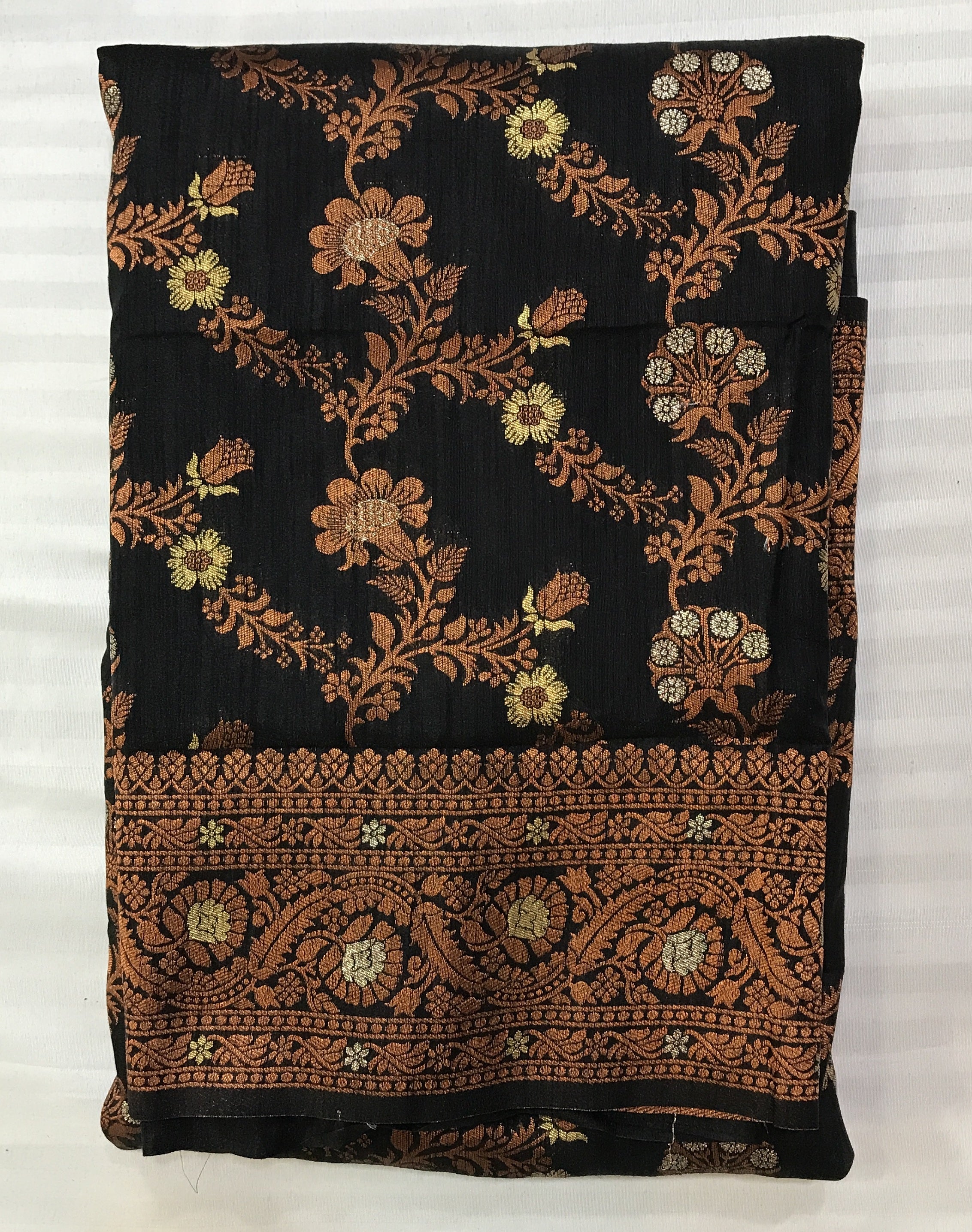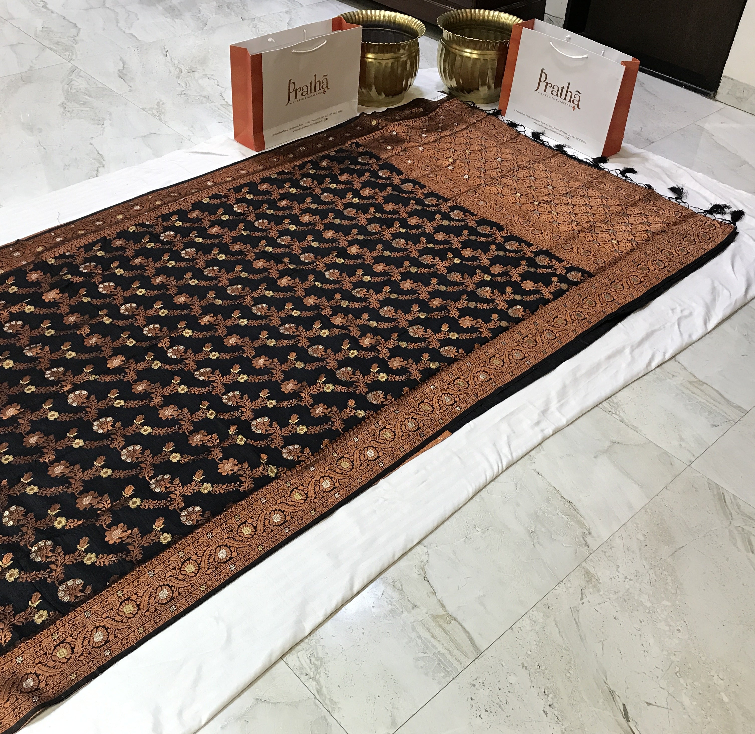 A trendy silk saree in black coloured, soft at feel and easy to drape. Intricate brocade design and delicate border, this saree type is one of Pratha's fastest selling ones! Adorn these lovely dola silk sarees at any special occasion and look your best! These sarees make for perfect gifts for your loved ones.