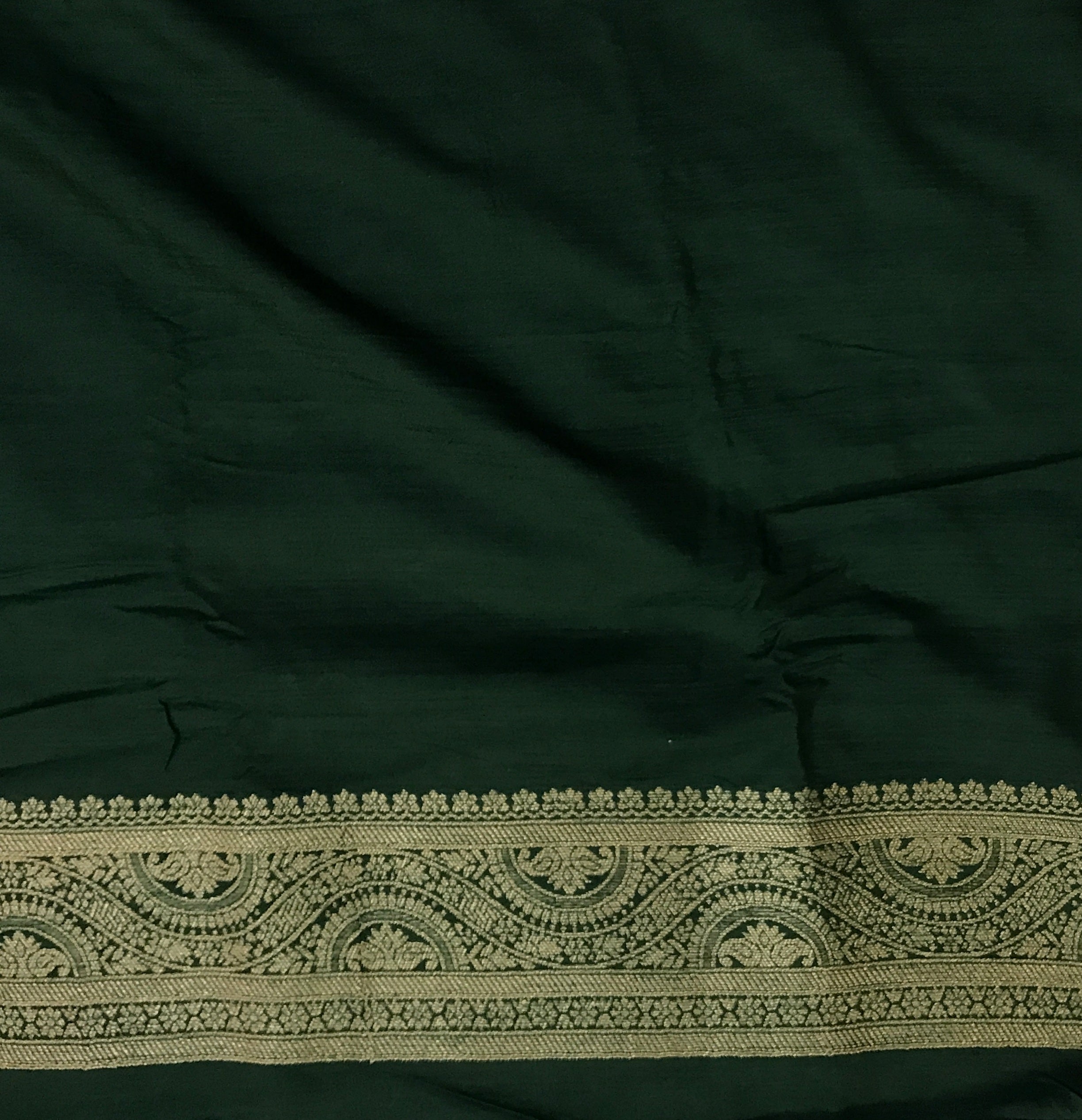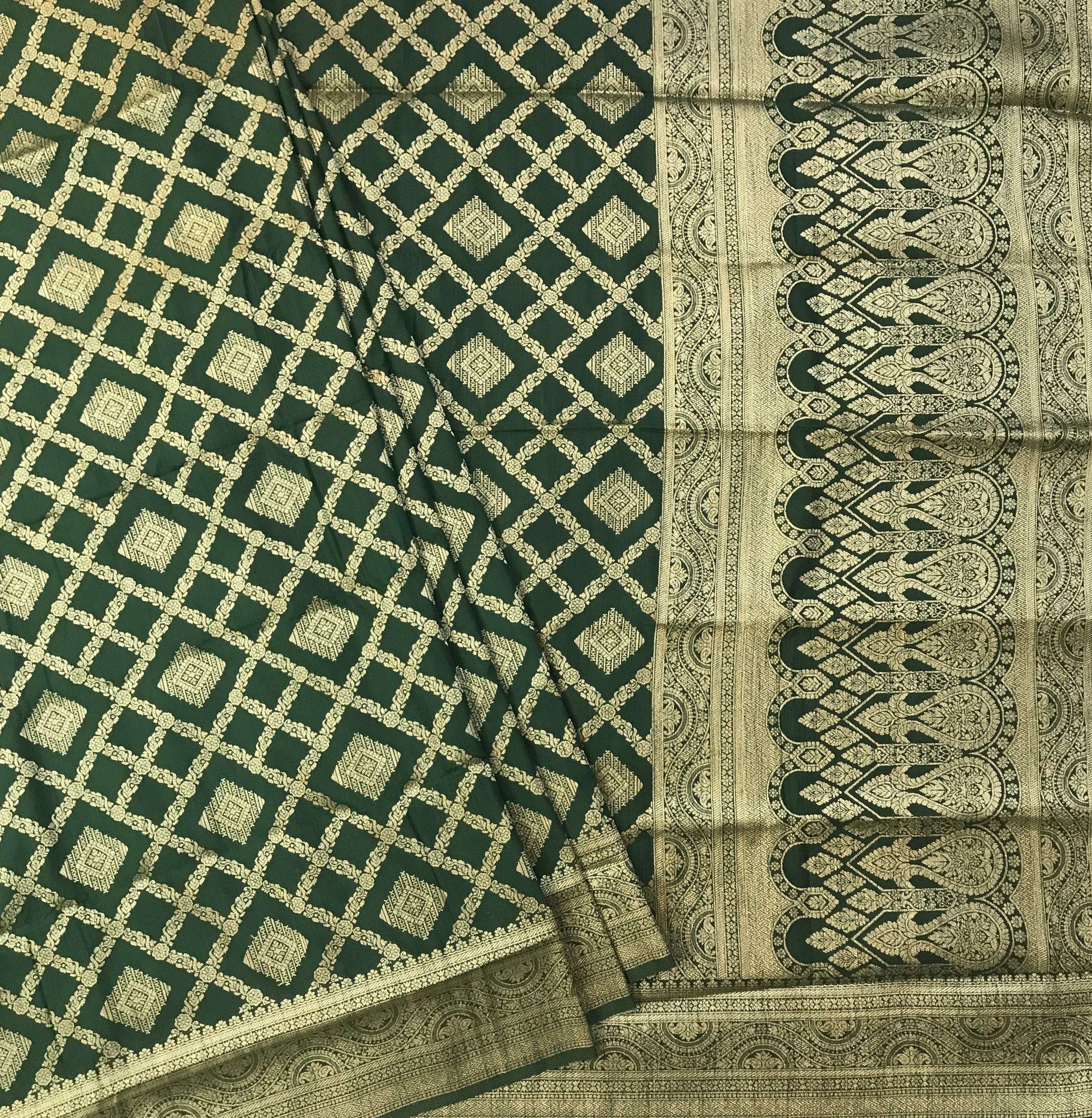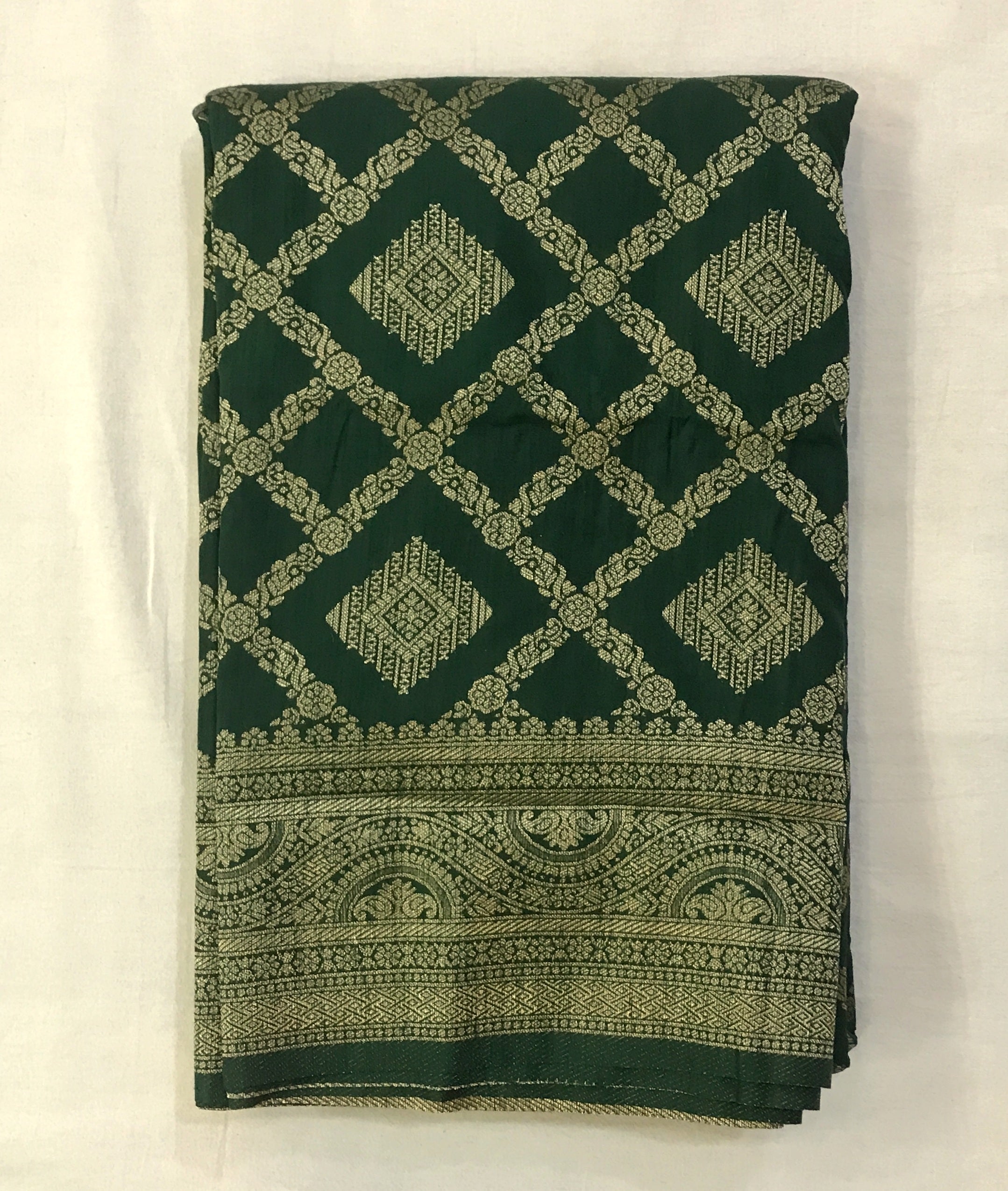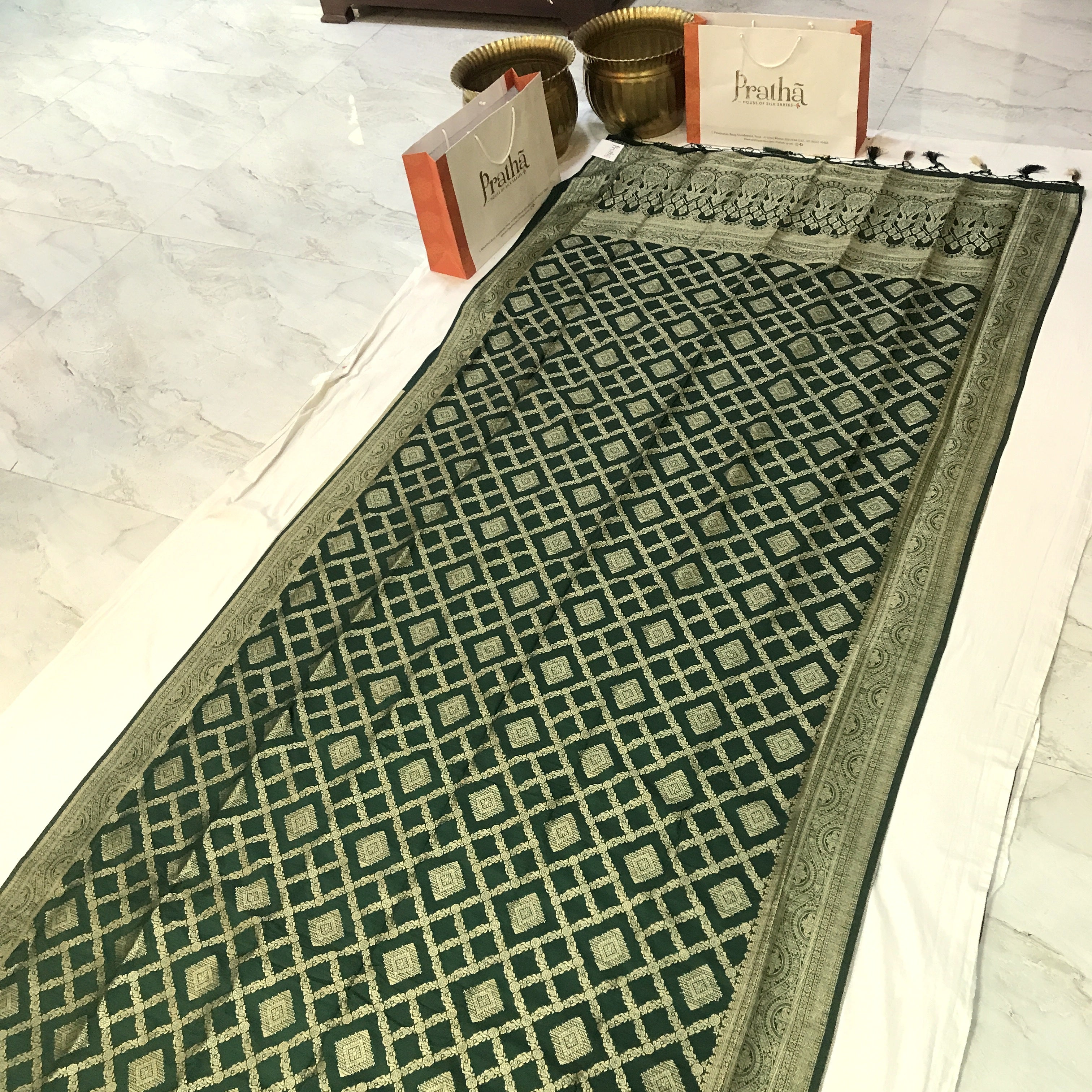 A trendy silk saree in dark green coloured, soft at feel and easy to drape. Intricate brocade design and delicate border, this saree type is one of Pratha's fastest selling ones! Adorn these lovely dola silk sarees at any special occasion and look your best! These sarees make for perfect gifts for your loved ones.