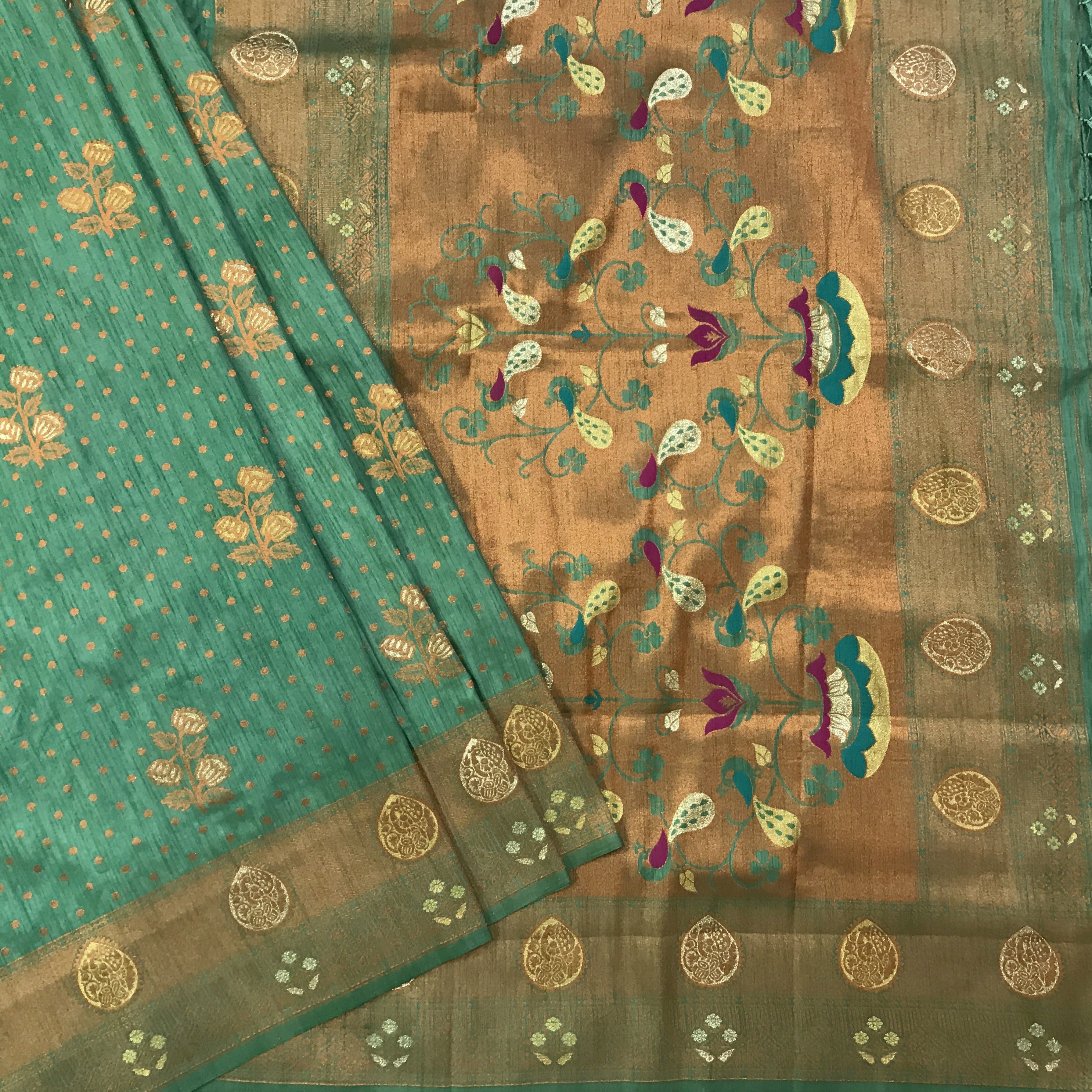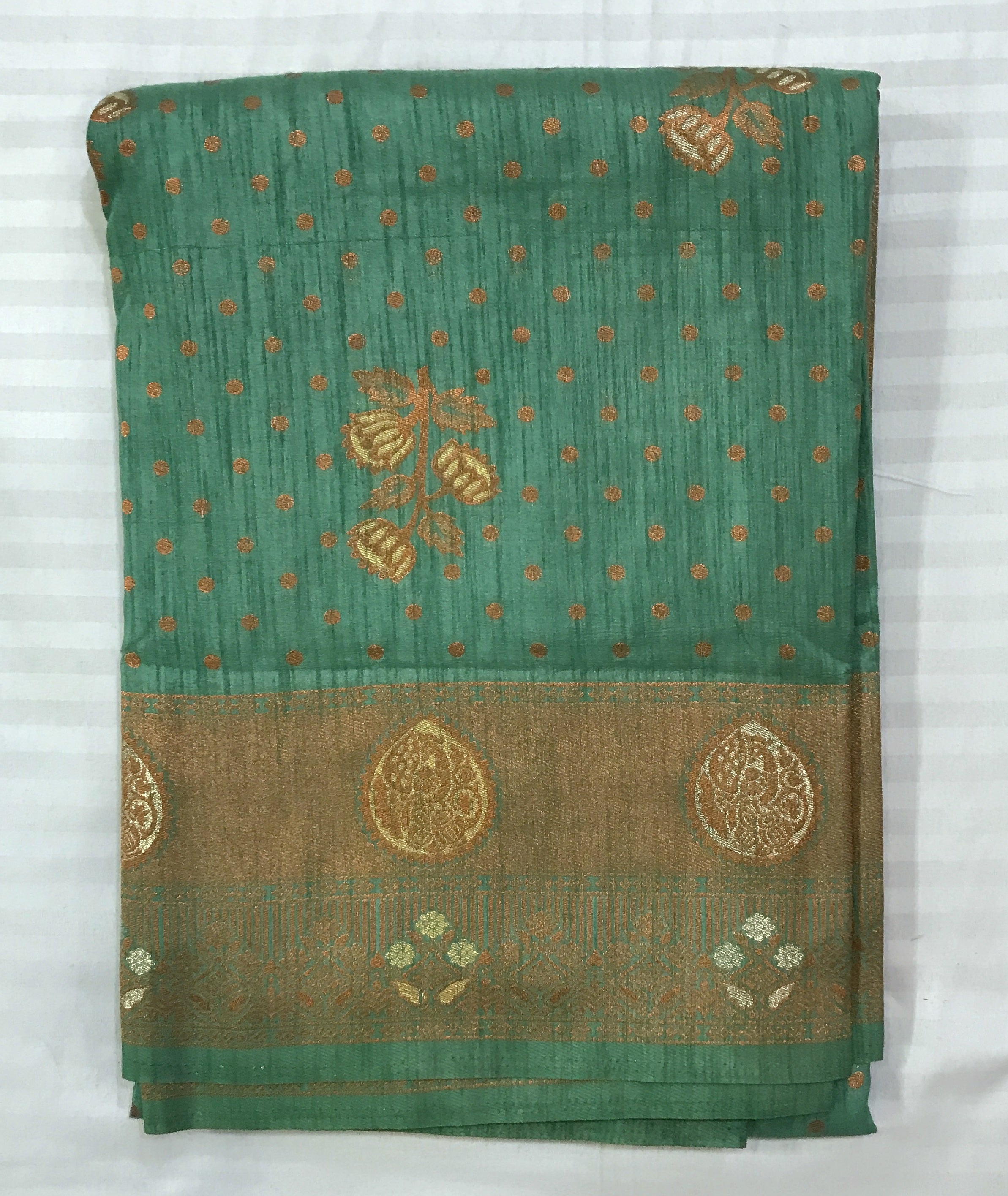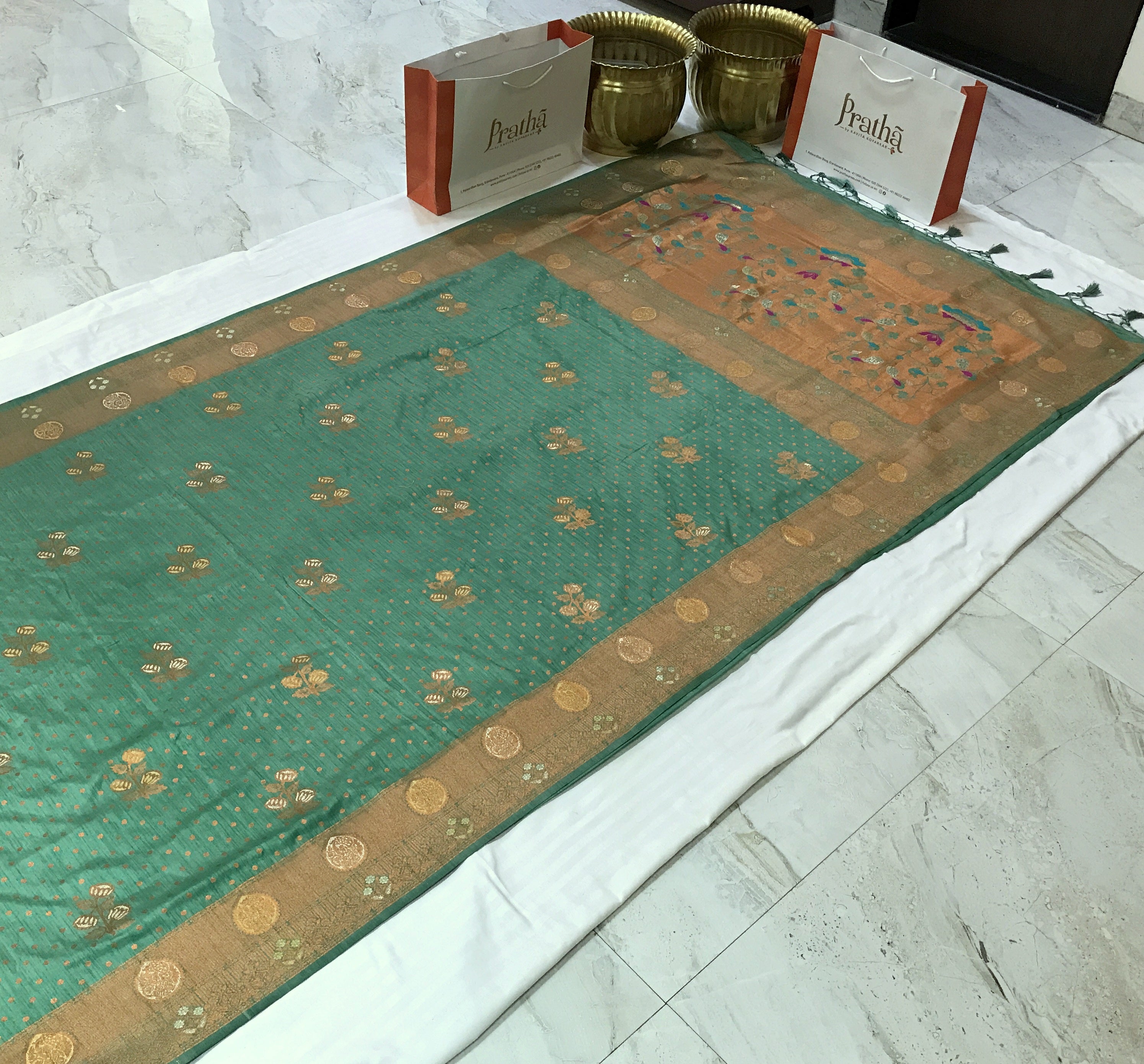 A trendy silk saree in sea green coloured, soft at feel and easy to drape. Intricate butta and delicate border, this saree type is one of Pratha's fastest selling ones! Adorn these lovely dola silk sarees at any special occasion and look your best! These sarees make for perfect gifts for your loved ones.