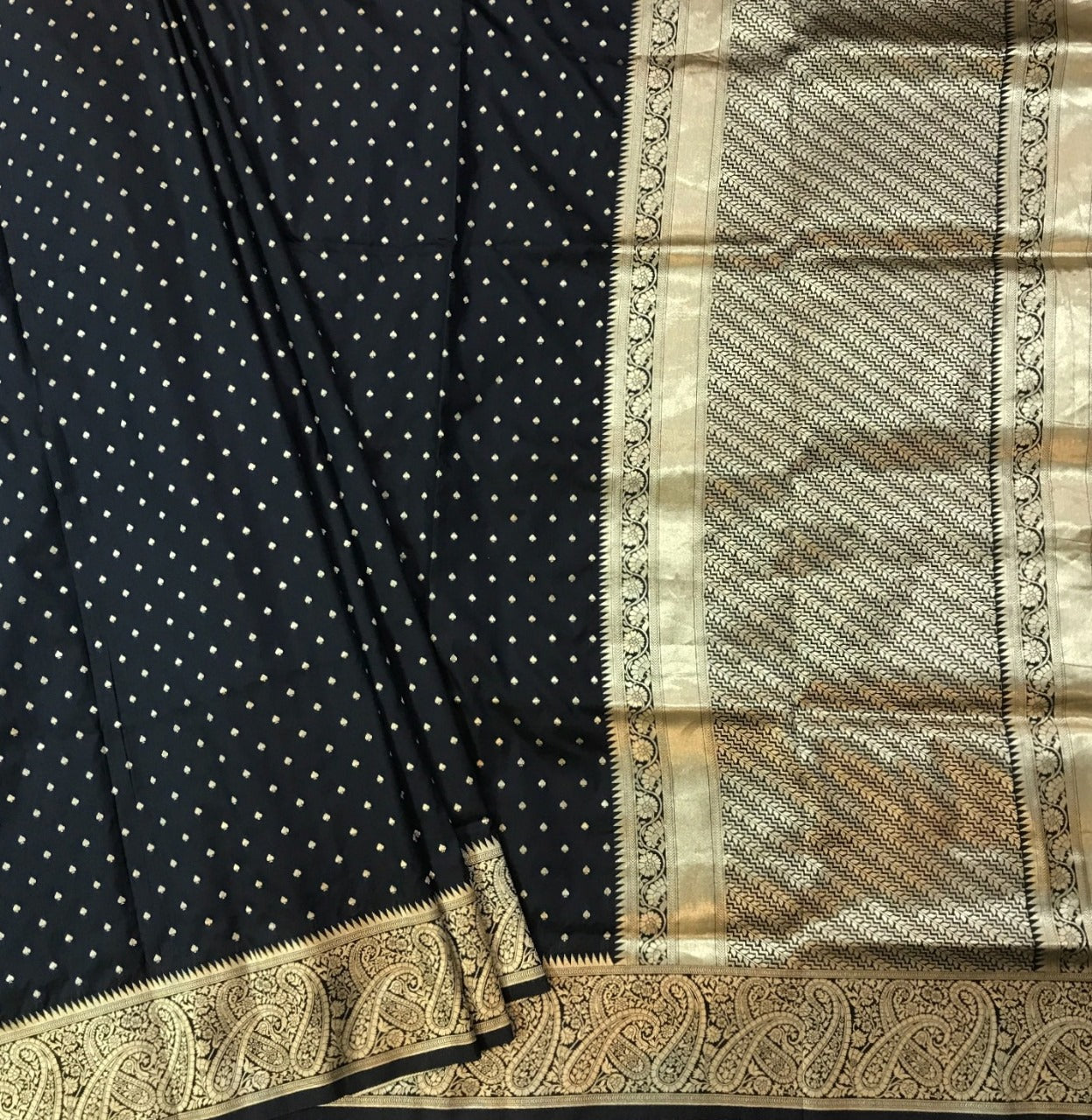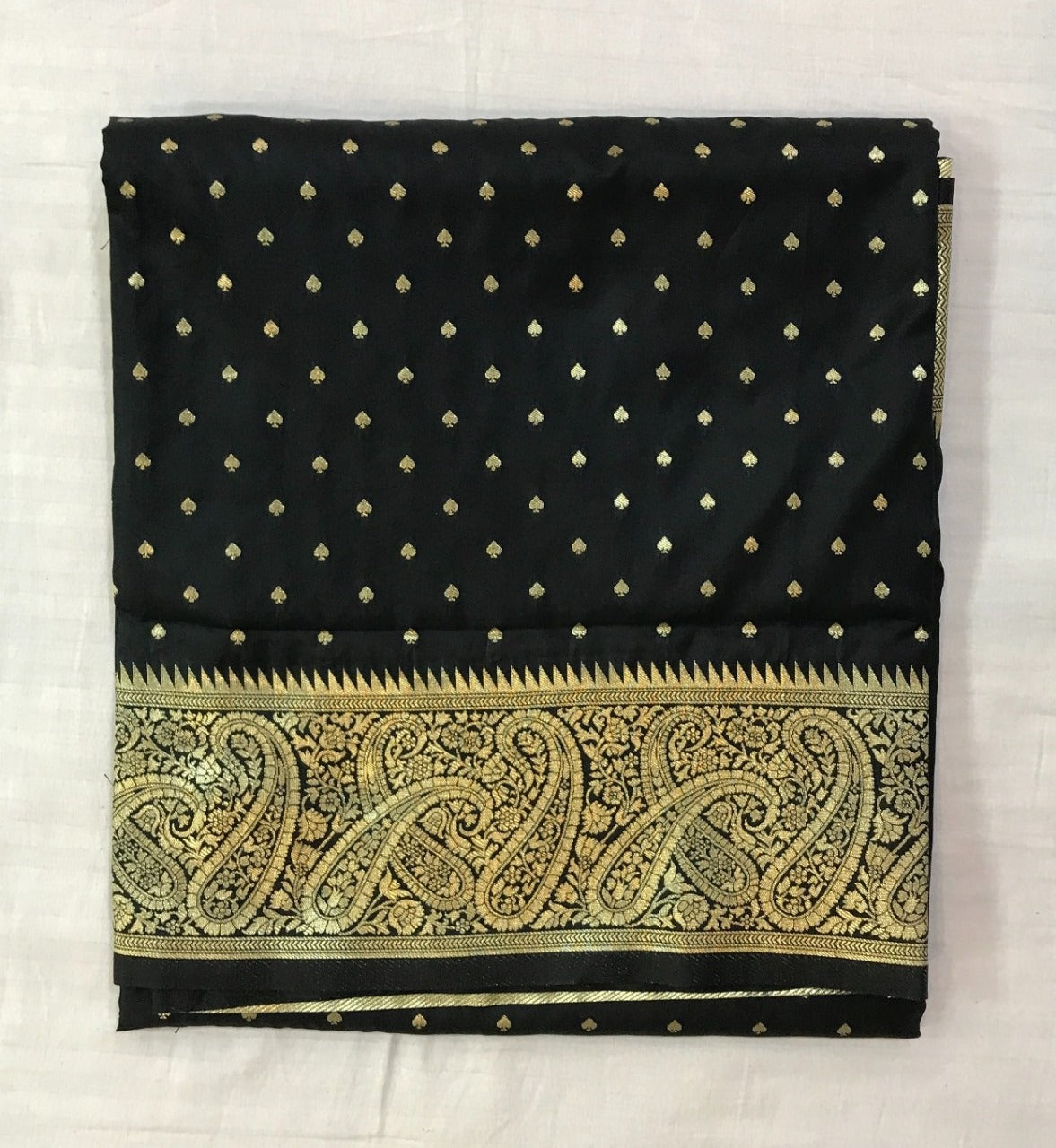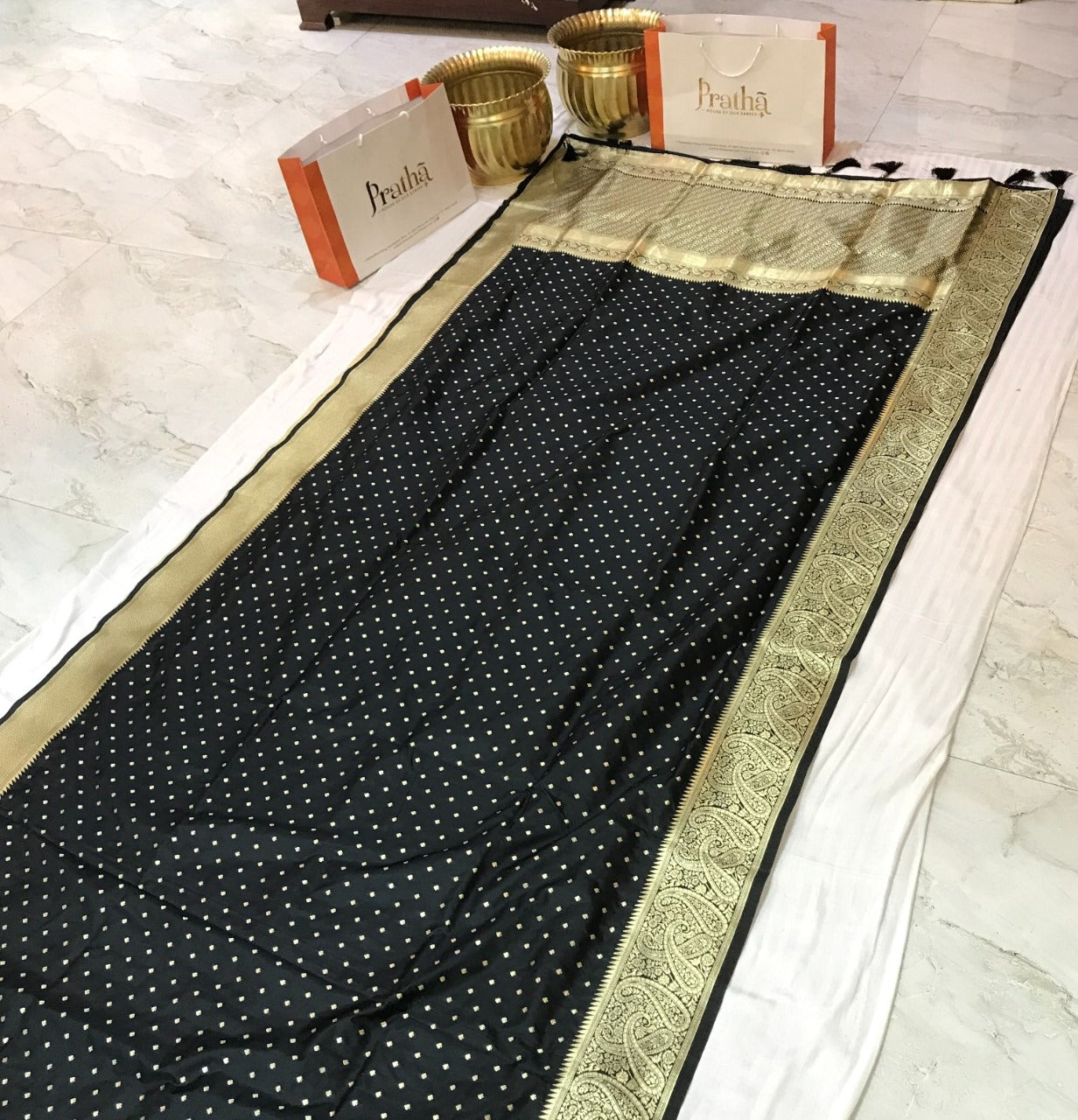 Modern elegance meets traditional charm in this black trendy silk saree. The body is adorned with beautifully woven spade-shaped butti motifs, giving it a bold and artistic appeal. A striking designer border adds contrast and sophistication, enhancing the overall richness of the drape. Crafted for those who appreciate unique detailing and graceful styling, this saree is perfect for festive gatherings, evening functions, or standout celebrations.