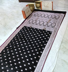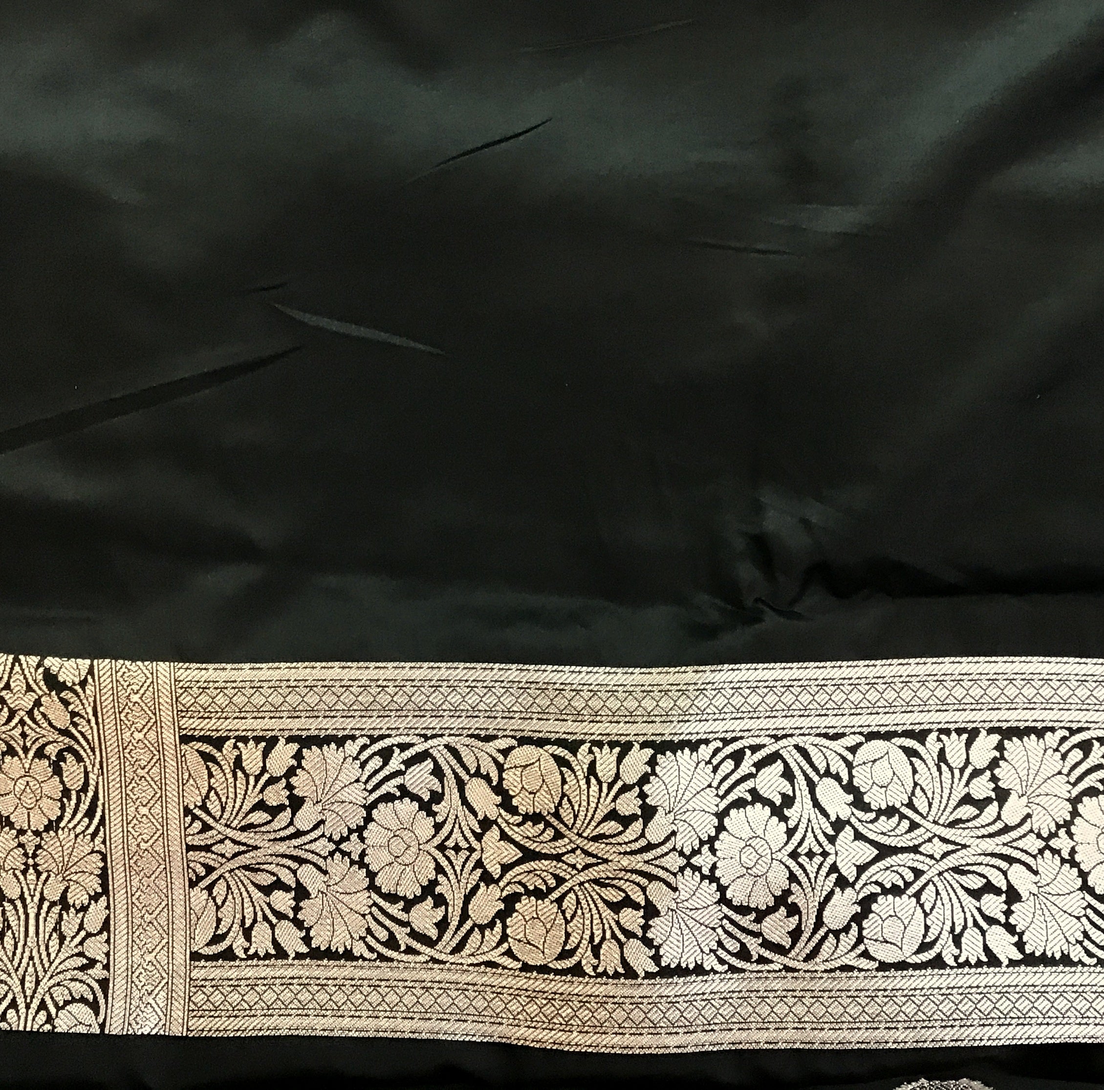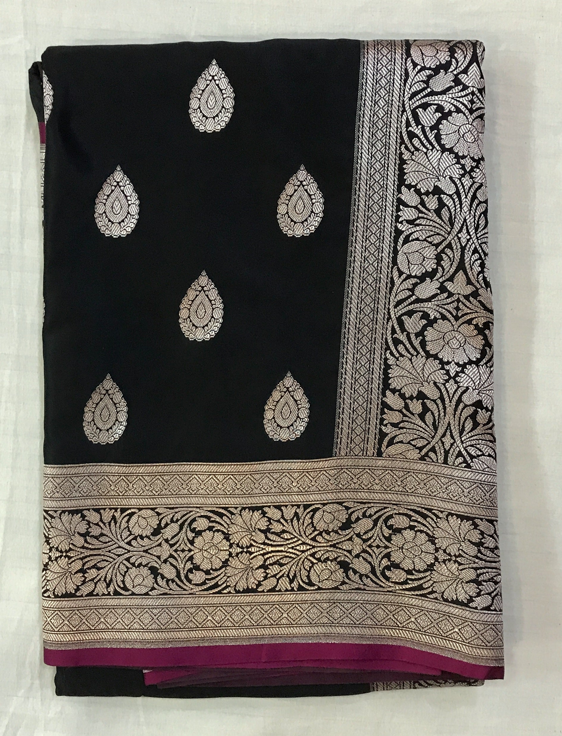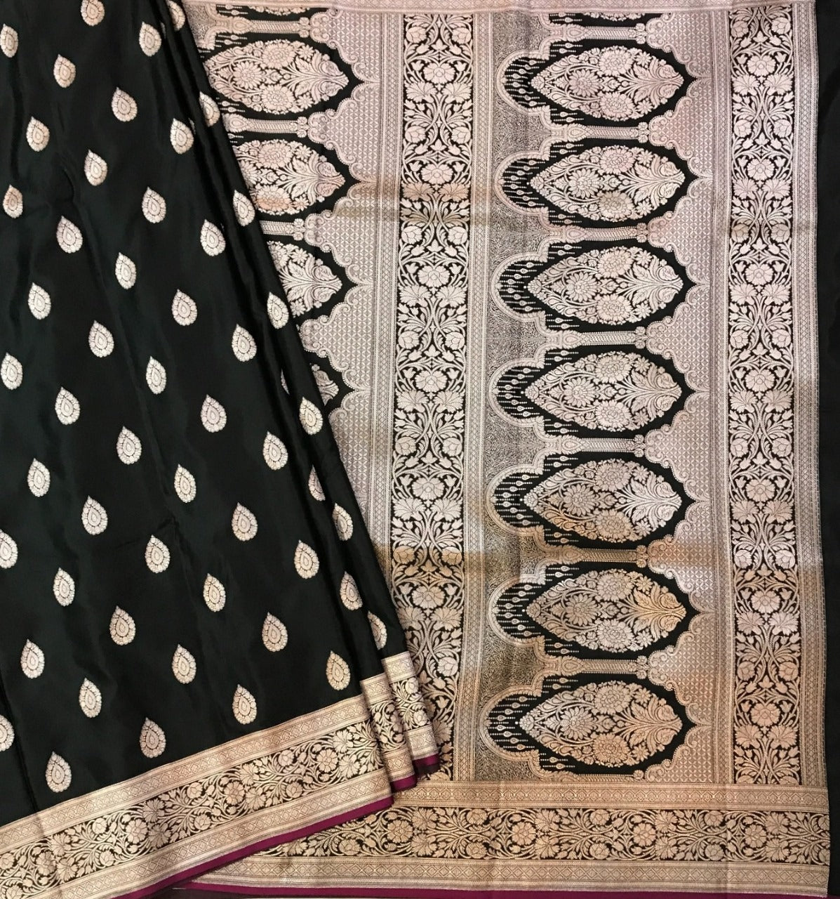 Stylish and timeless, this black silk saree is adorned with leaf motifs that bring a bold, artistic flair. The look is elevated by a beautifully crafted intricate border, making it a perfect pick for celebrations and special events.