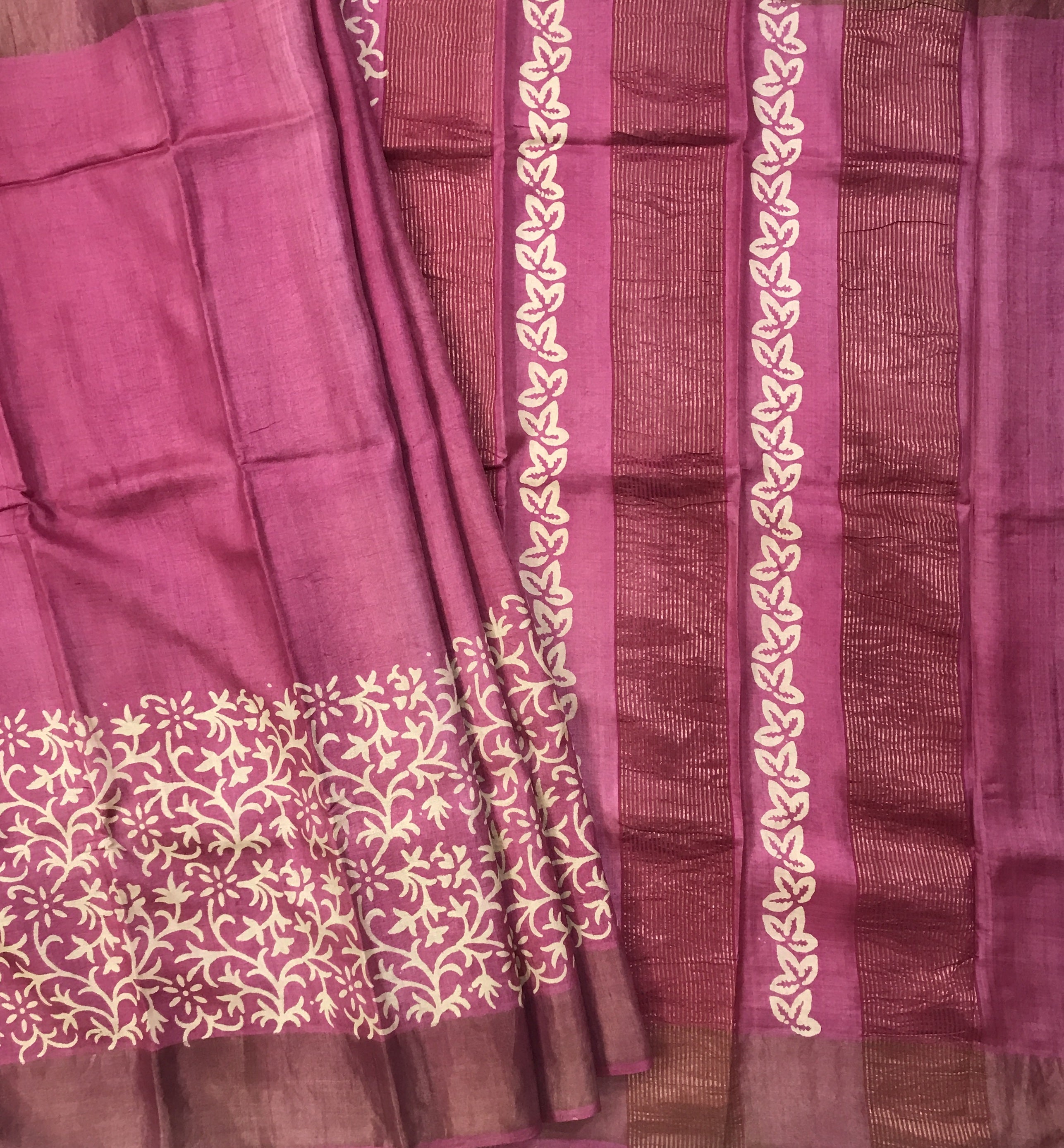 A very beautiful shade of pink saree with an equally fresh border , this tussar silk saree is a treat to the eyes! The lovely saree and the self coloured pallu add to the grace of this weave.