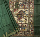 A mesmerizing green Dupion Tussar Silk Saree, adorned with an exquisite printed design in a harmonious blend of warm, makes this piece a timeless treasure. The saree showcases an artistic interplay of elephant and horse design on pallu, symbolizing grandeur and grace, seamlessly woven into its intricate design. The multi-colored printed pallu lends a contemporary charm, adding a quirky touch to the traditional aesthetic. Perfect for multiple occasions—be it a casual friends' meet, a brunch, an office meeting, or an evening party—this saree exudes sophistication and charm effortlessly.