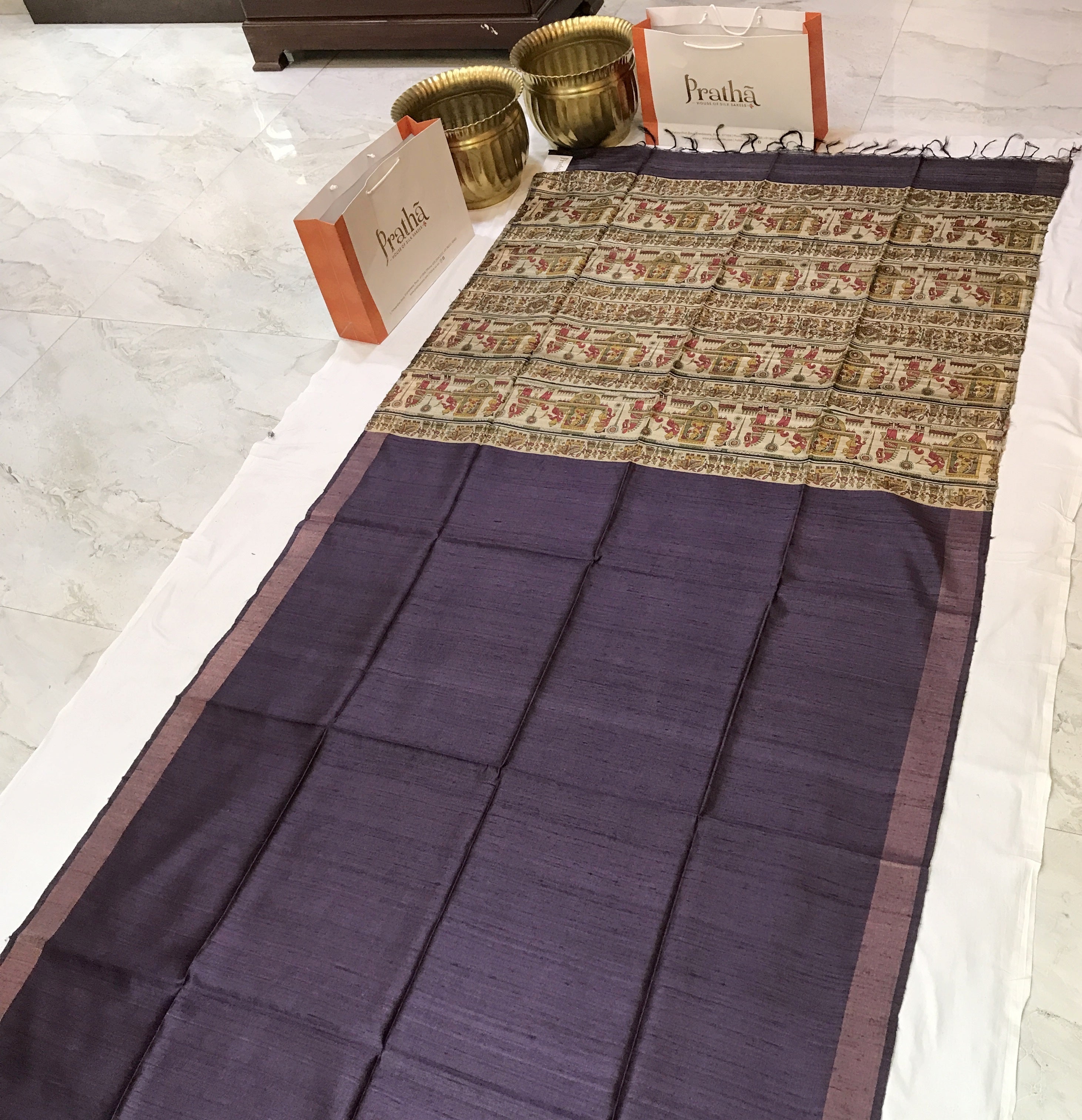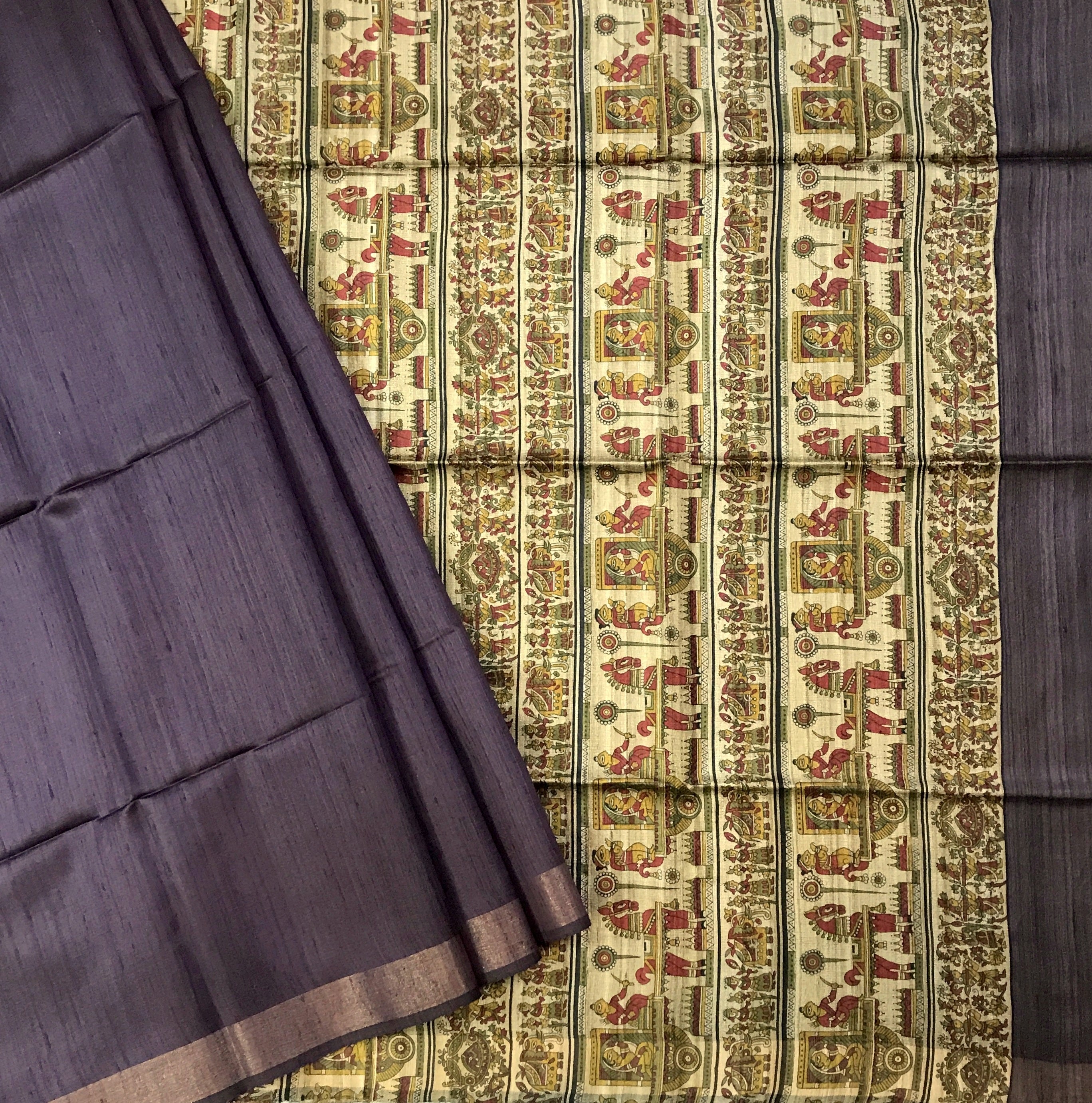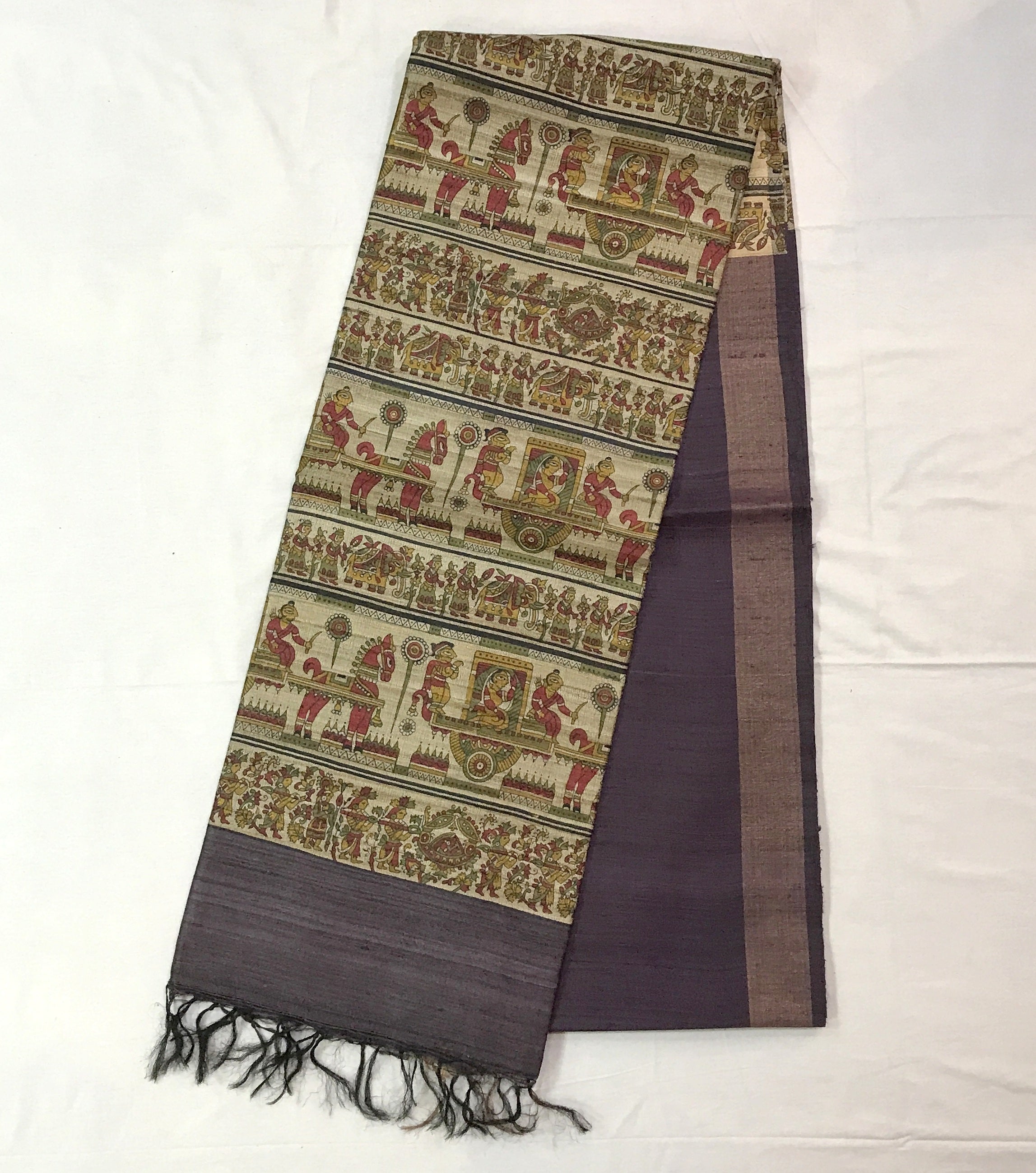 A very beautiful purple printed in dupion tussar silk saree in a printed design with a combination of all beautiful warm colours, this saree is a keepsake. The multi coloured printed design pallu adds a quirk to the otherwise traditional. From a casual friends meet, to a brunch and from an office meeting to an evening party, this one is a perfect classy outfit for all!