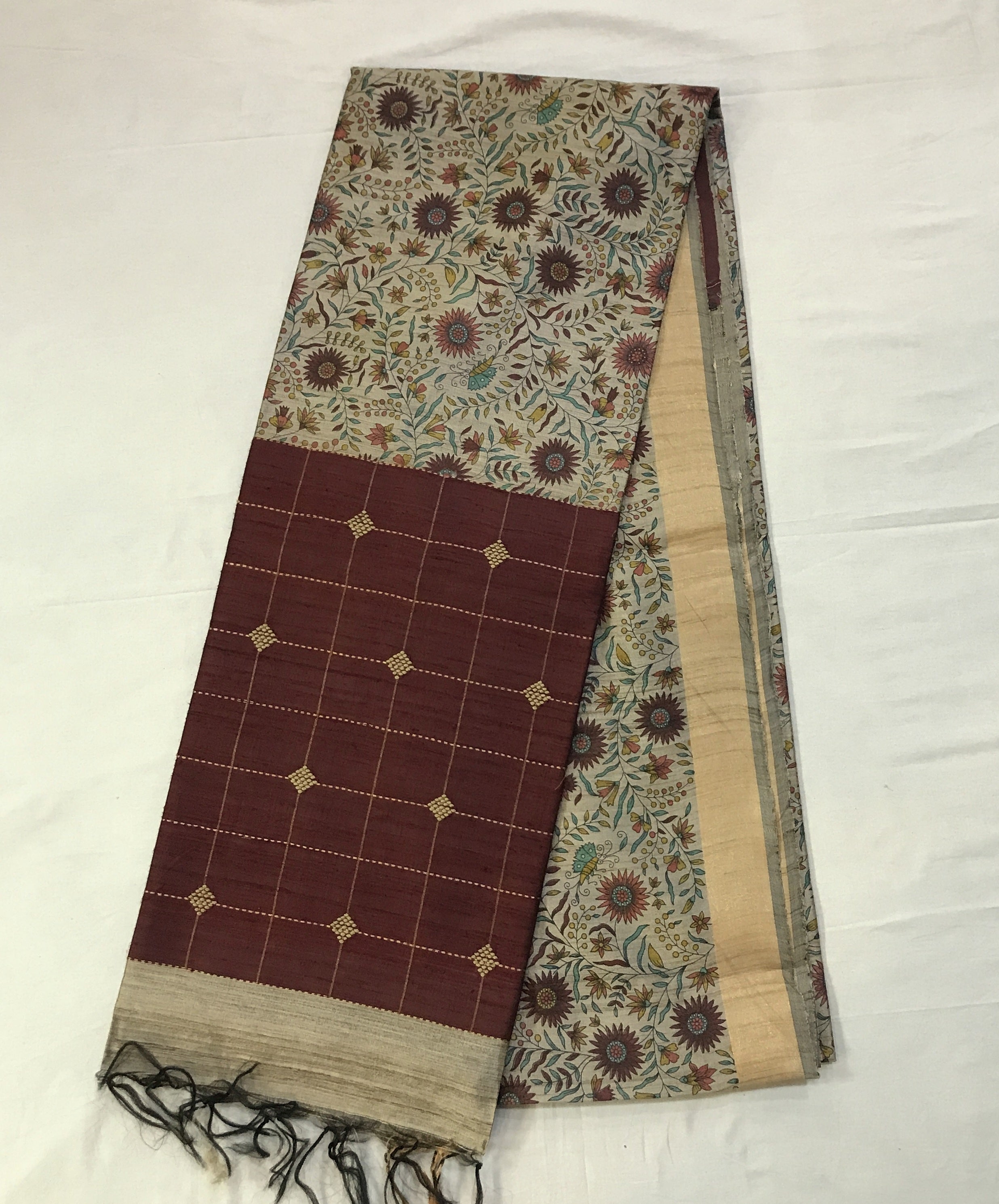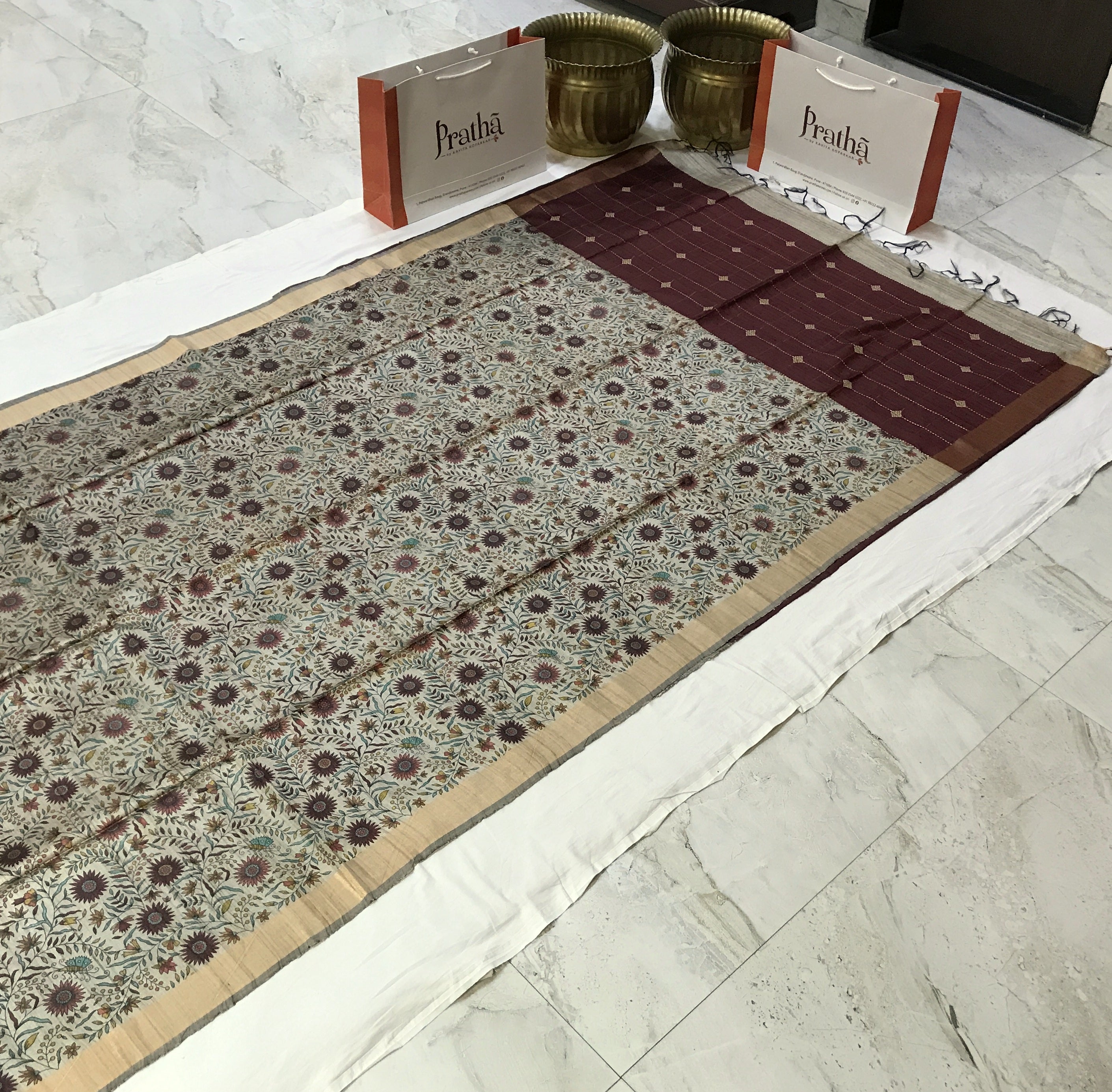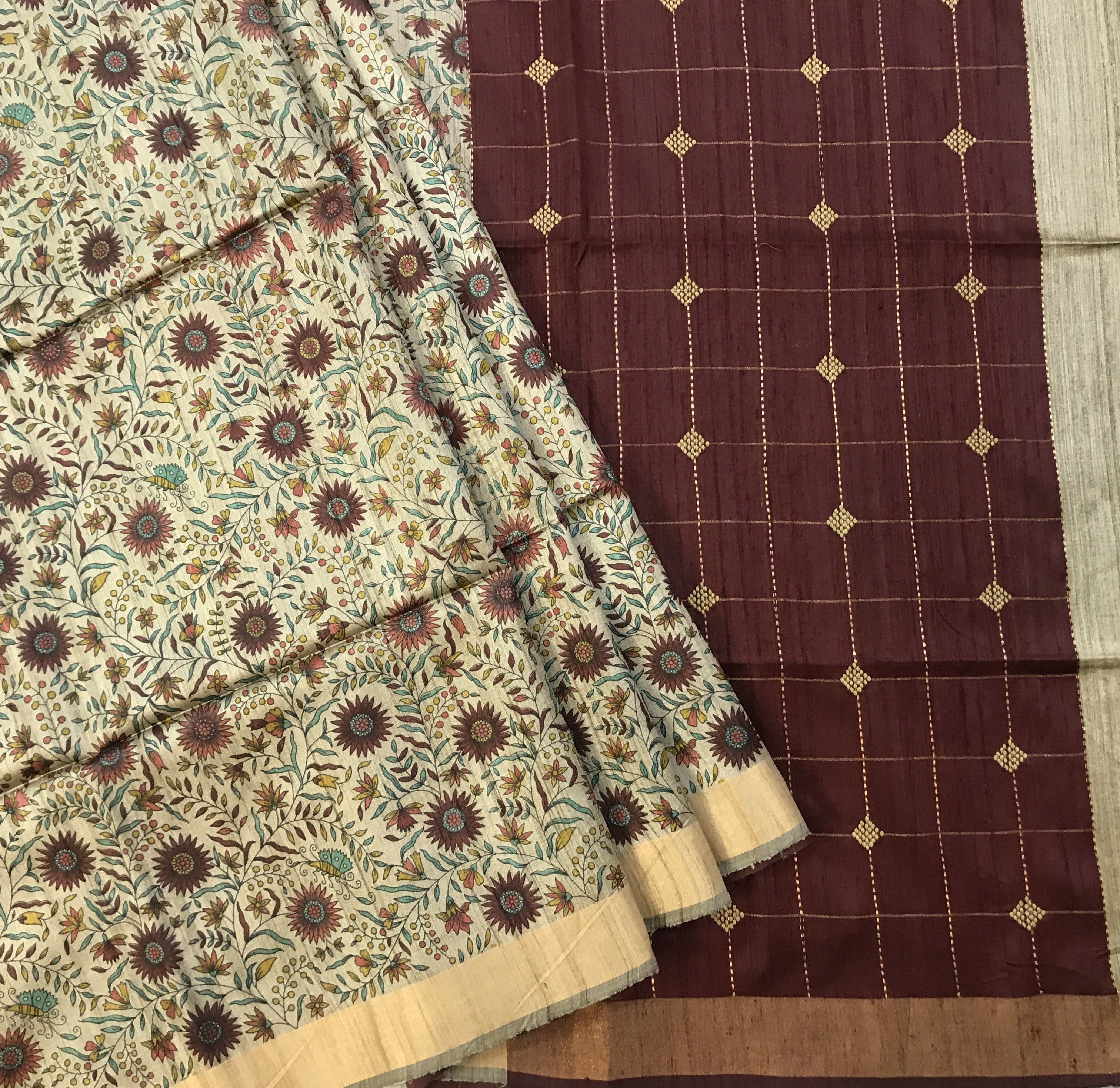 A soothing floral printed designtussar silk saree in a printed design with a combination of all beautiful warm colours, this saree is a keepsake. The checks design pallu adds a quirk to the otherwise traditional. From a casual friends meet, to a brunch and from an office meeting to a n evening party, this one is a perfect classy outfit for all!