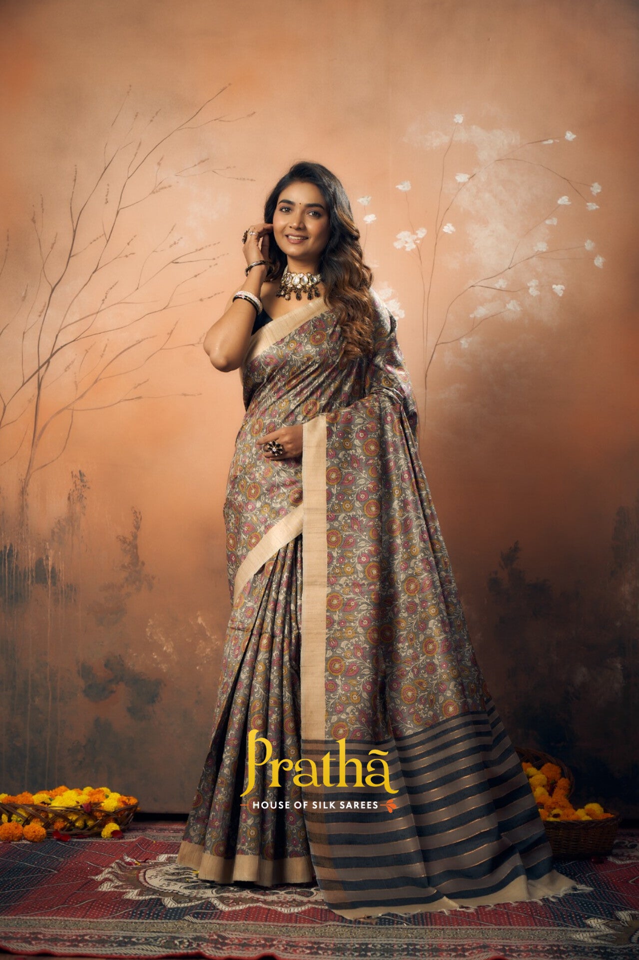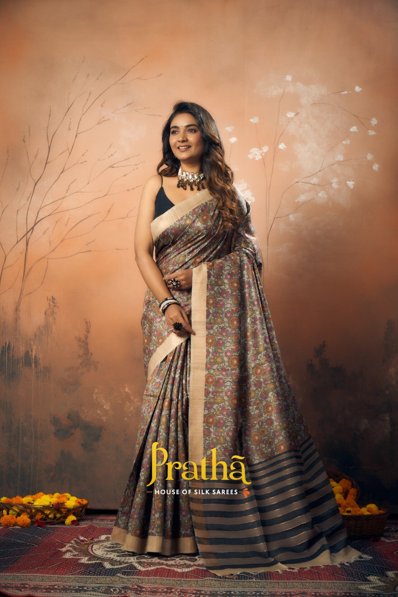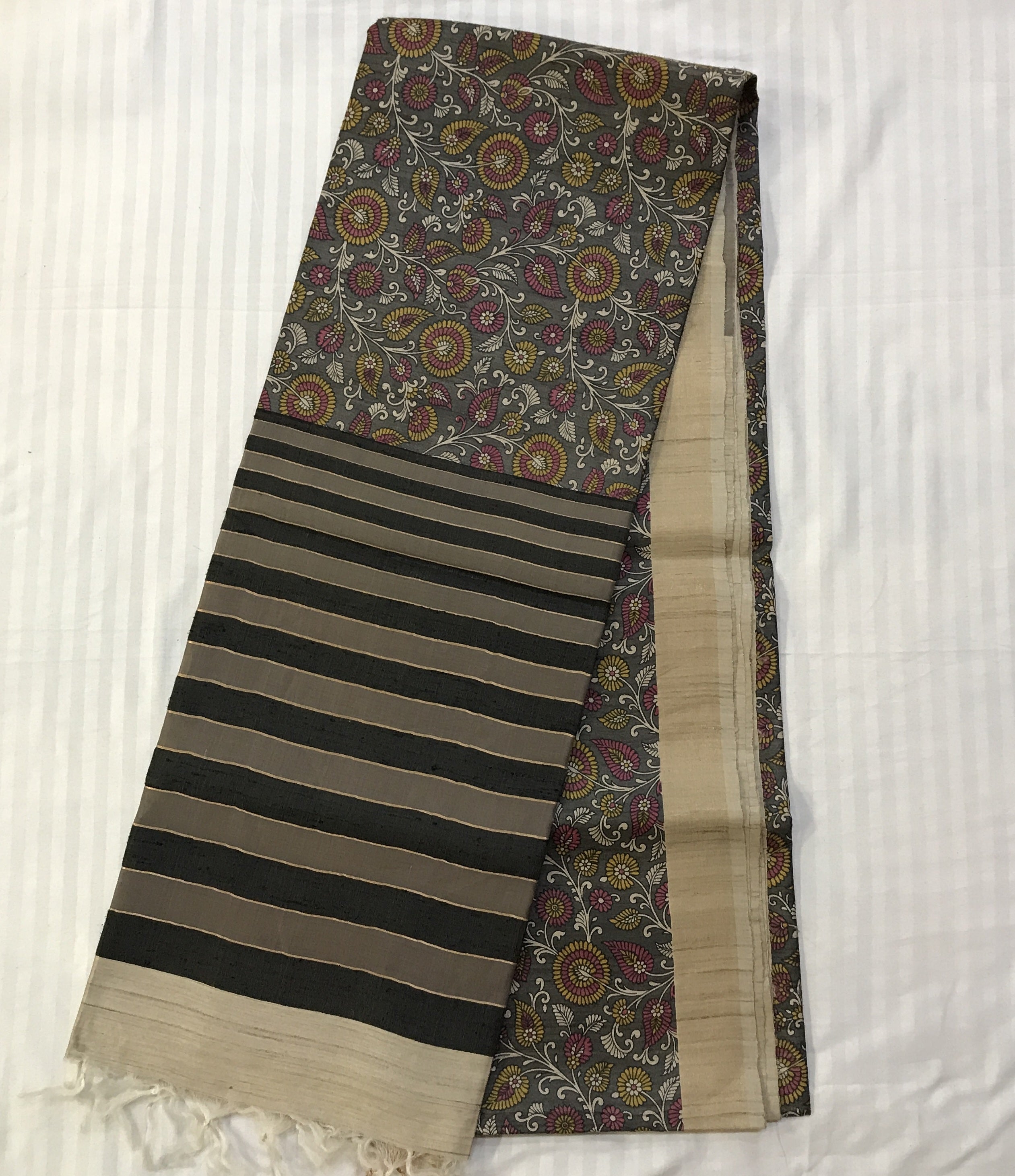 A very in dupion tussar silk saree in a printed design with a combination of all beautiful warm colours, this saree is a keepsake. The printed design all over the saree in a unique print is a keepsake. From a casual friends meet, to a brunch and from an office meeting to an evening party, this one is a perfect classy outfit for all!