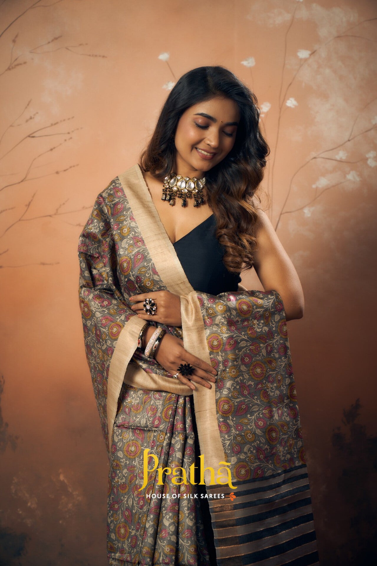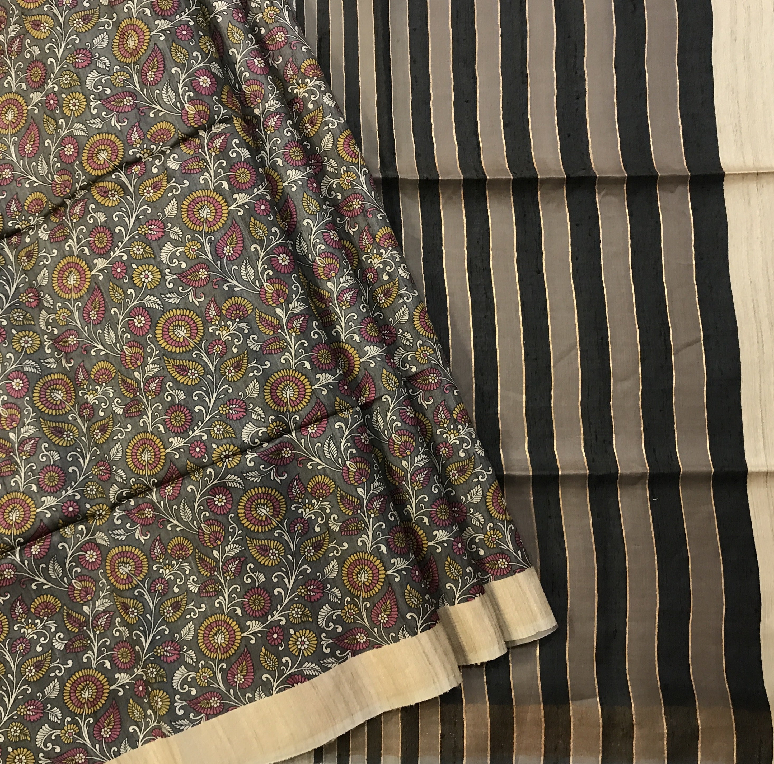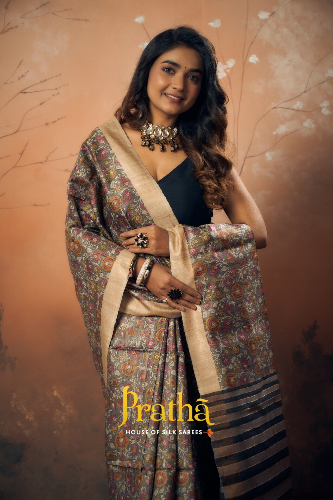 A very in dupion tussar silk saree in a printed design with a combination of all beautiful warm colours, this saree is a keepsake. The printed design all over the saree in a unique print is a keepsake. From a casual friends meet, to a brunch and from an office meeting to an evening party, this one is a perfect classy outfit for all!