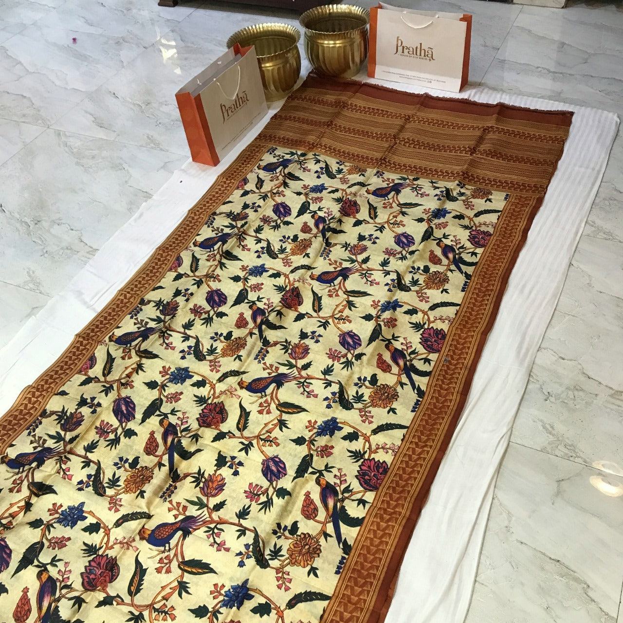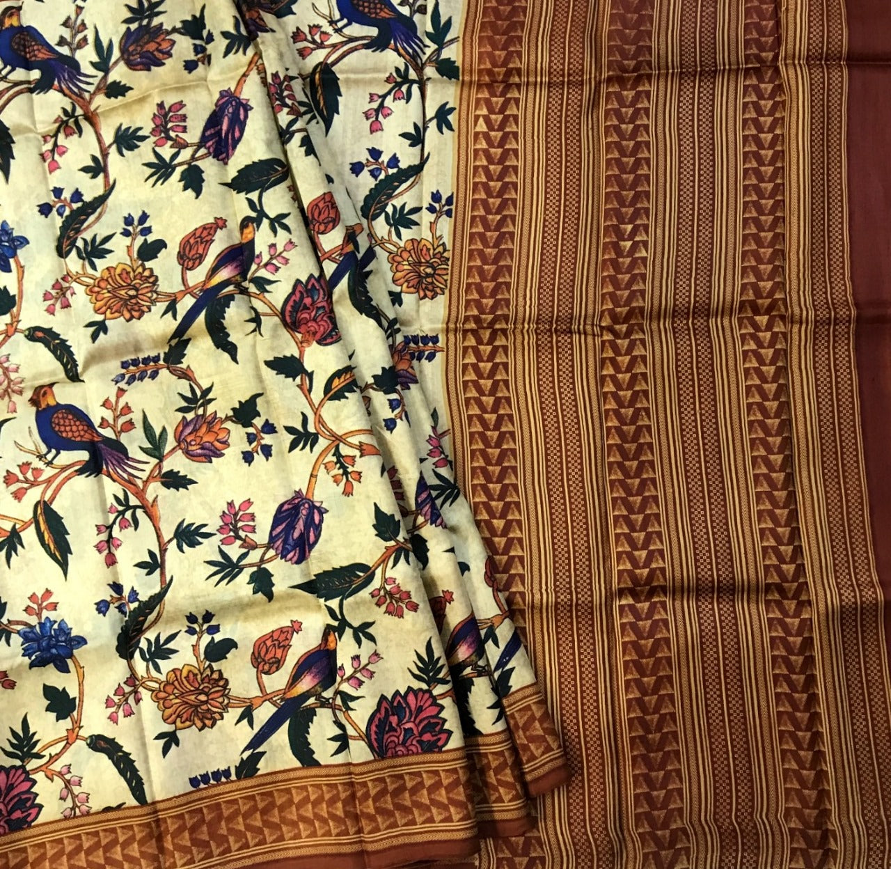 A soothing printed design tussar silk saree with a combination of all beautiful warm colours, this saree is a keepsake. The contrast pallu adds a quirk to the otherwise traditional. From a casual friends meet, to a brunch and from an office meeting to evening party, this one is a perfect classy outfit for all!