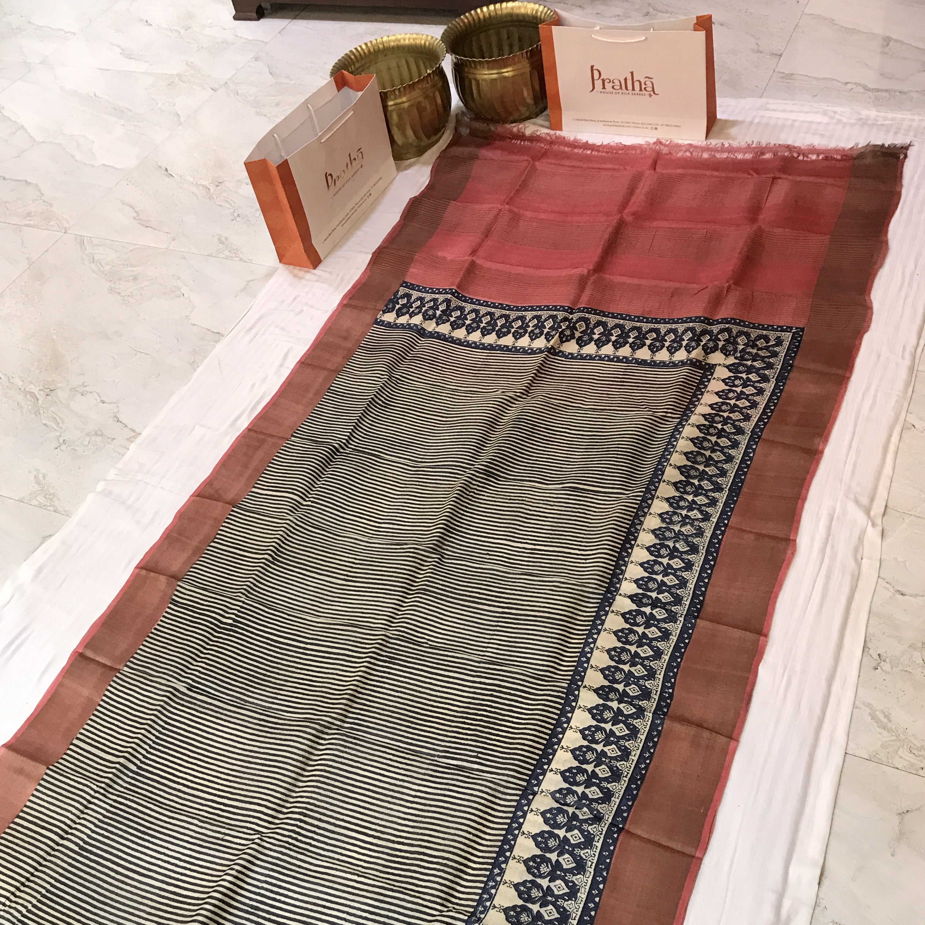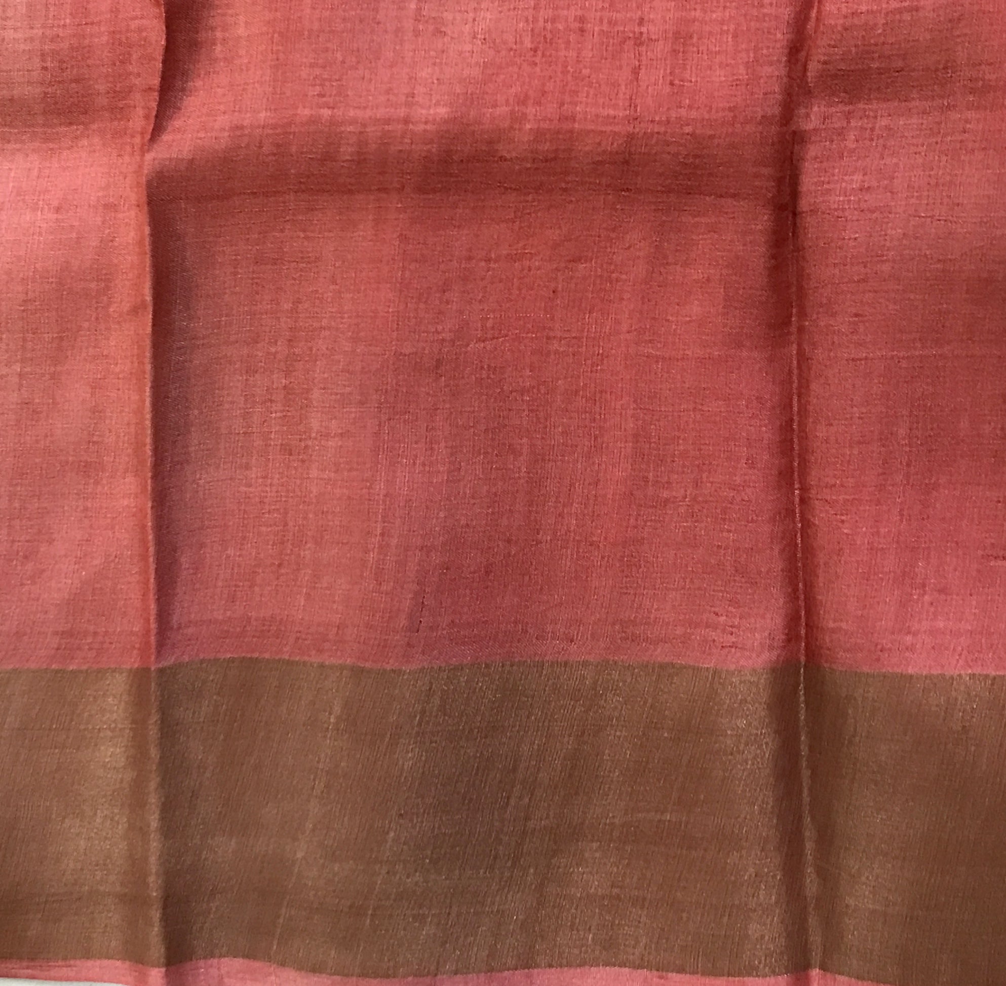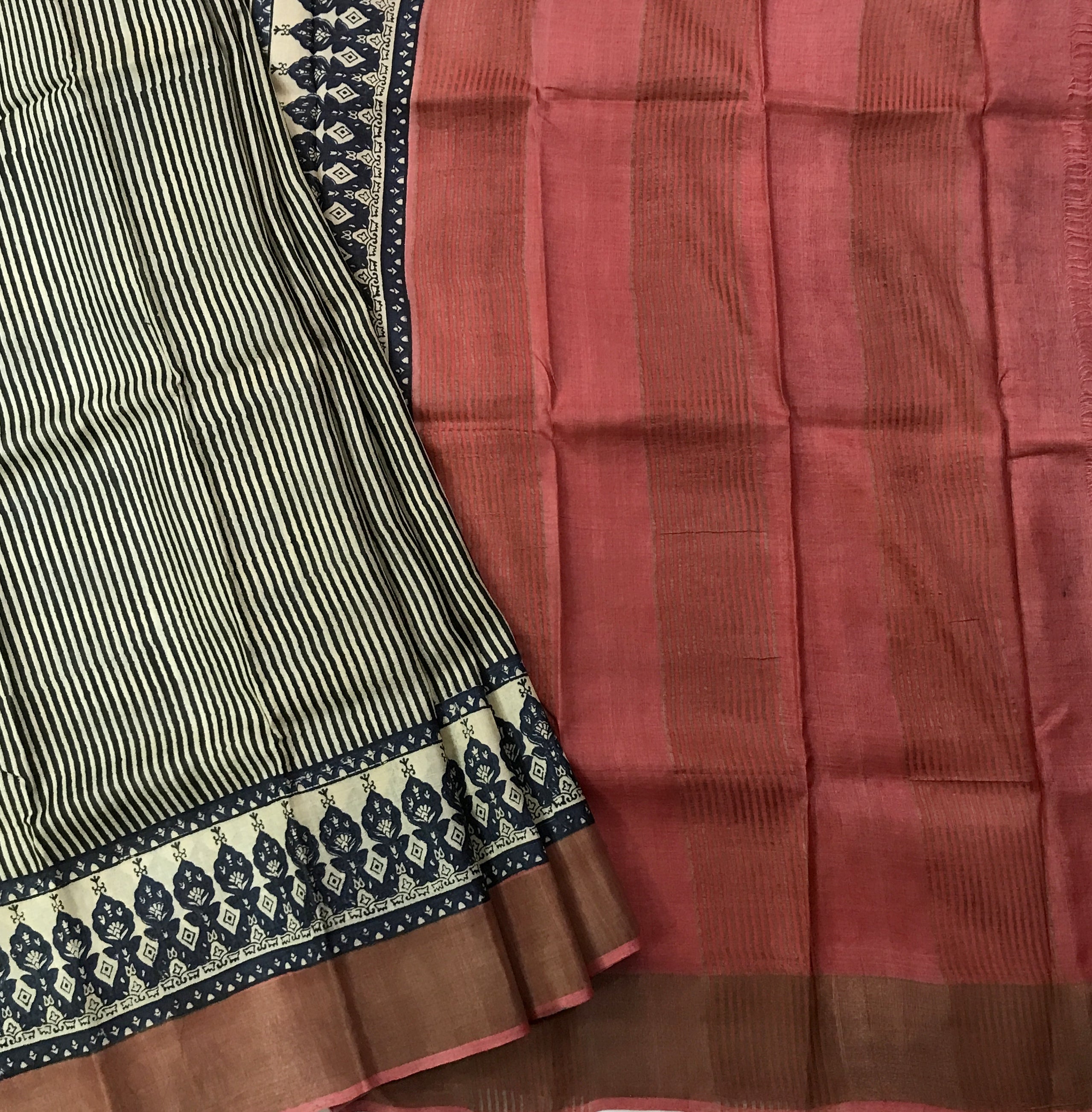 A very beautiful shade of beige saree with an equally fresh zari border , this tussar silk saree is a treat to the eyes! The lovely design with lines and the subtle contrast pink pallu add to the grace of this weave.