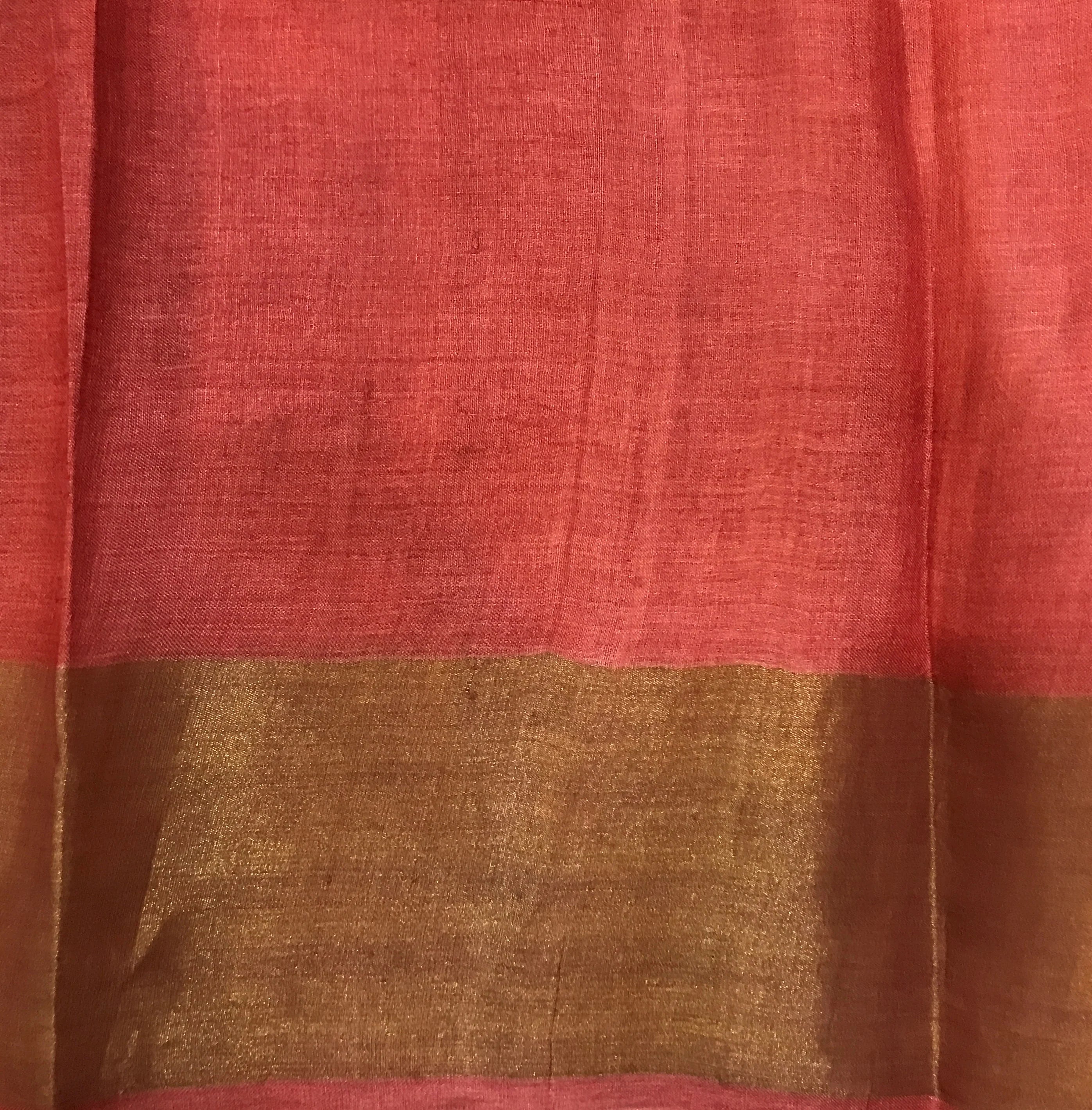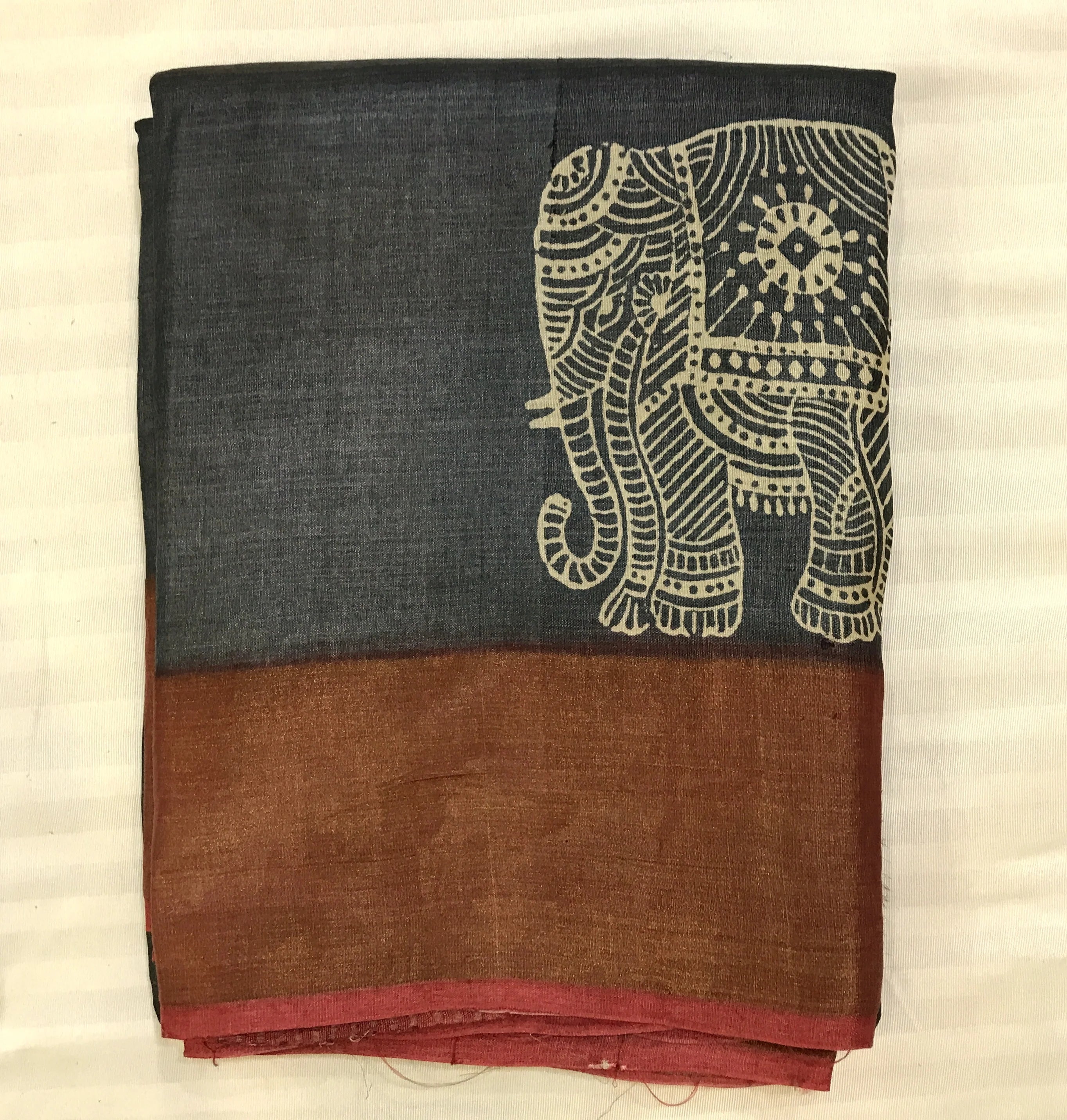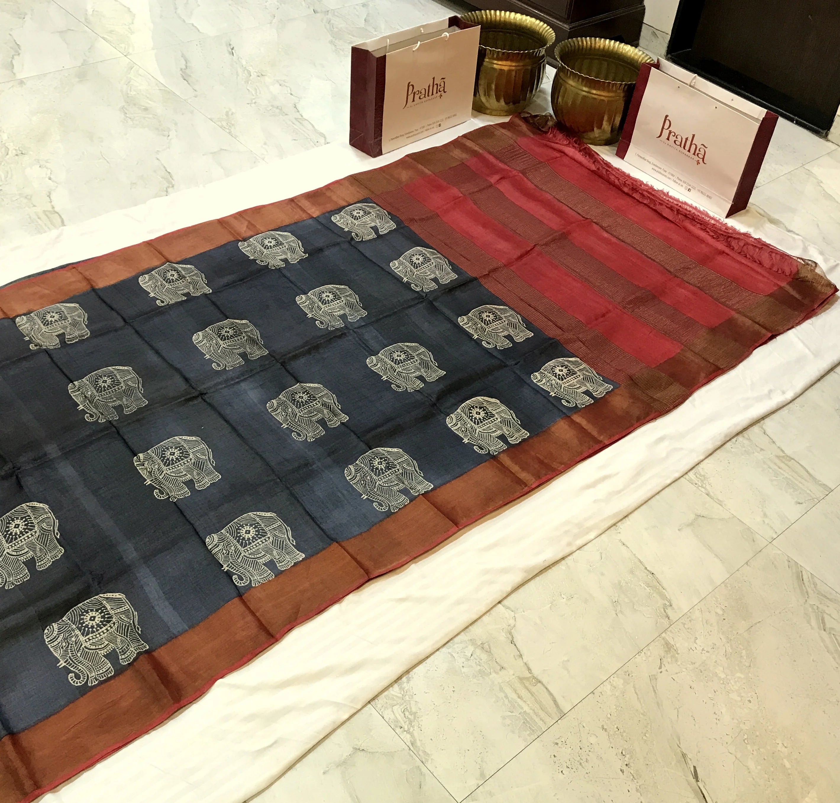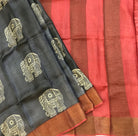 This is a plain grayish black Tussar soft silk saree with a red colour at its border and pallu. Don't miss a beautiful elephant motif on the border and pallu of this saree which is wonderful. A perfect quirky yet classy drape for any casual outing, be it a brunch with friends, a romantic date or an office meeting.