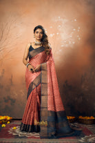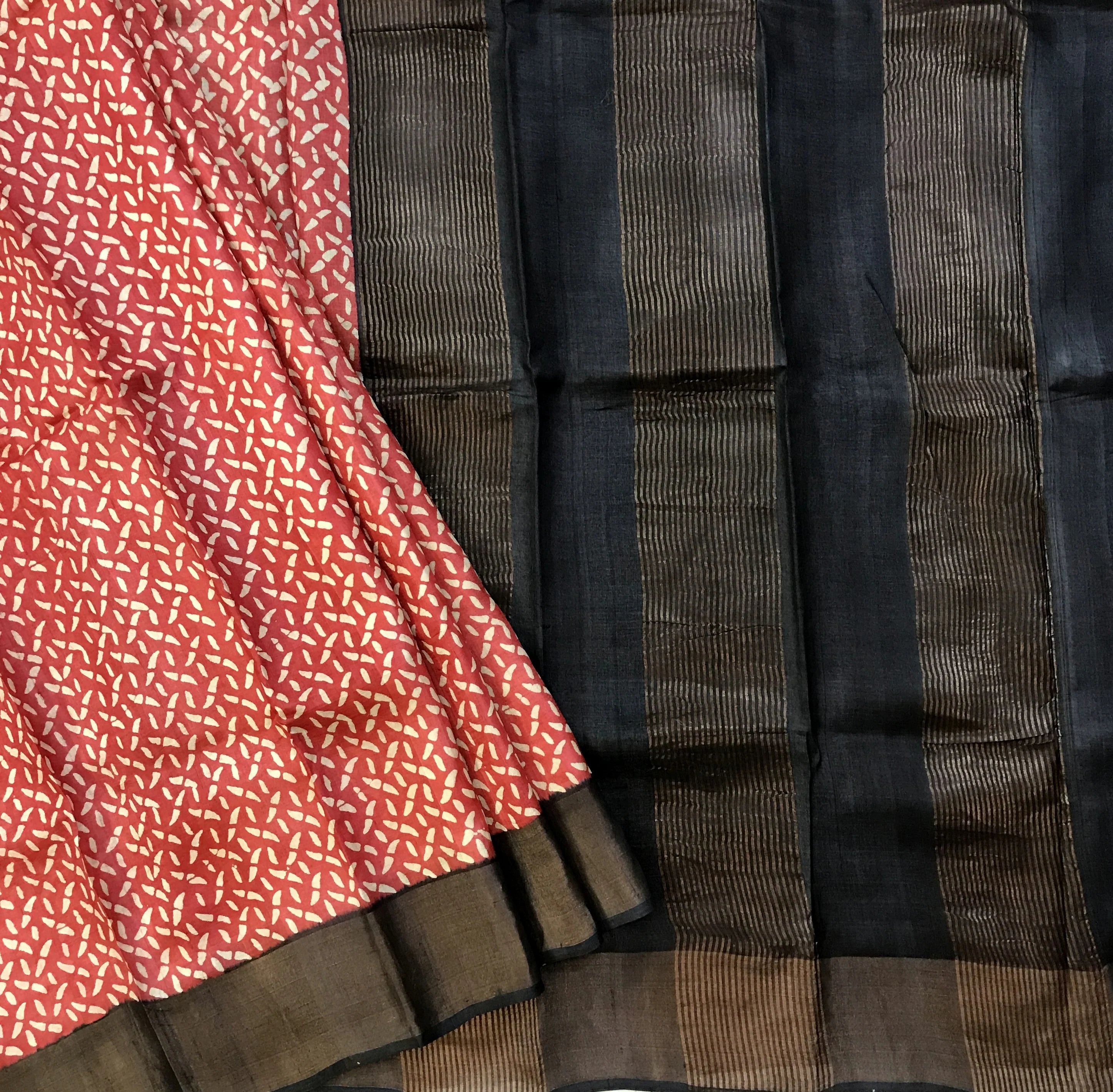 A fresh shade of red, this tussar silk saree is a treat to the eyes! The lovely printed design motifs and the black pallu add to the grace of this weave.