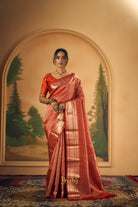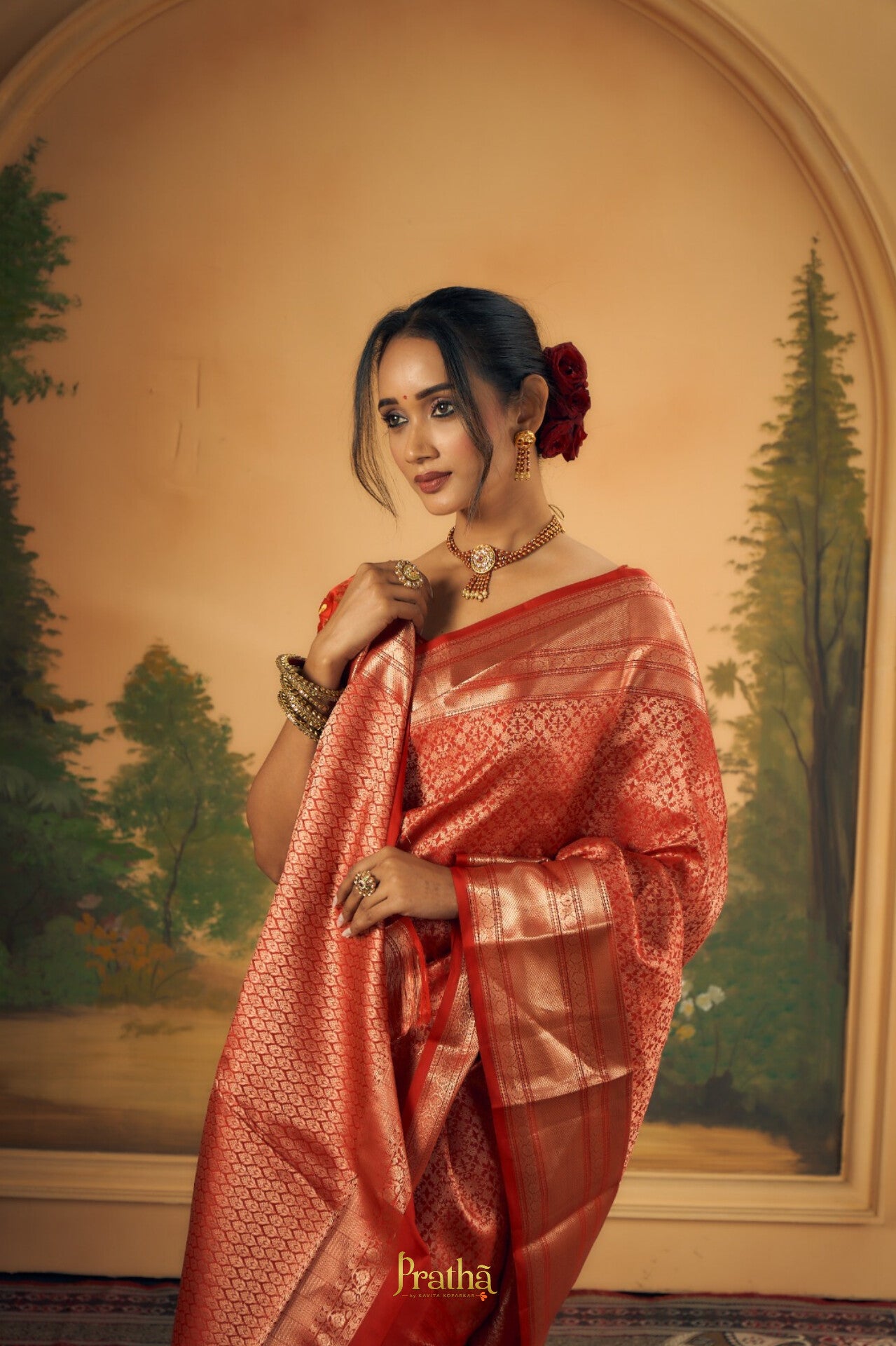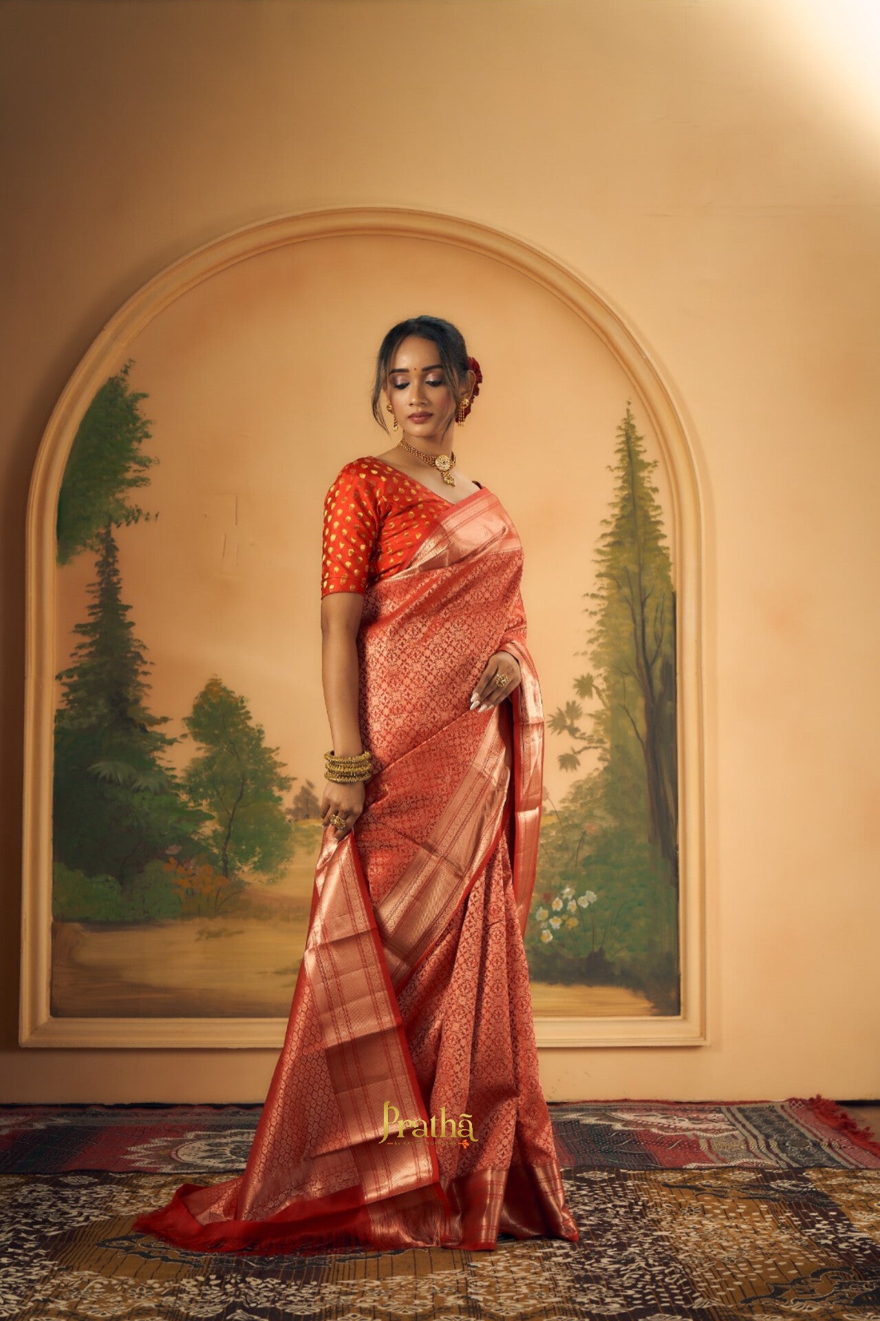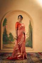 For those who adore red in all its glory, this exquisite power loom Kanjeevaram saree is a perfect choice. Showcasing a captivating shade of red it features an elegant Copperish zari brocade pattern woven with finesse, making it an extraordinary piece. The saree is accentuated by a self-colored border adorned with intricate zari work, seamlessly blending tradition and modernity. Paired with a matching blouse in the same red and zari border, this saree boasts a luxurious finish and impeccable craftsmanship, ensuring it stands out as a true masterpiece.