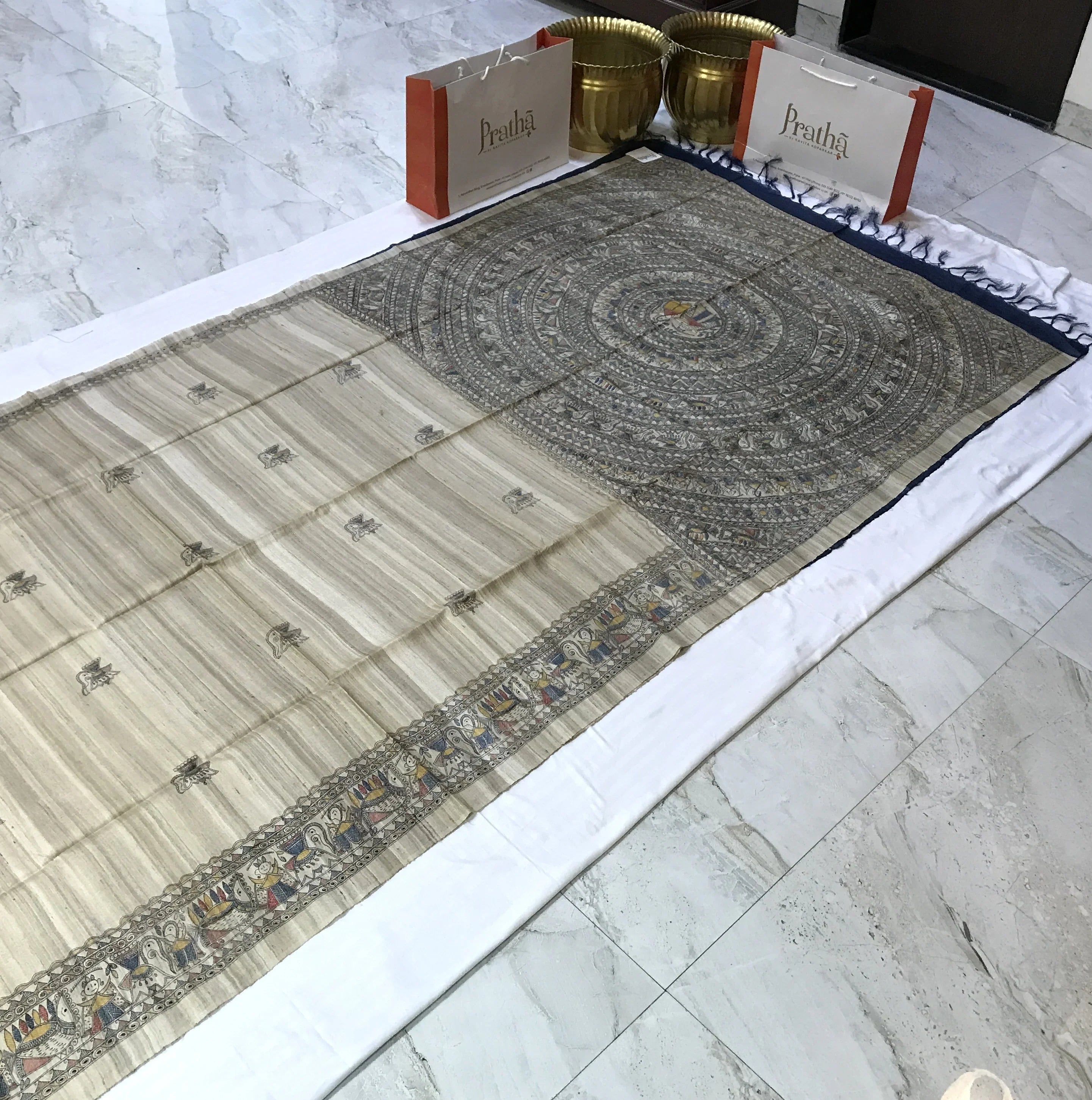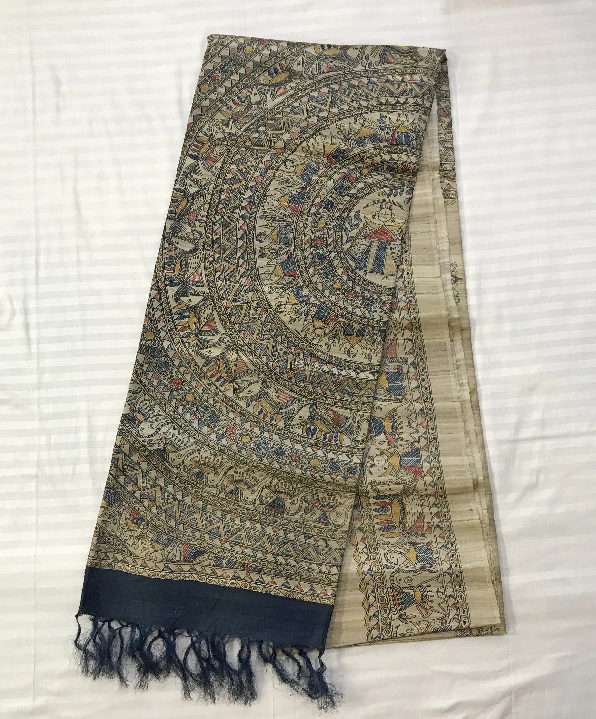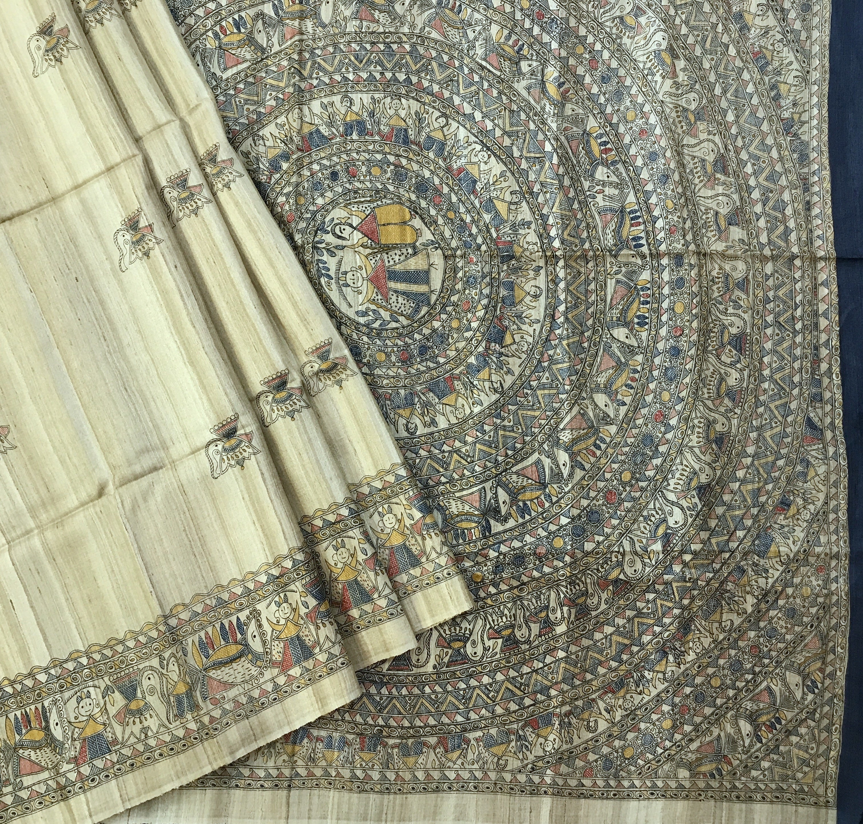 A lovely fresh shade of off-white in pure Tussar Silk style saree with madhubani print design in all over pallu looks fantastic. his madhubani print ( design ) is famous art, wchich looks very unique and great when were this saree. This saree is light in weight and looks fantastic at corporate events, casual brunches as well as get-togethers.