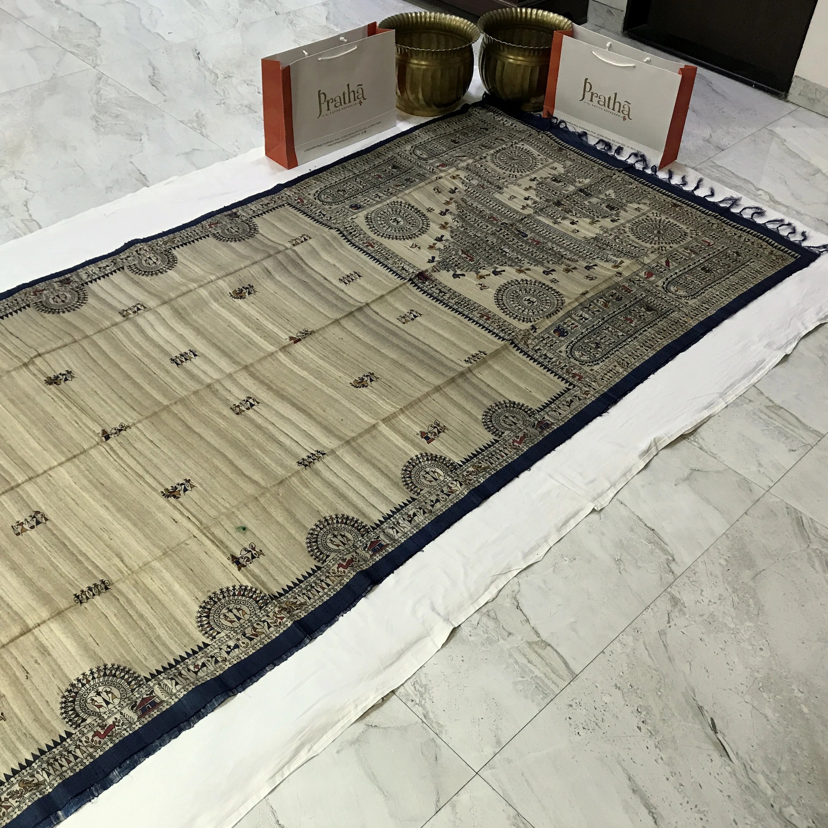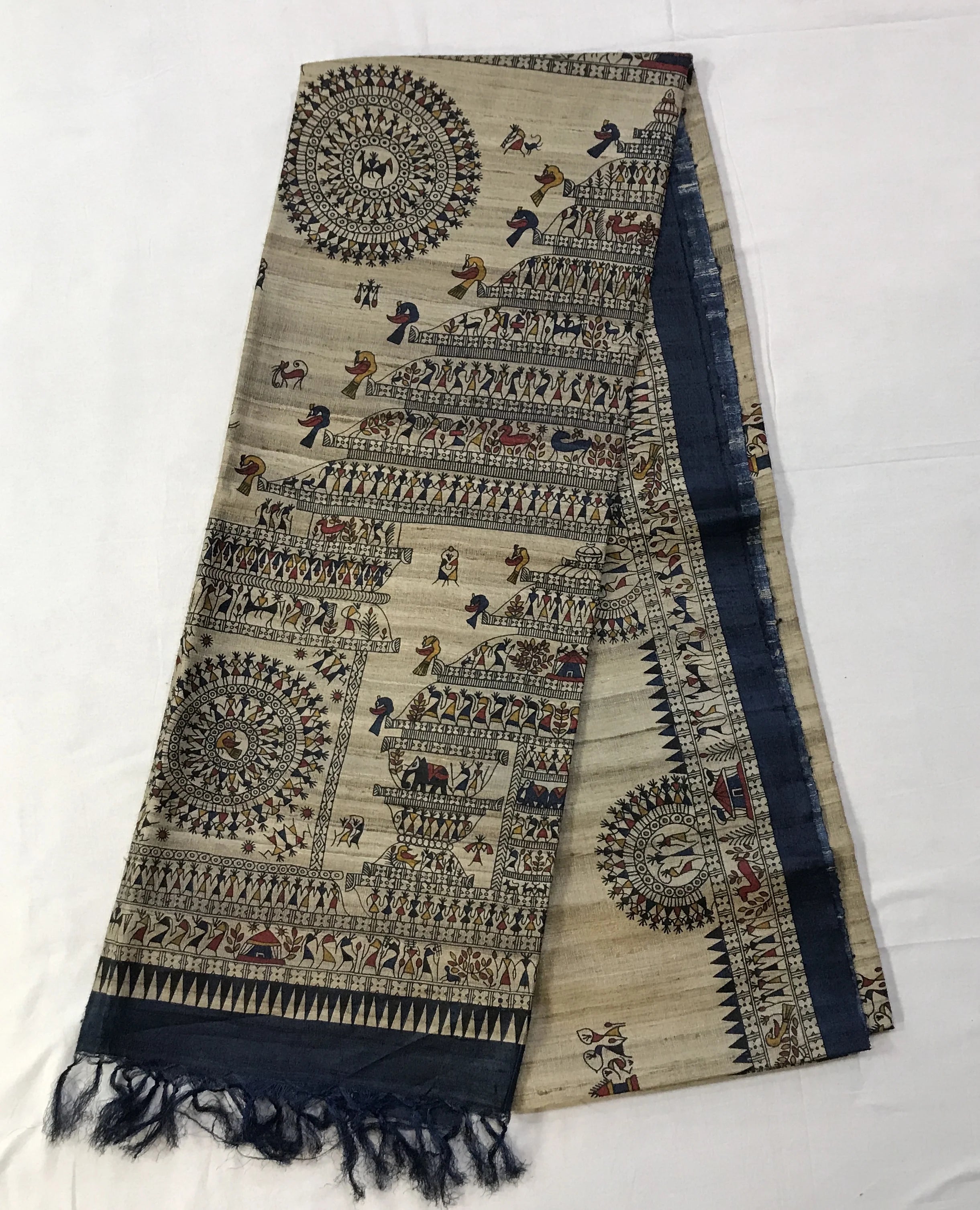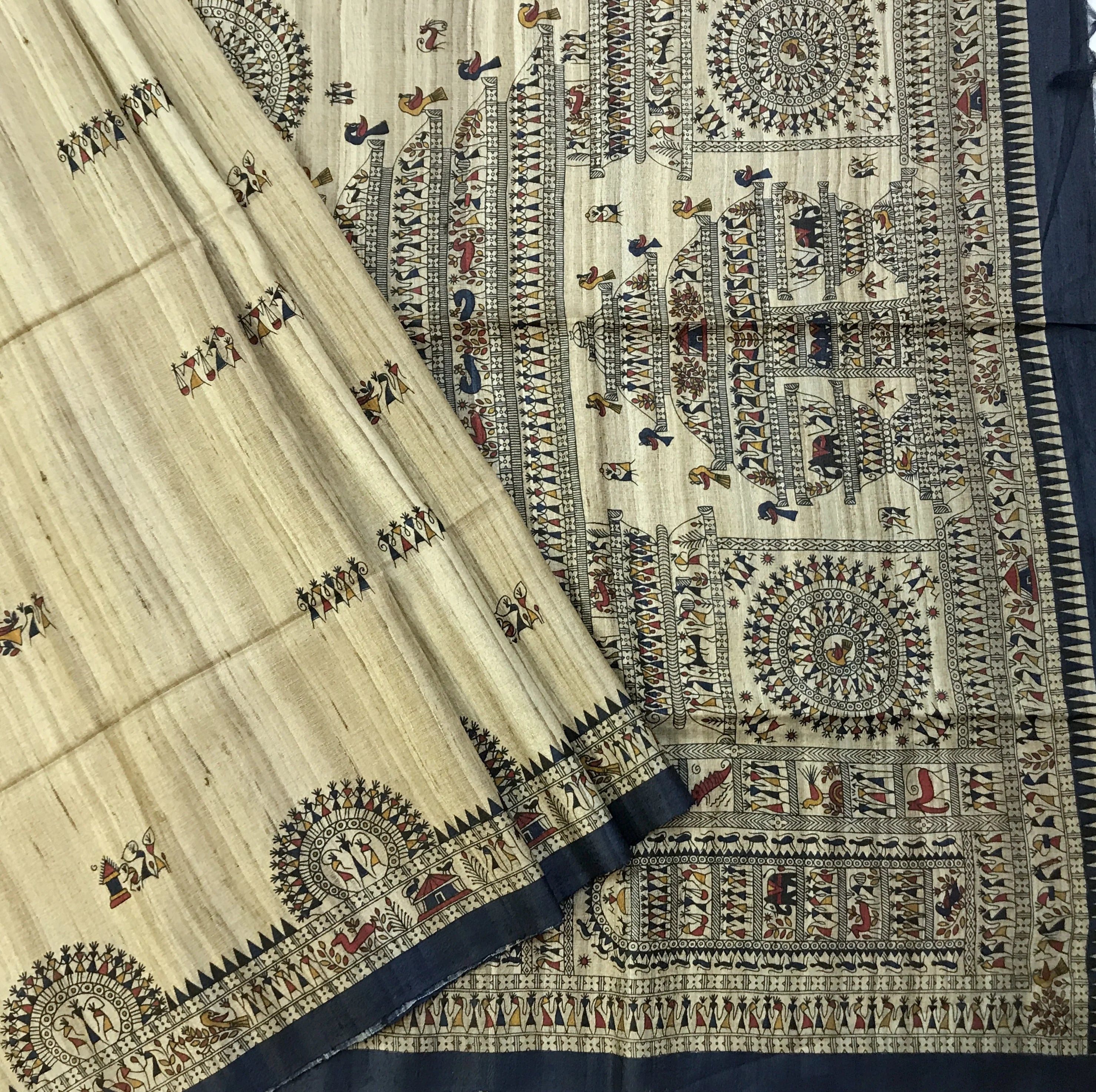 This madhubani print ( design ) is famous art , which looks very unique and great when we wear this saree. A lovely and attractive fresh shade of beige in pure Tussar Silk style saree with madhubani print design butti in all over the saree and printed design border with pallu looks fantastic. This saree is light in weight and looks fantastic at corporate events, casual brunches as well as get-togethers.