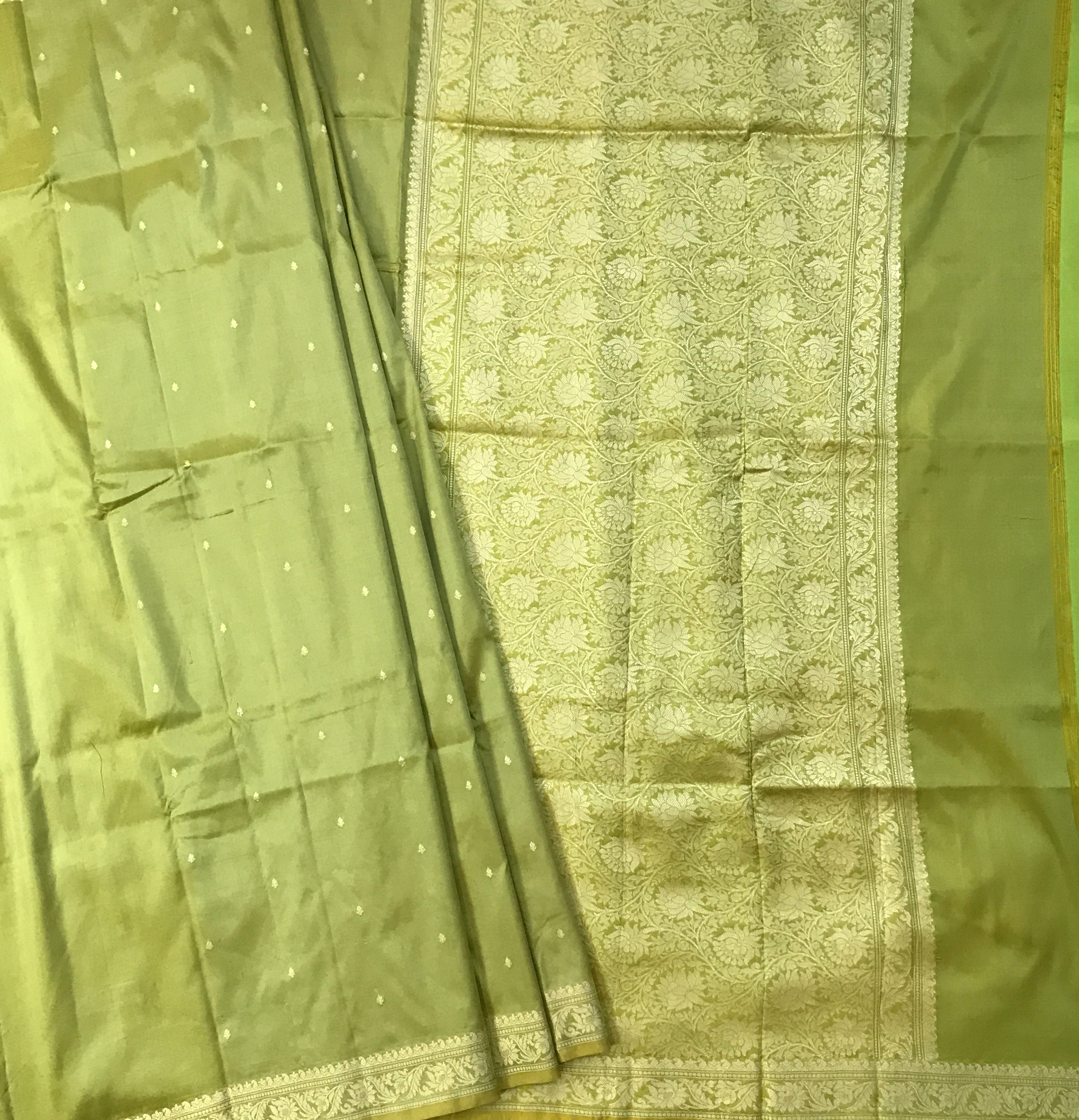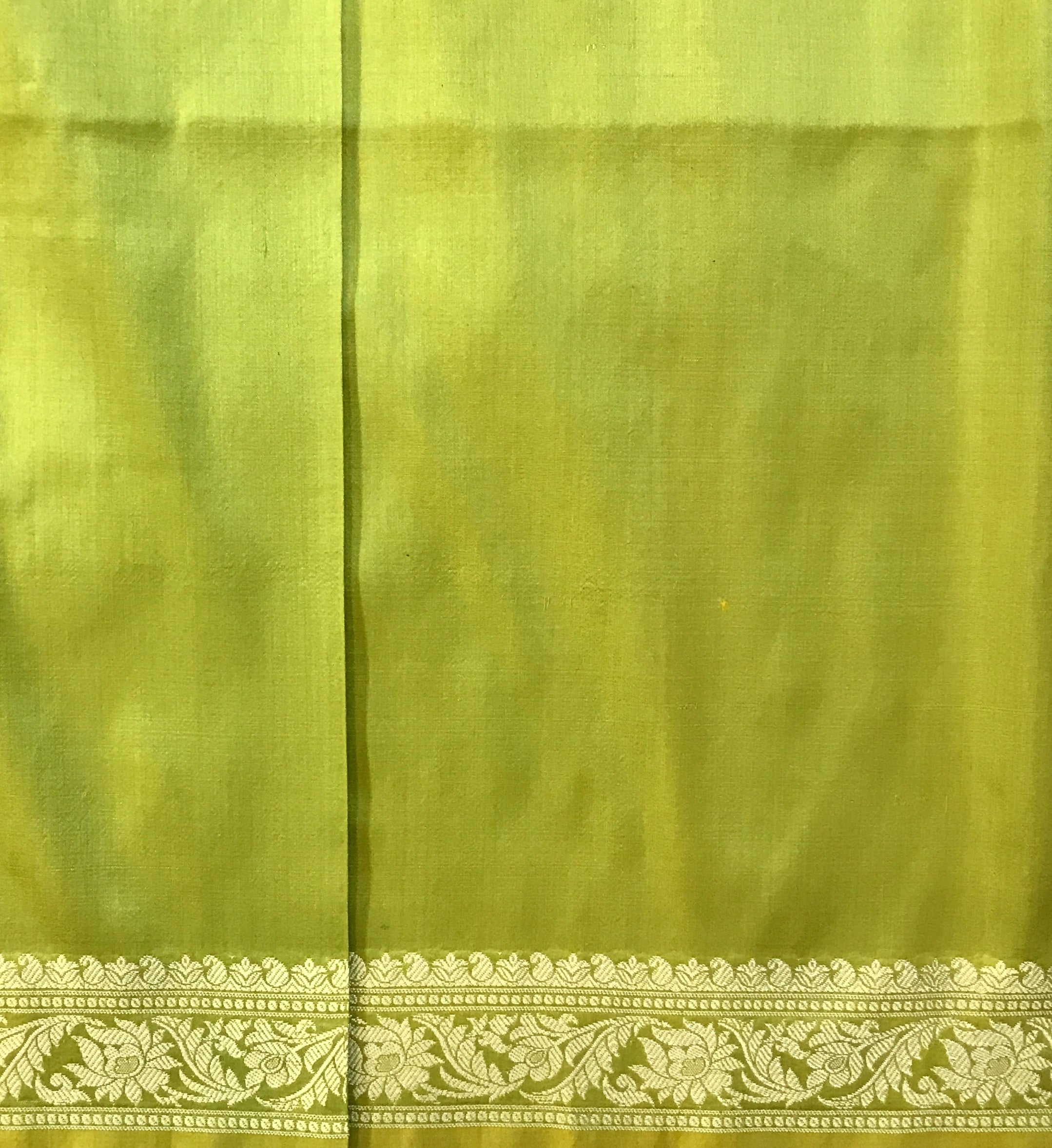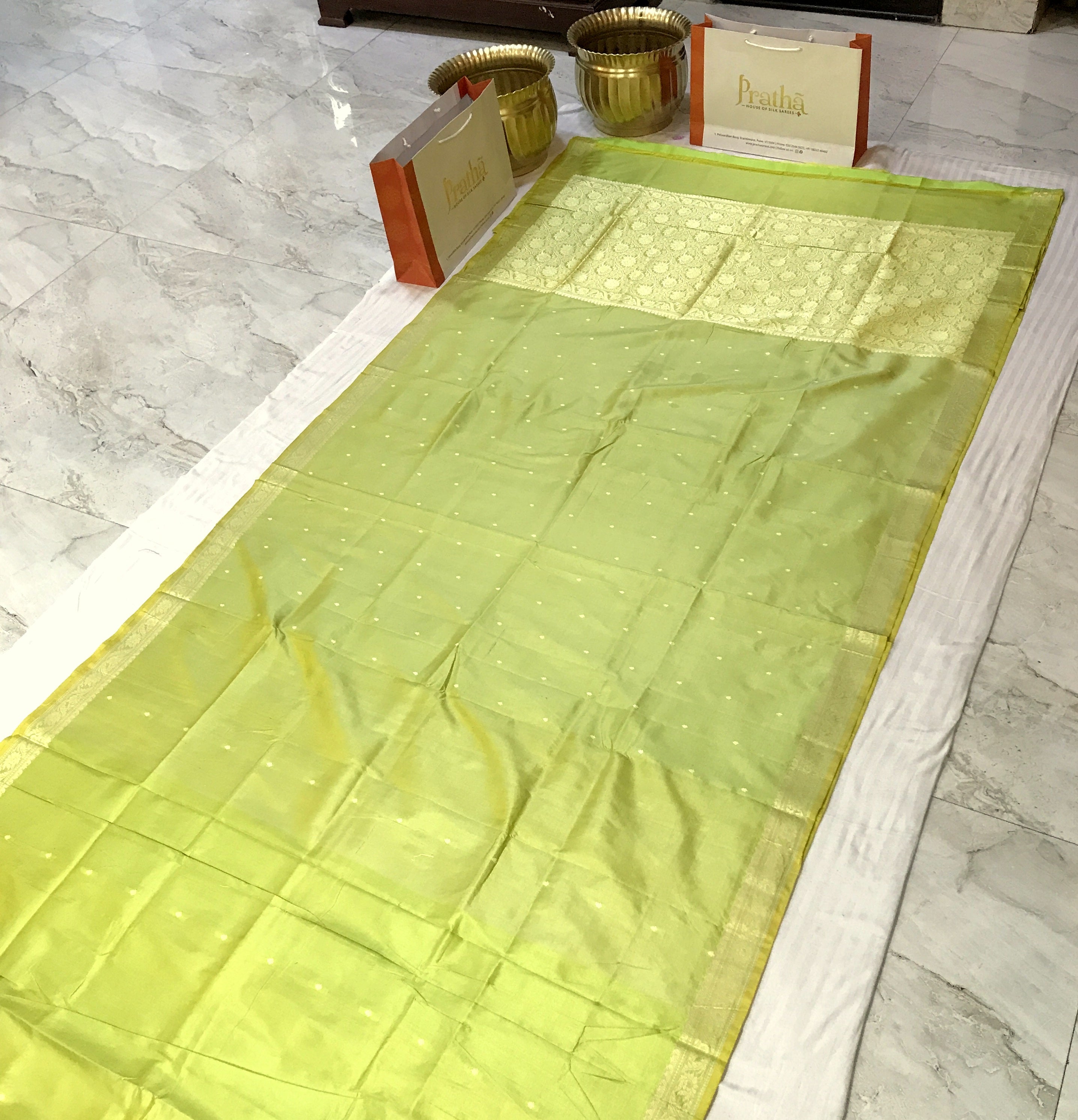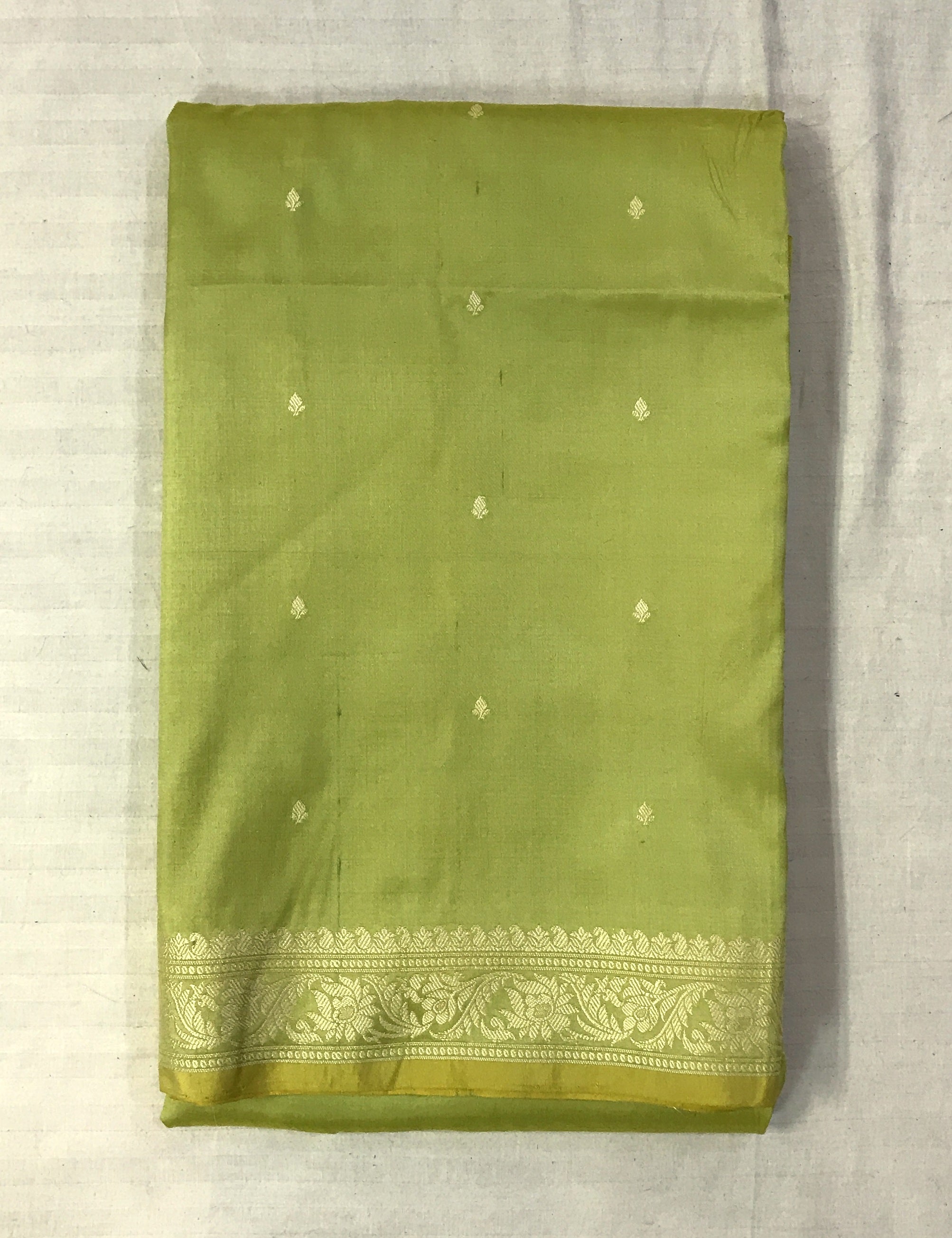 A very pretty shade of Green Banarasi with a nice traditional border looks great! This saree is light weight and easy to wear at any function, meetings and parties. Do not miss the delicate floral butti and pallu all over the saree woven in reshim thread! This is simply beautiful.