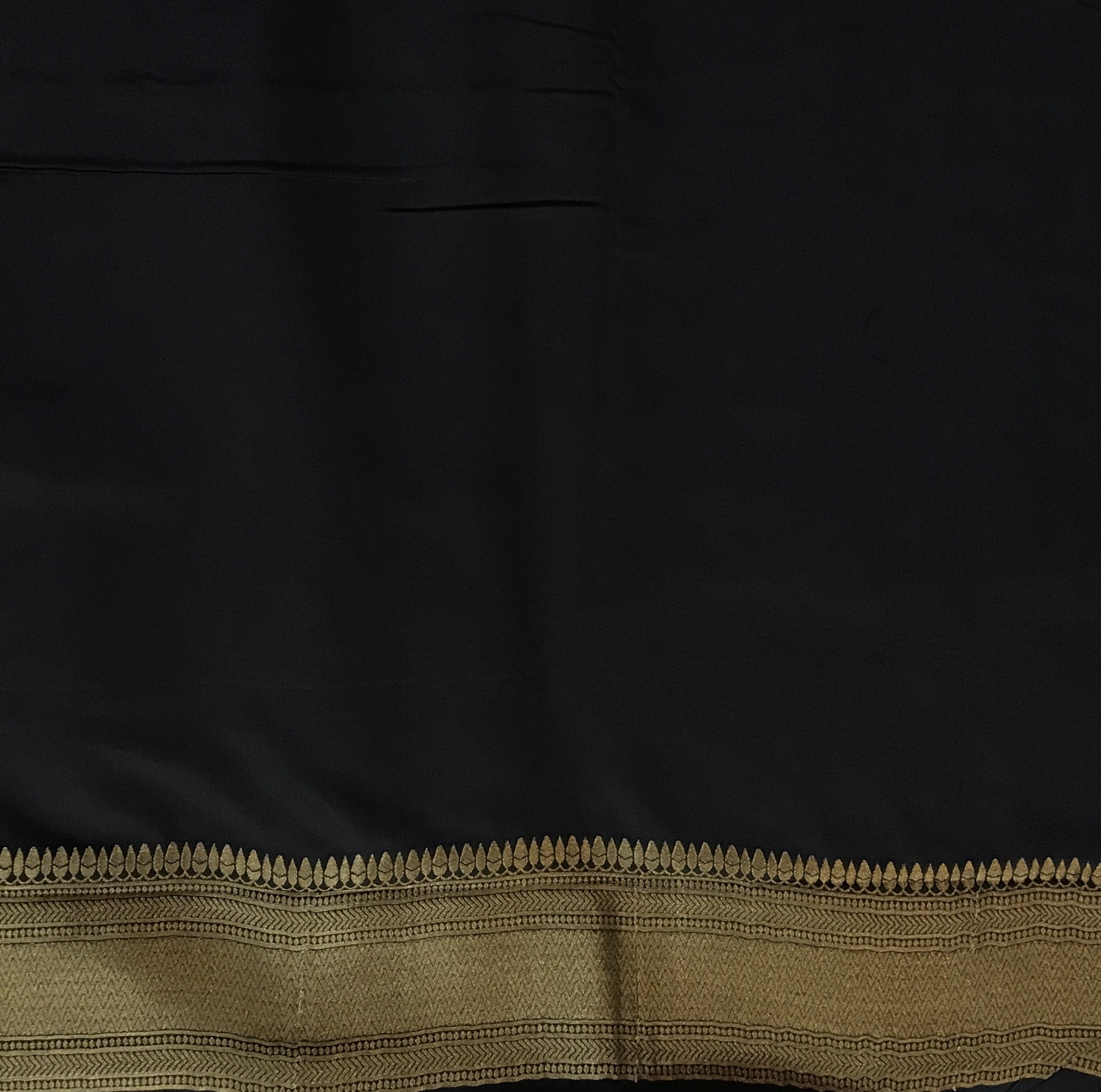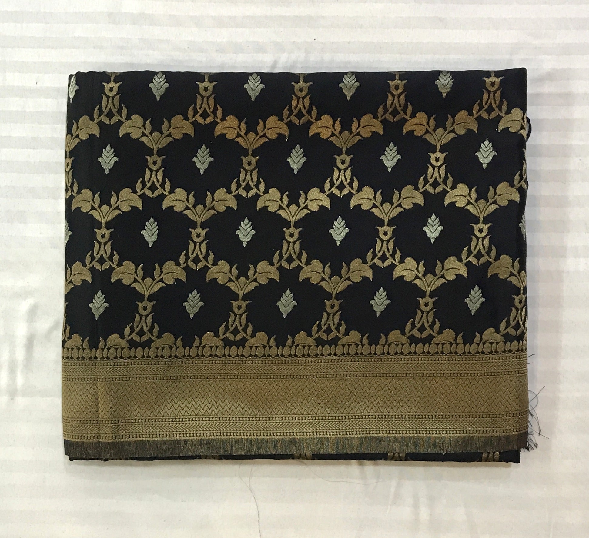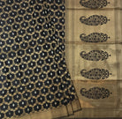 Stylish and timeless, this black silk saree is adorned with floral motifs that bring a bold, artistic flair. The look is elevated by a beautifully crafted intricate border, making it a perfect pick for celebrations and special events.