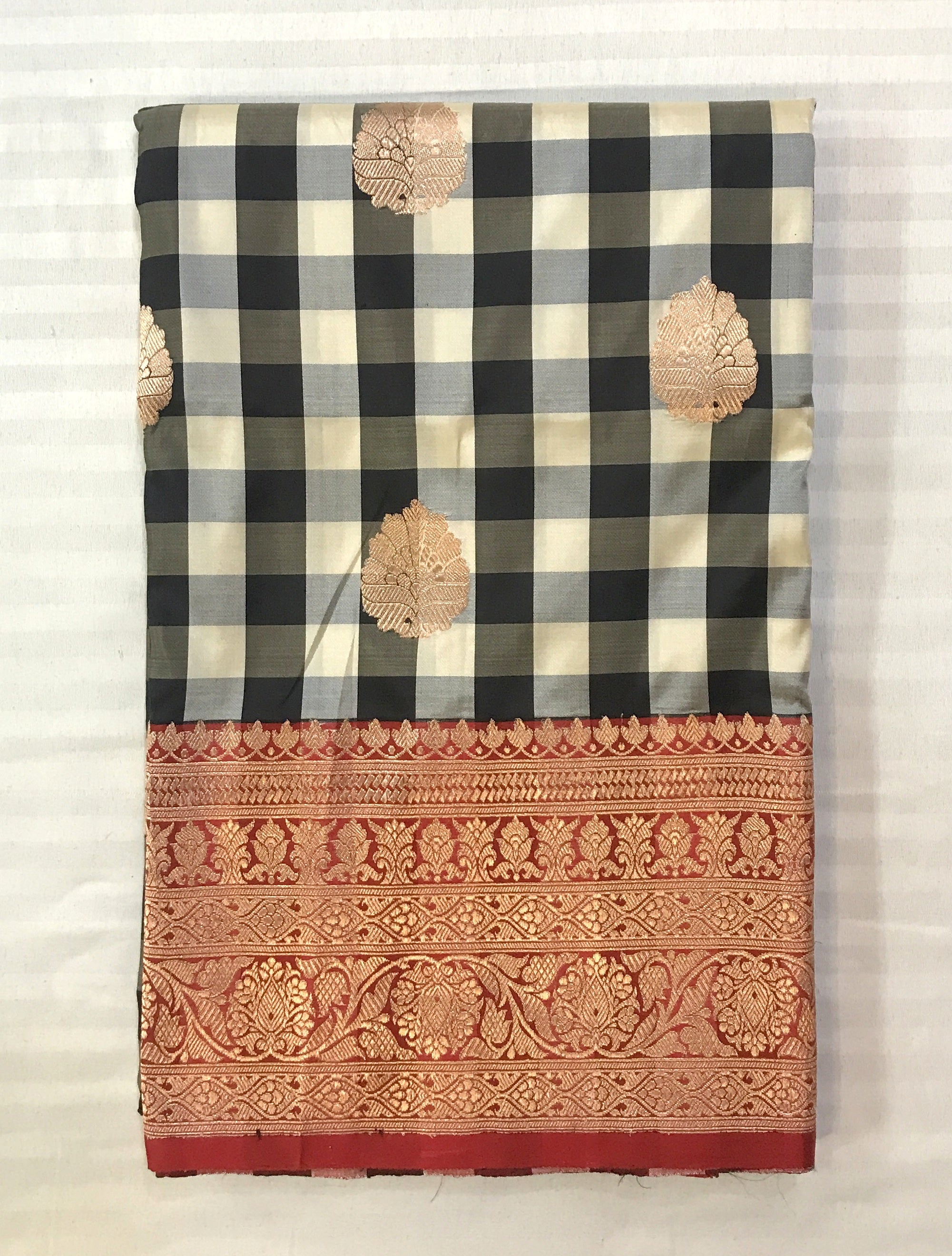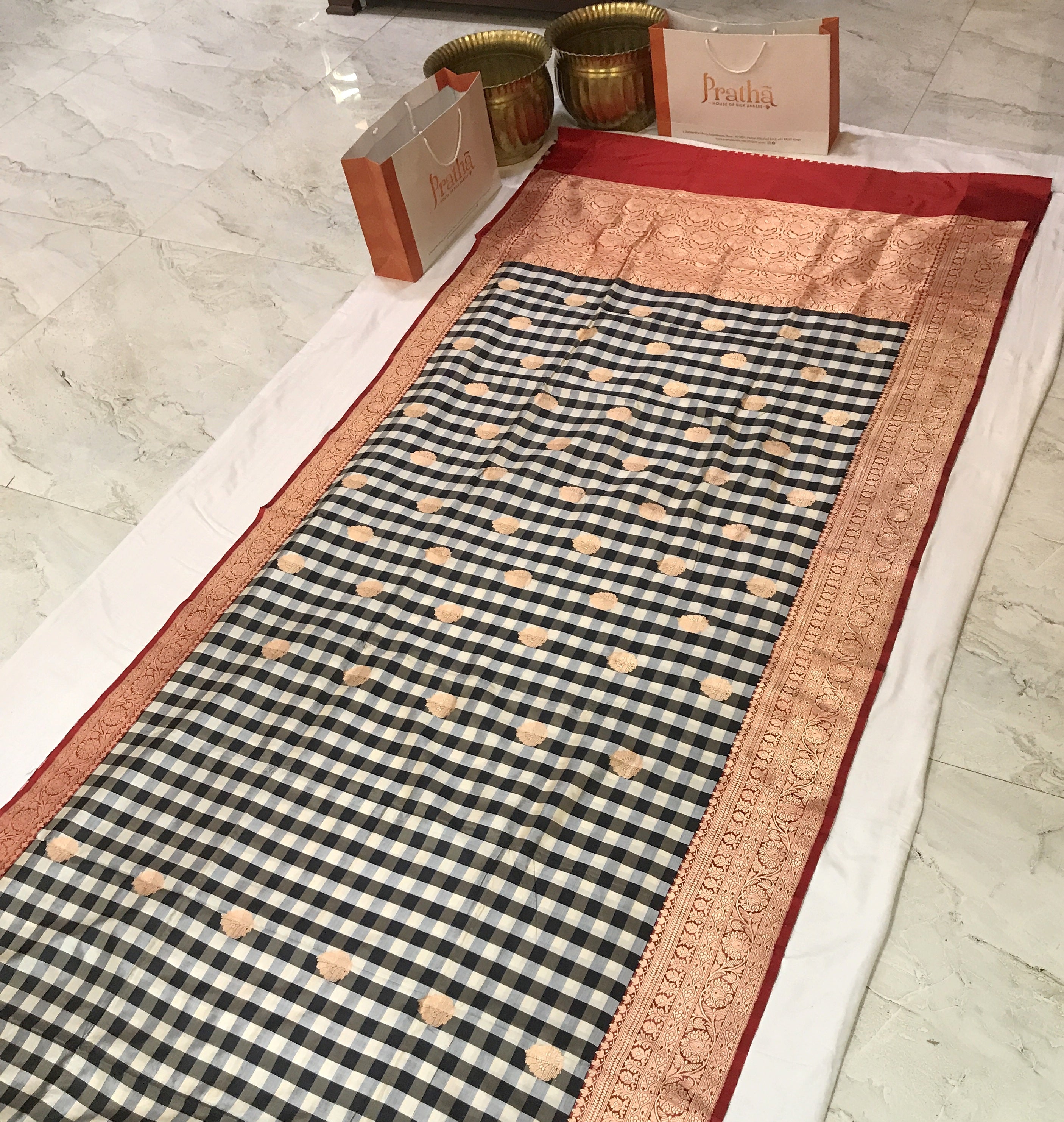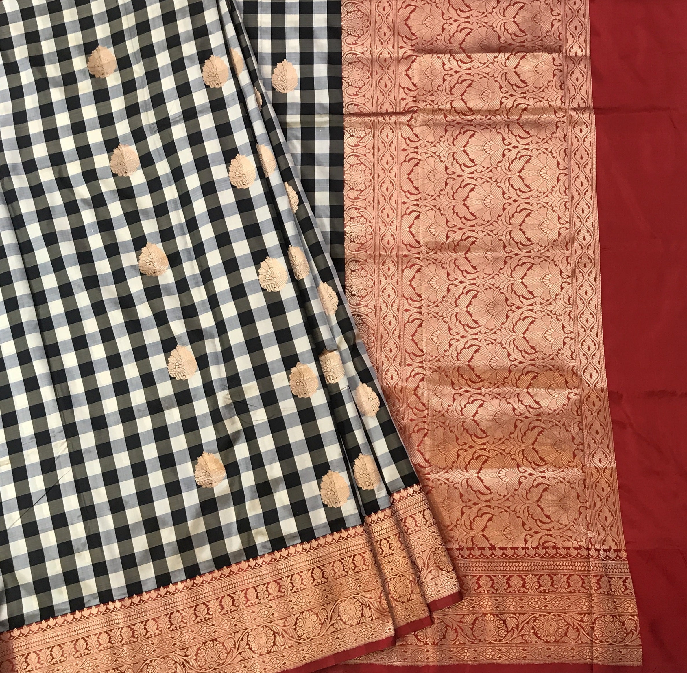 This Checks Banarasi Silk saree, is a very new variety of Banarasi saree which is very unique and attractive. A lovely checks design in black-white with big butti design and contrast red golden zari border, this Banarasi saree is a treat to the eyes! The lovely combination and the subtle golden zari pallu add to the grace of this weave. For those who are on the lookout for something different, this one is just for you!