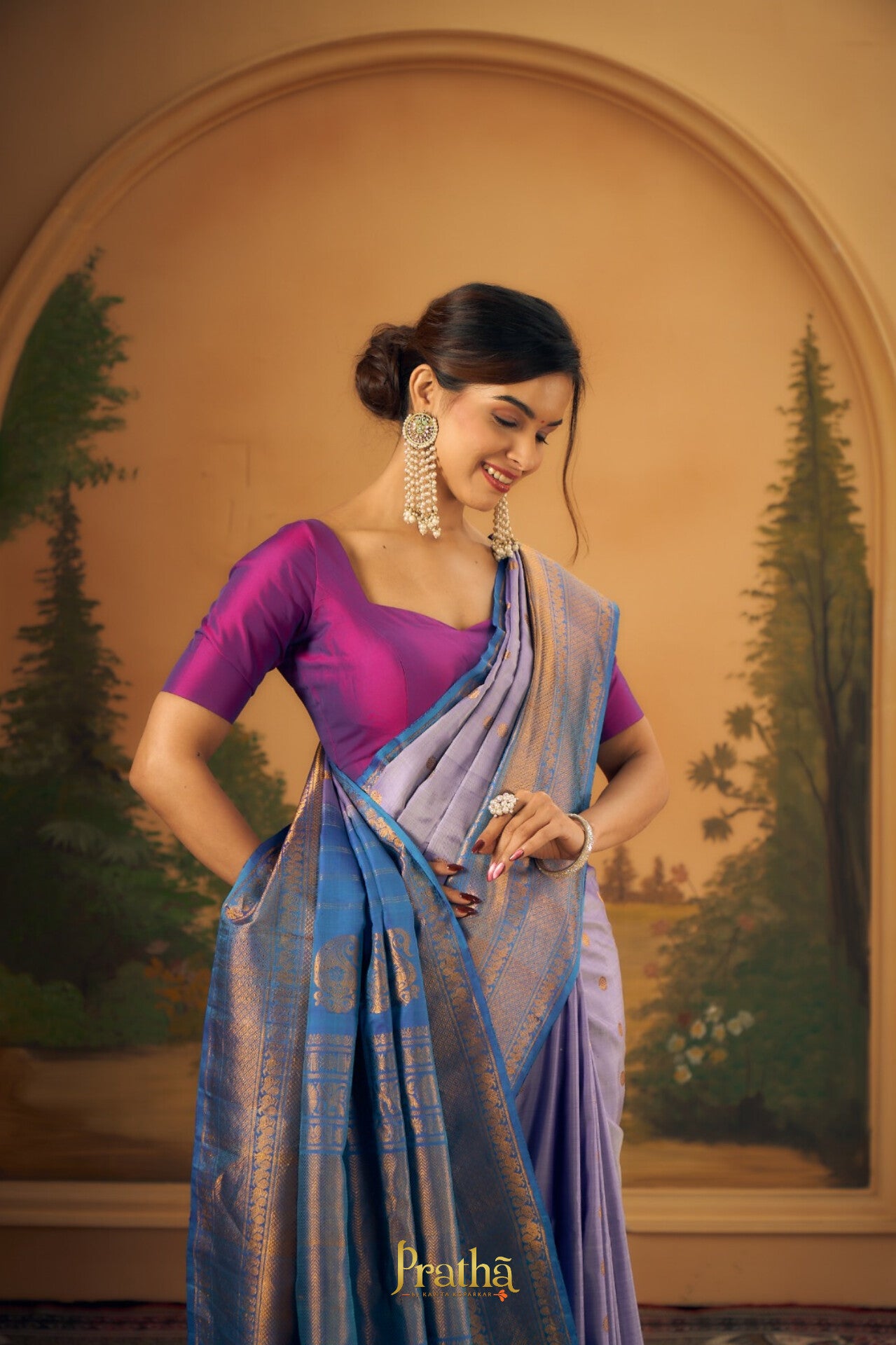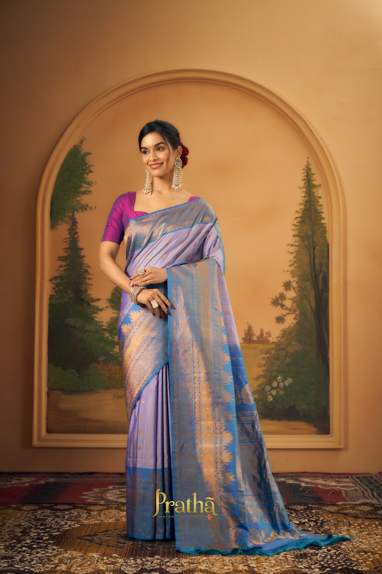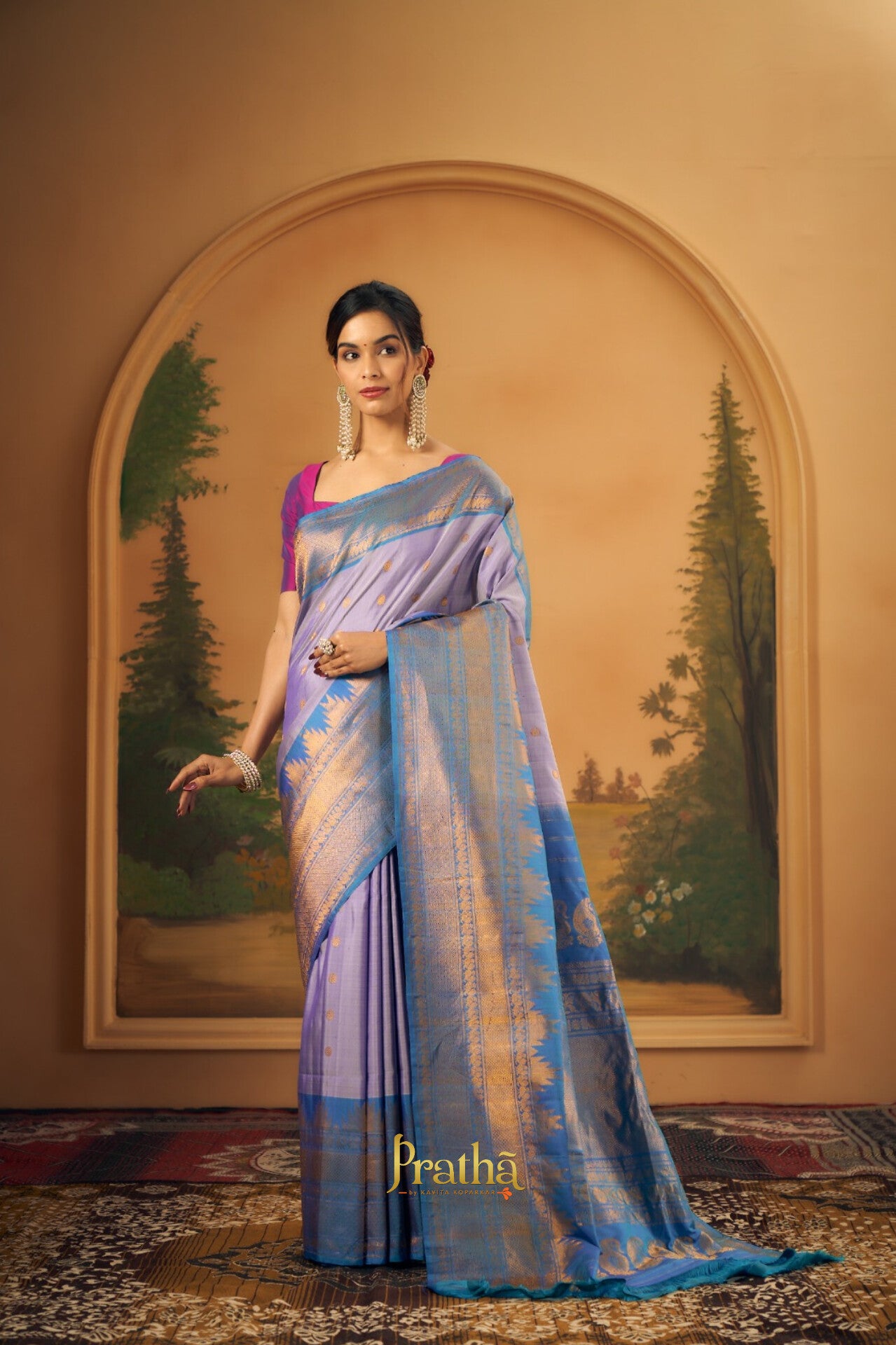This exquisite Gadhwal saree in a rich shade of lavender, adorned with a mesmerizing special designer border and an intricately woven designer zari pallu, exudes sheer elegance. The gracefully arranged floral buttis above the classic Gadhwal border add a touch of sophistication. The intricate designed border enhances its regal charm, making it a true masterpiece.