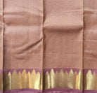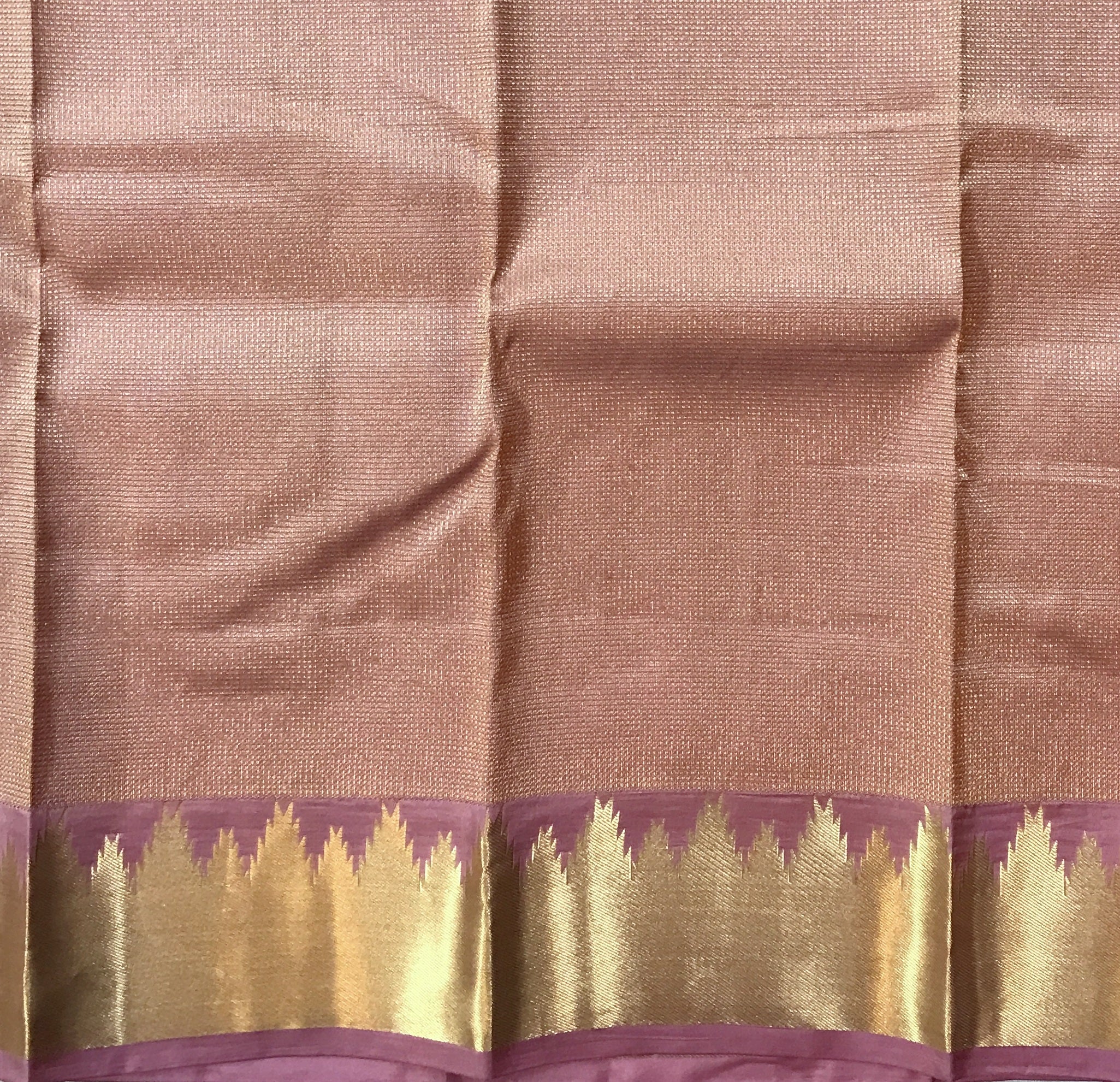 A beautiful shade of pink in traditional powerloom Kanjeevaram with a golden zari ( intricate design ) border, this is a magnificent saree! The unique colour makes it stand out. This saree is perfect for day as well as evening.