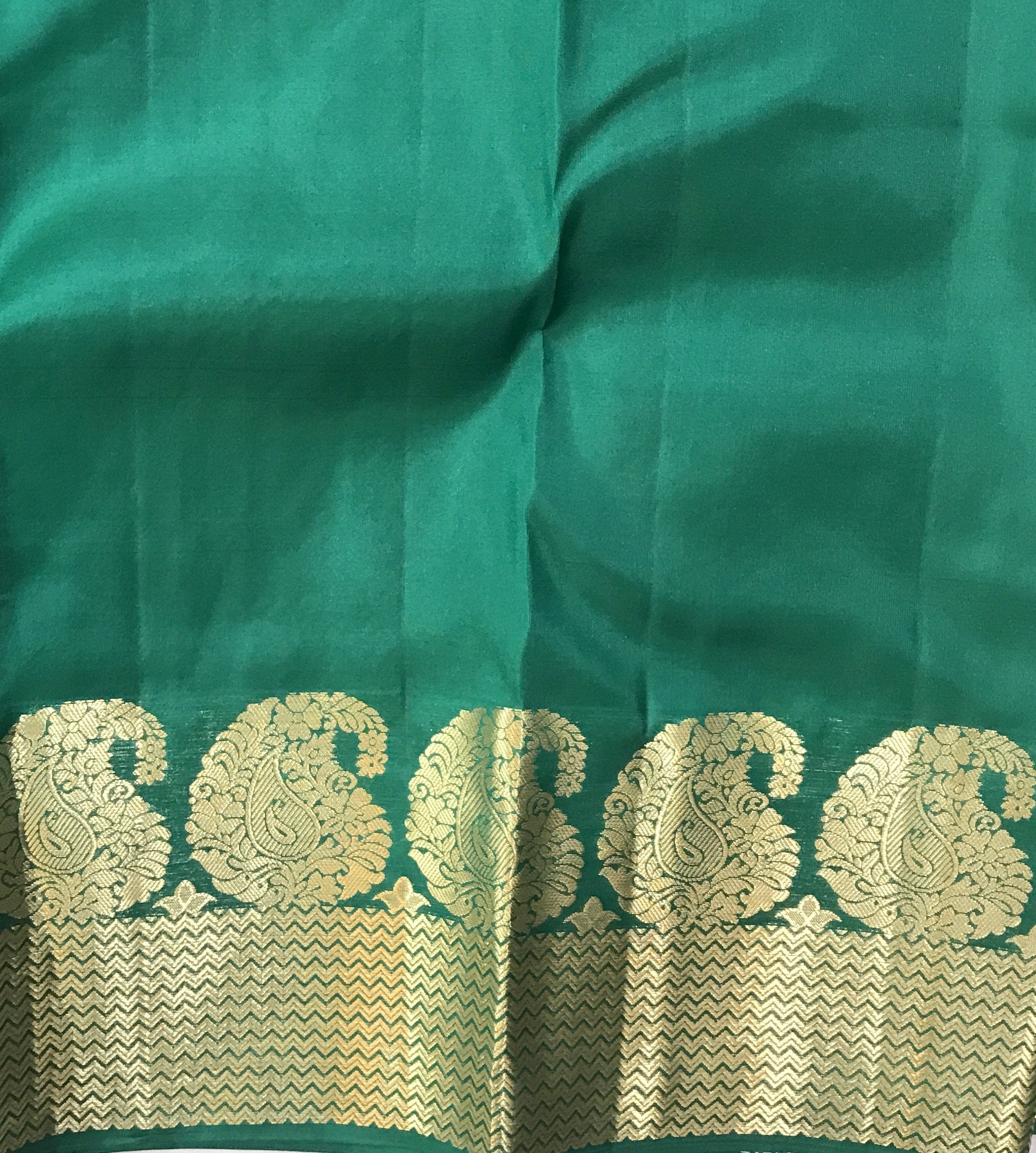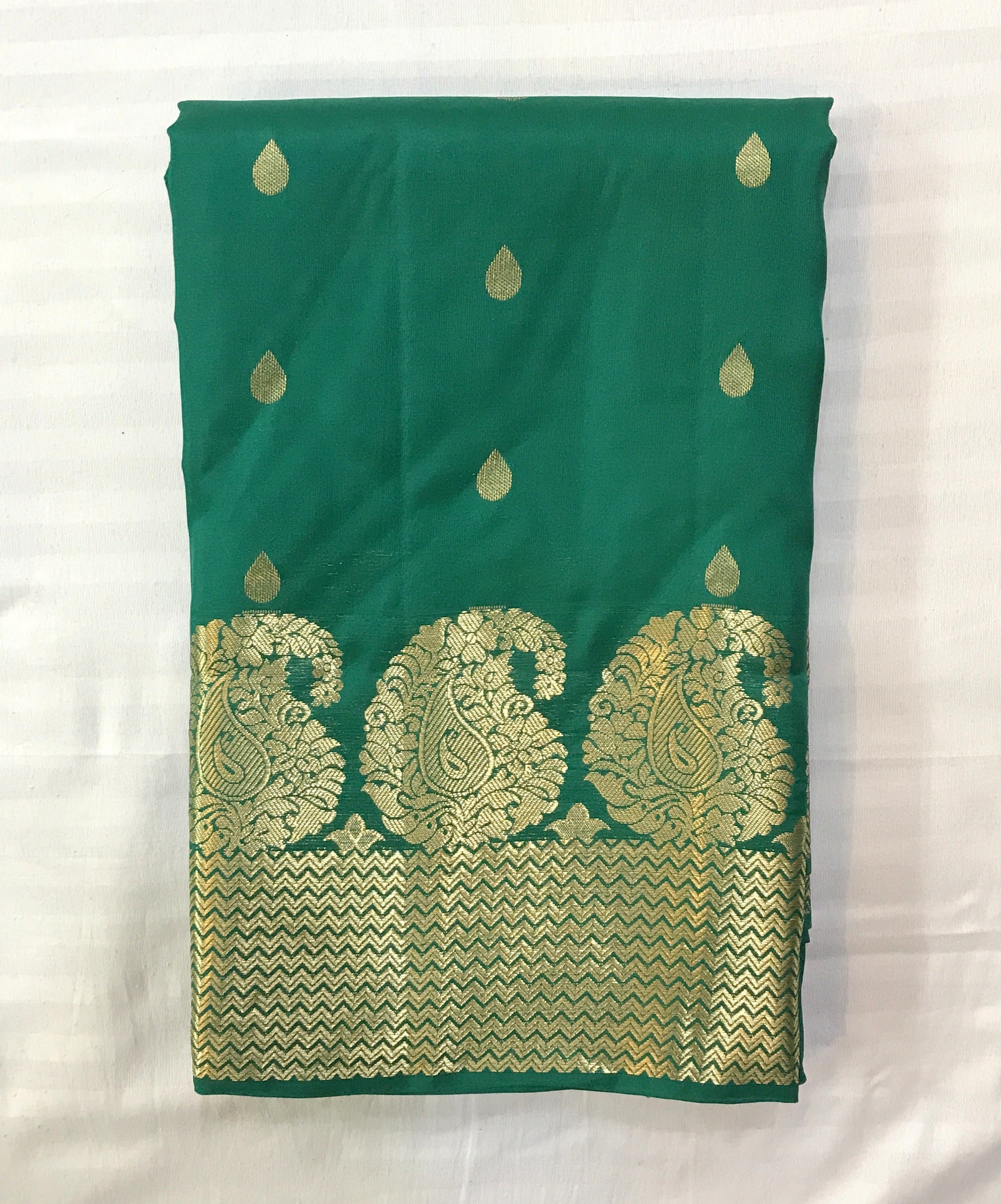 A beautiful shade of green in traditional powerloom Kanjeevaram with a golden zari ( intricate design ) border, this is a magnificent saree! The unique colour makes it stand out. Its small leaf shaped power loom butti with intricate design traditional style border add to its beauty. This saree is perfect for day as well as evening.