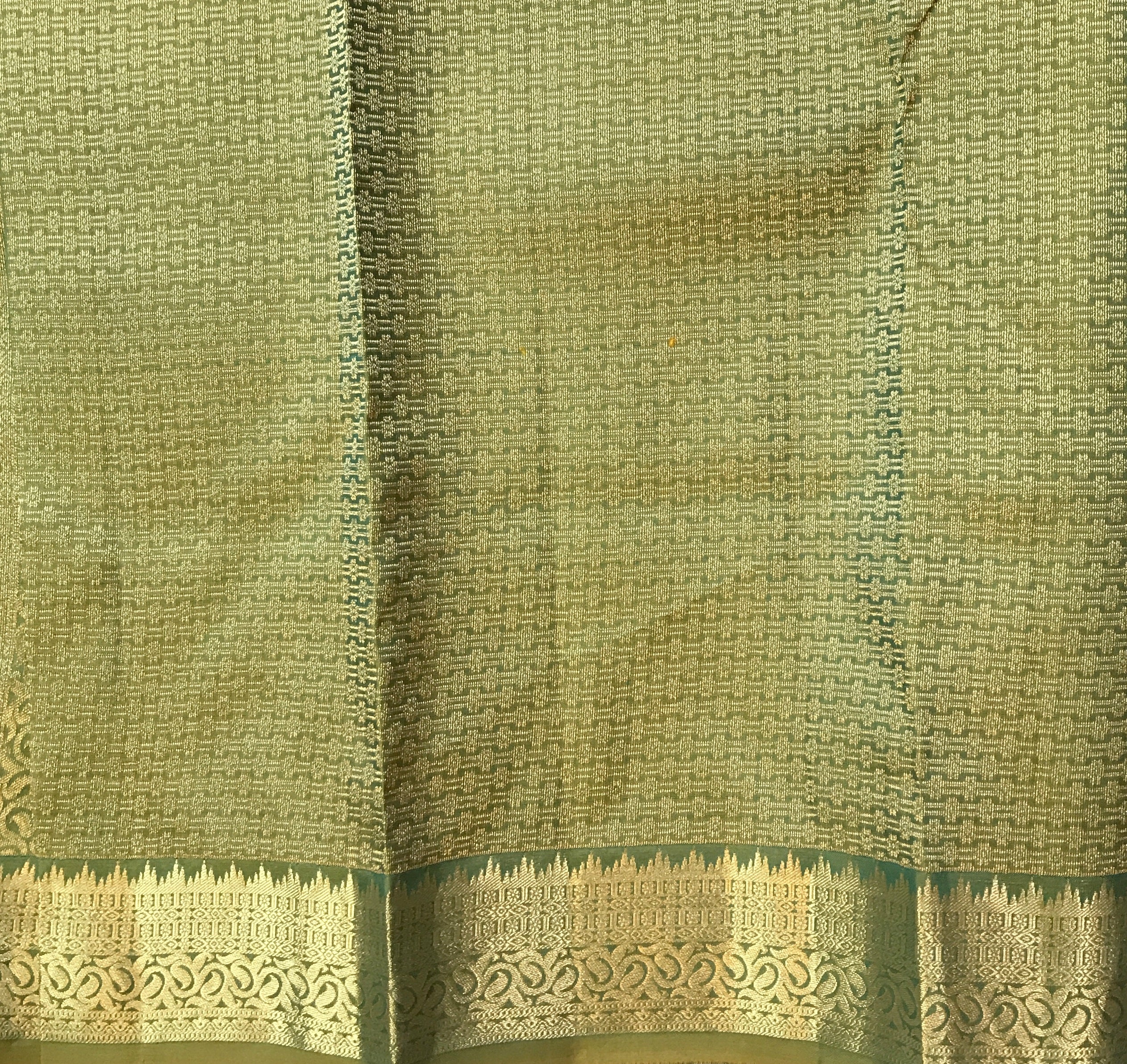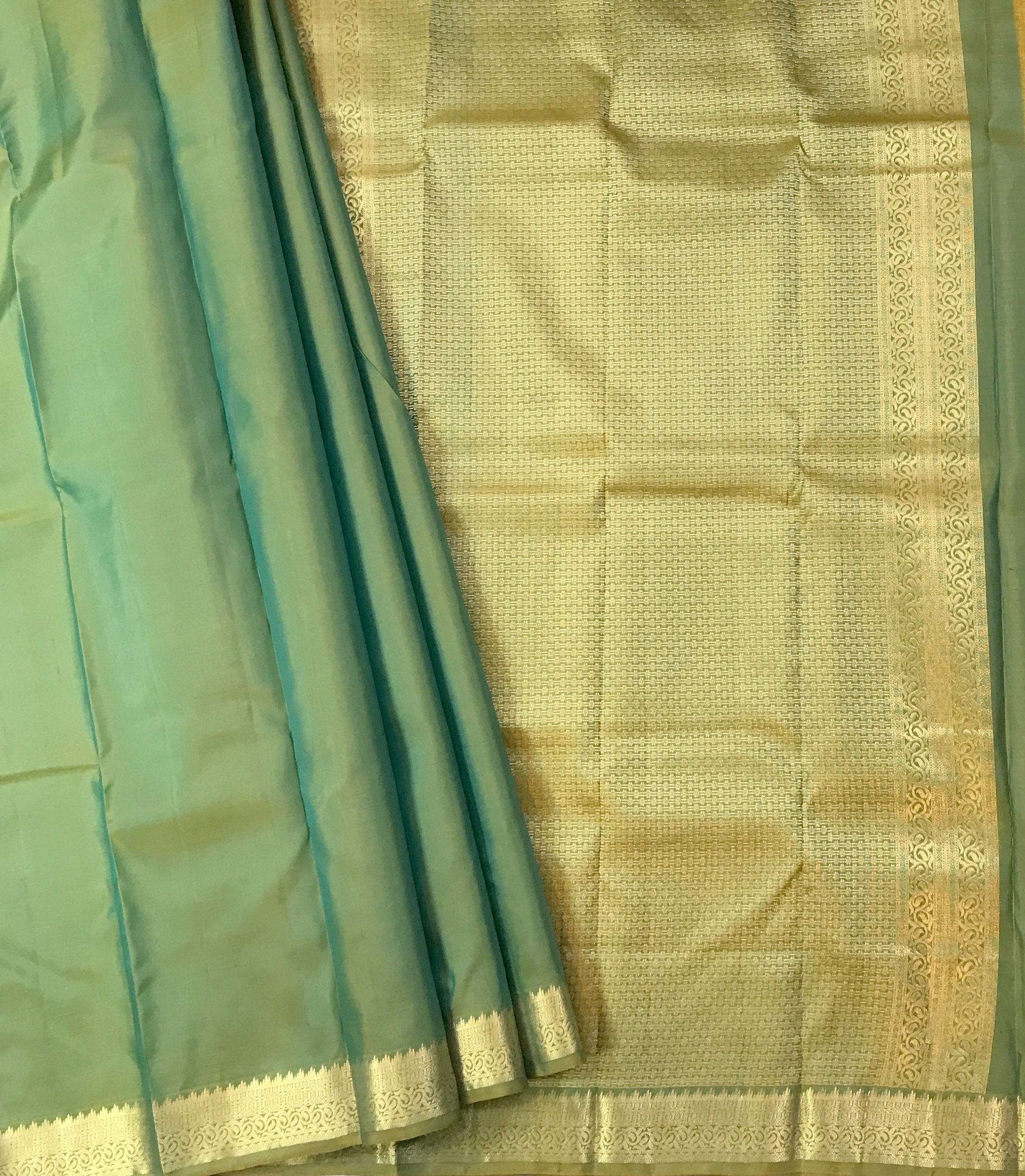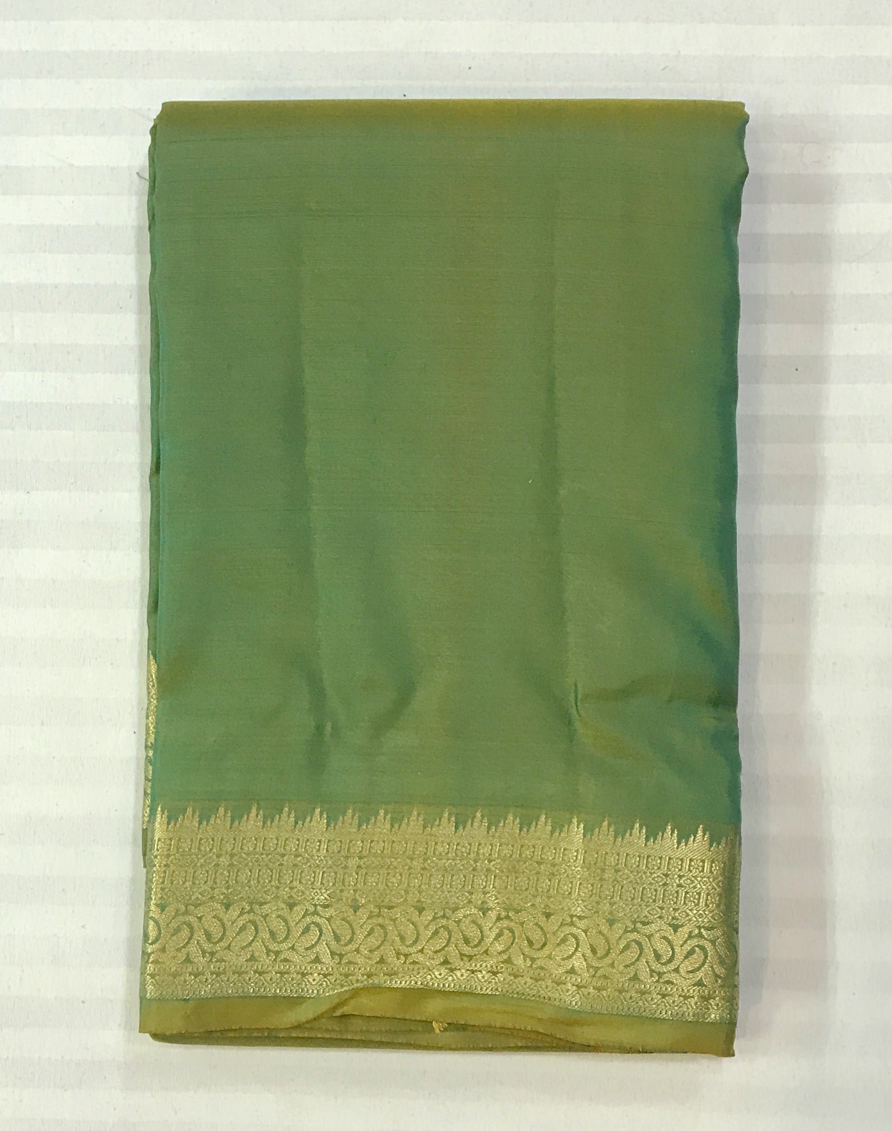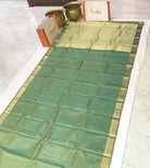 A beautiful shade of green in traditional powerloom Kanjeevaram with a golden zari ( intricate design ) border, this is a magnificent saree! The unique colour makes it stand out. This saree is perfect for day as well as evening.