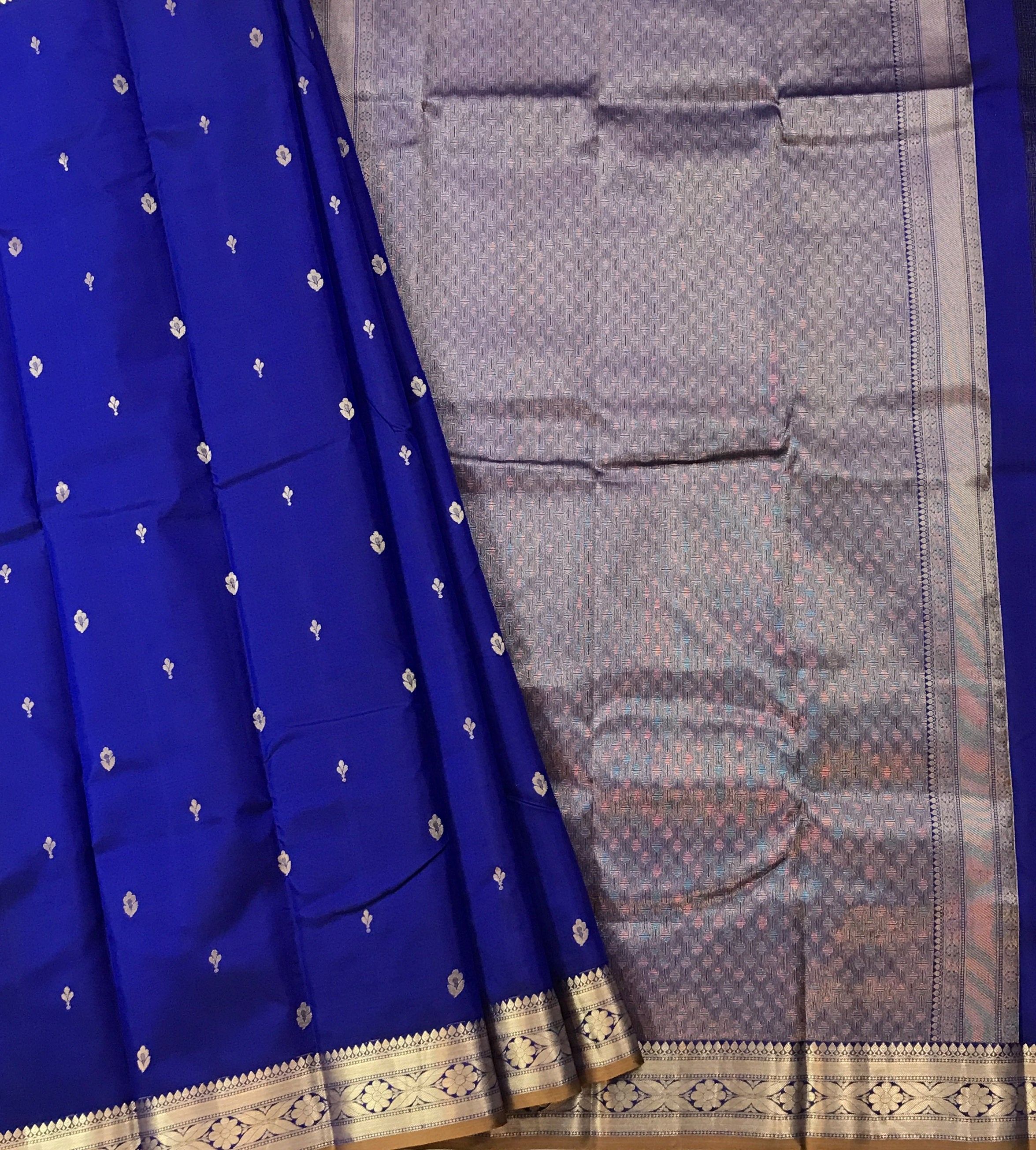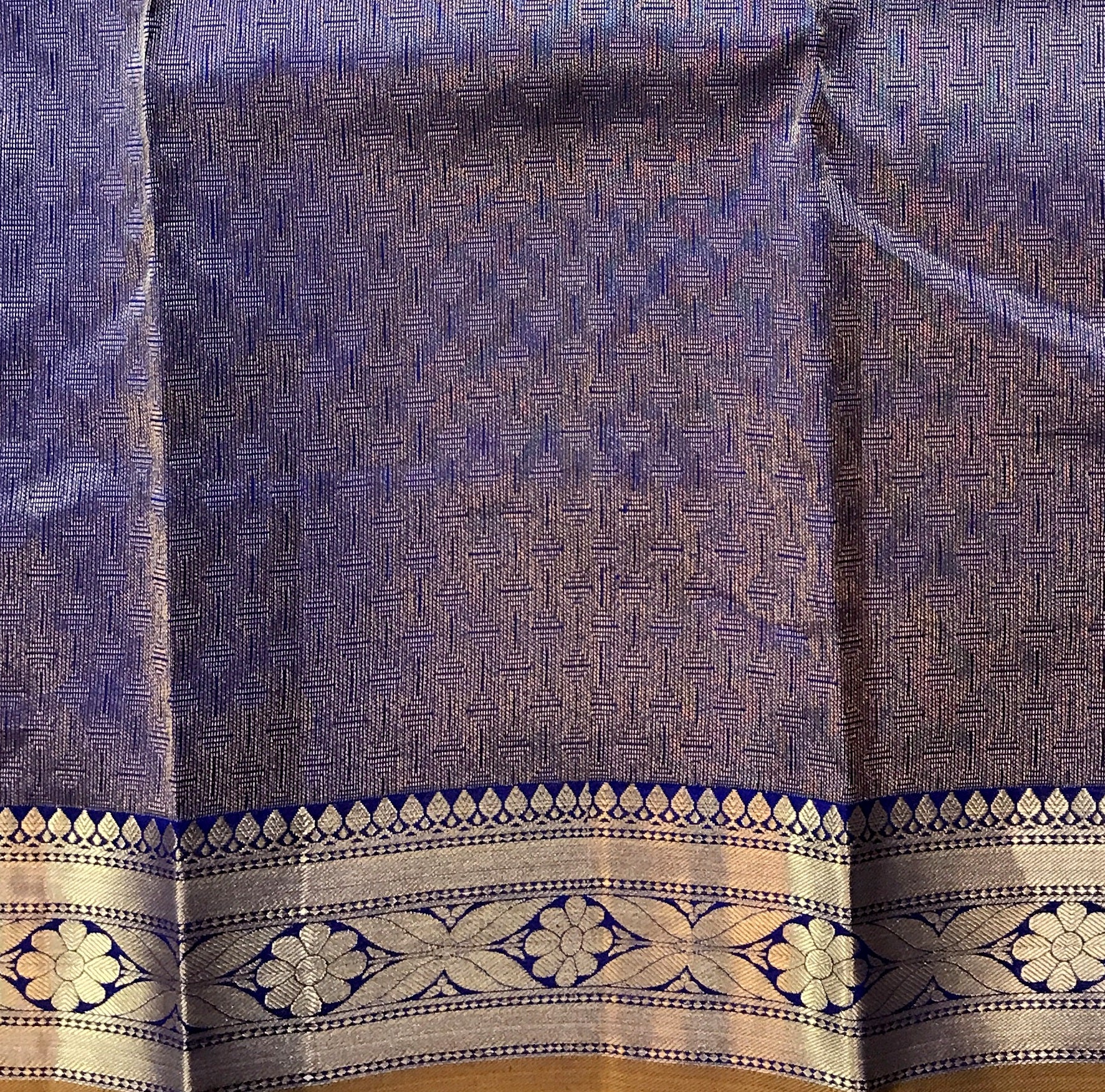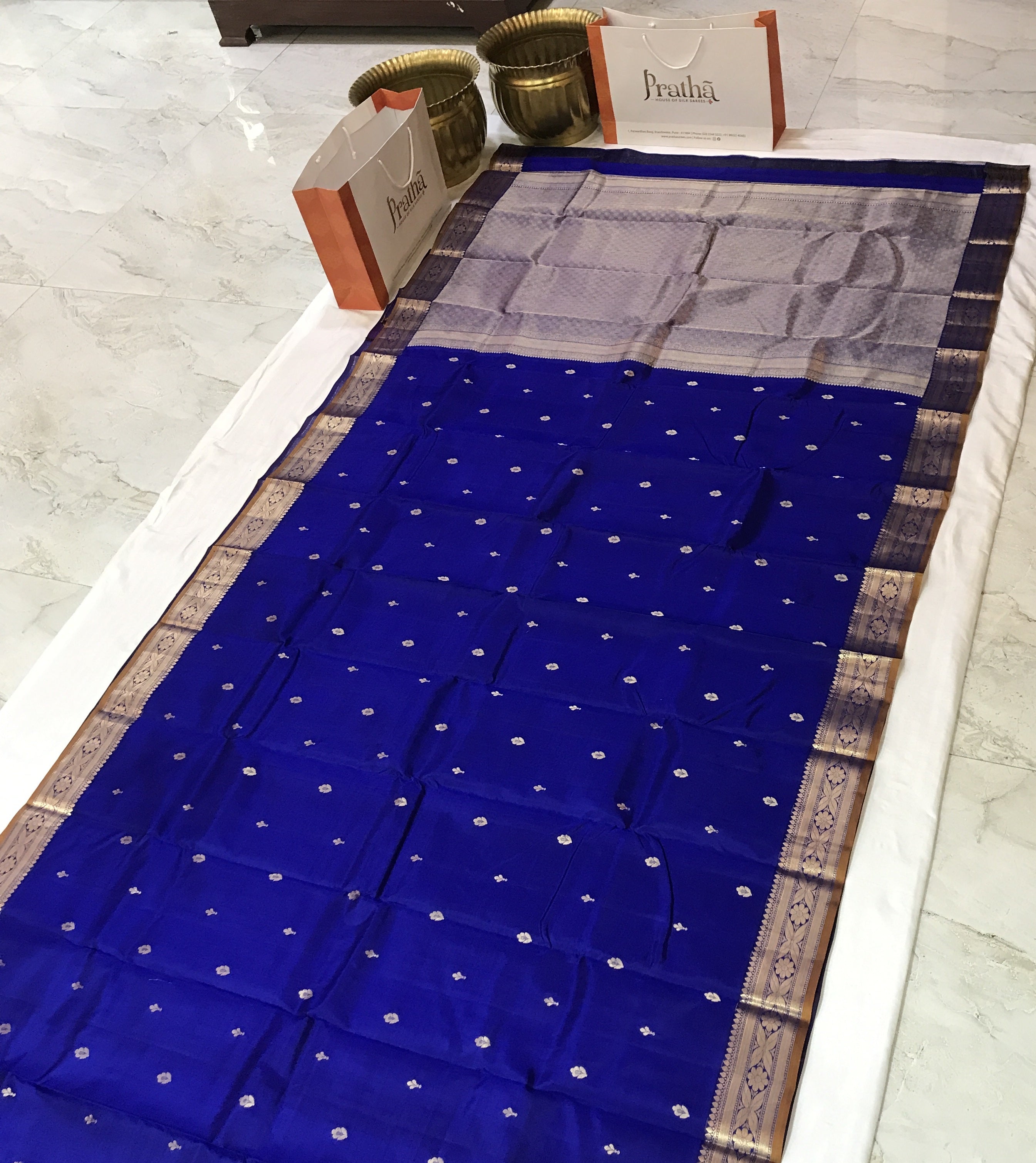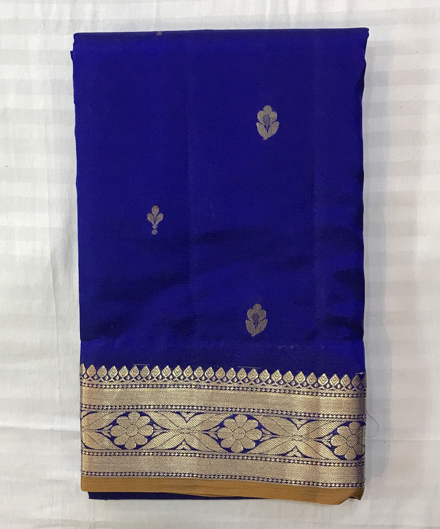 A very beautiful blue Kanjeevaram with very beautiful golden zari border looks ravishing. May you be casual or at a party, or a small function, you can flaunt it at anywhere.
