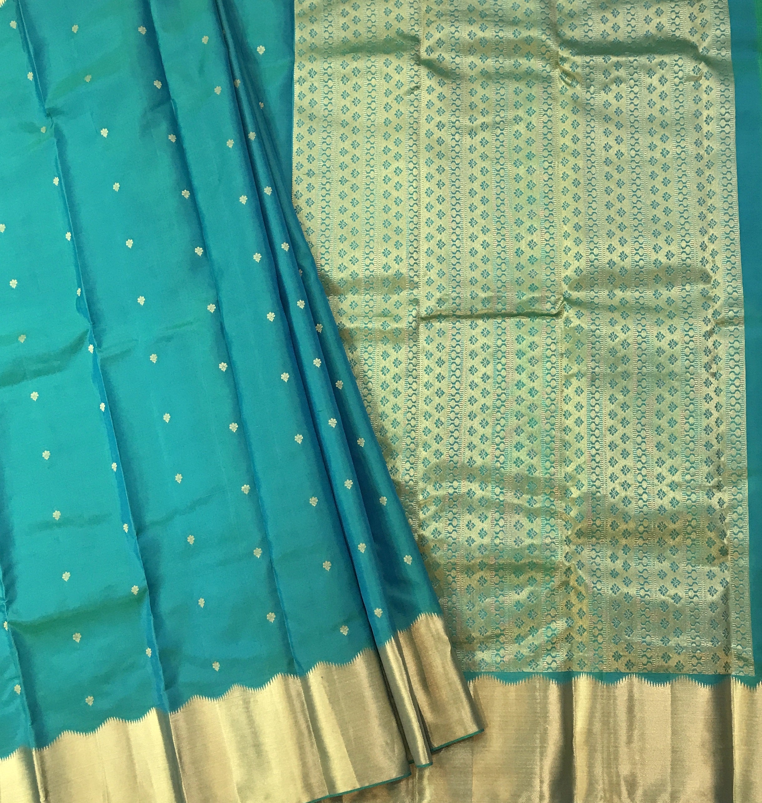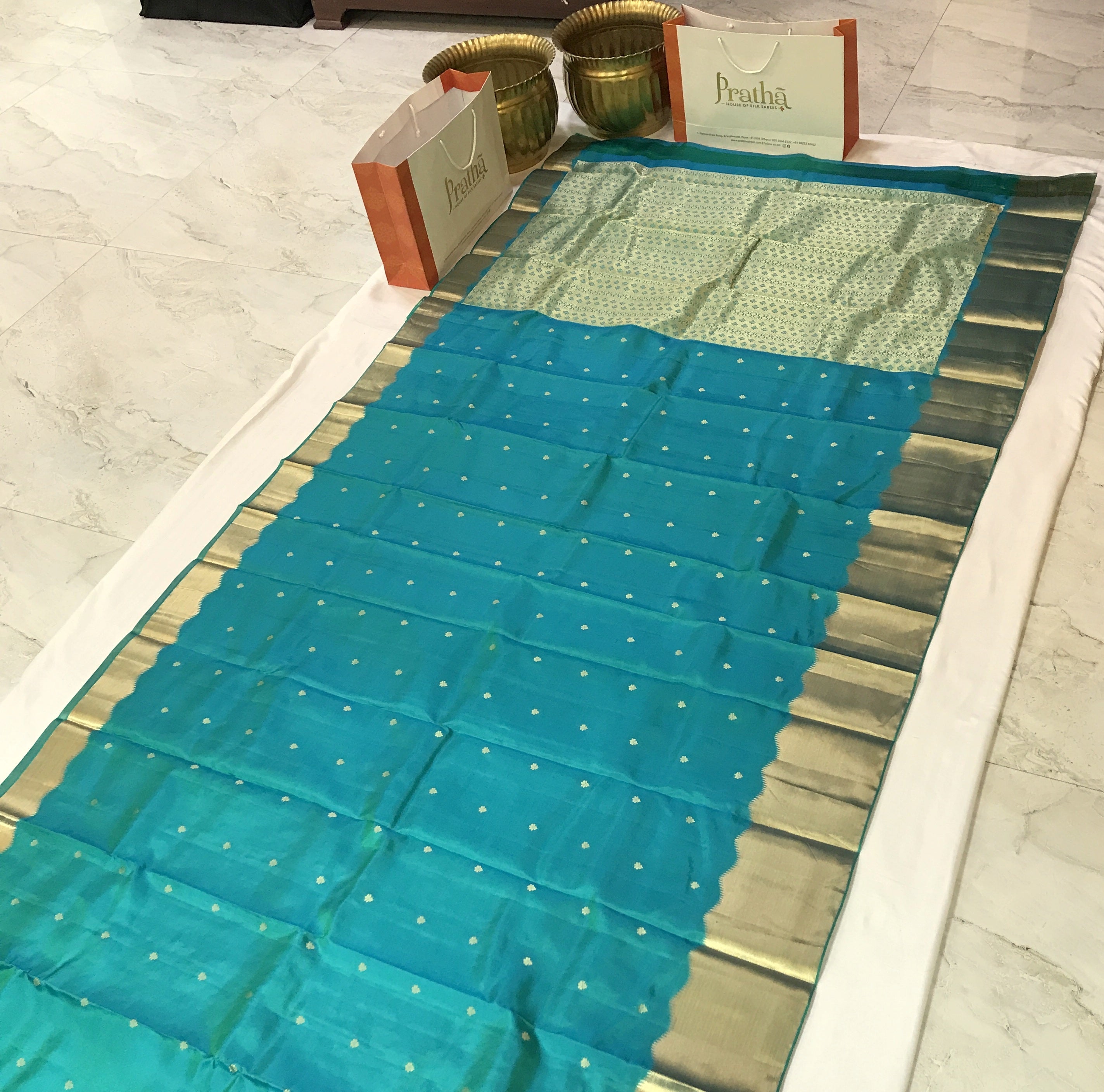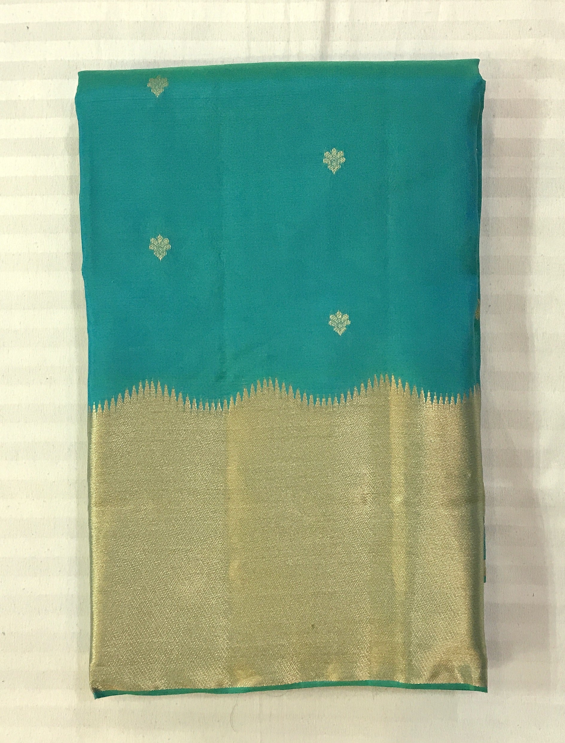 A rich and elegant rotating shade of golden-green Kanjeevaram saree adorned with delicate golden buttis all over the body, this drape exudes timeless charm. The contrast of the lustrous golden zari border enhances its regal appeal, making it perfect for festive and special occasions. The pallu stands out beautifully with intricate zari weaving in a lovely golden hue, lending a traditional look that never goes out of style. Lightweight yet grand, this saree is a wonderful addition to your heritage collection.