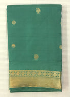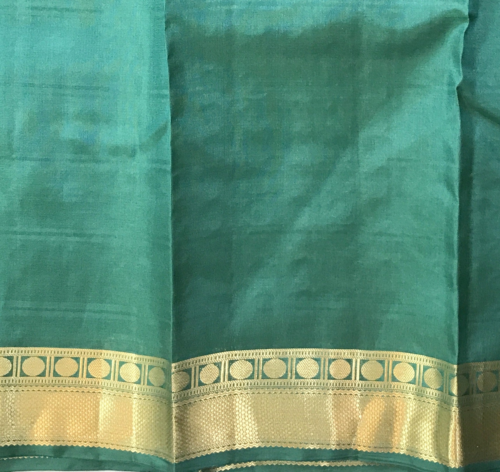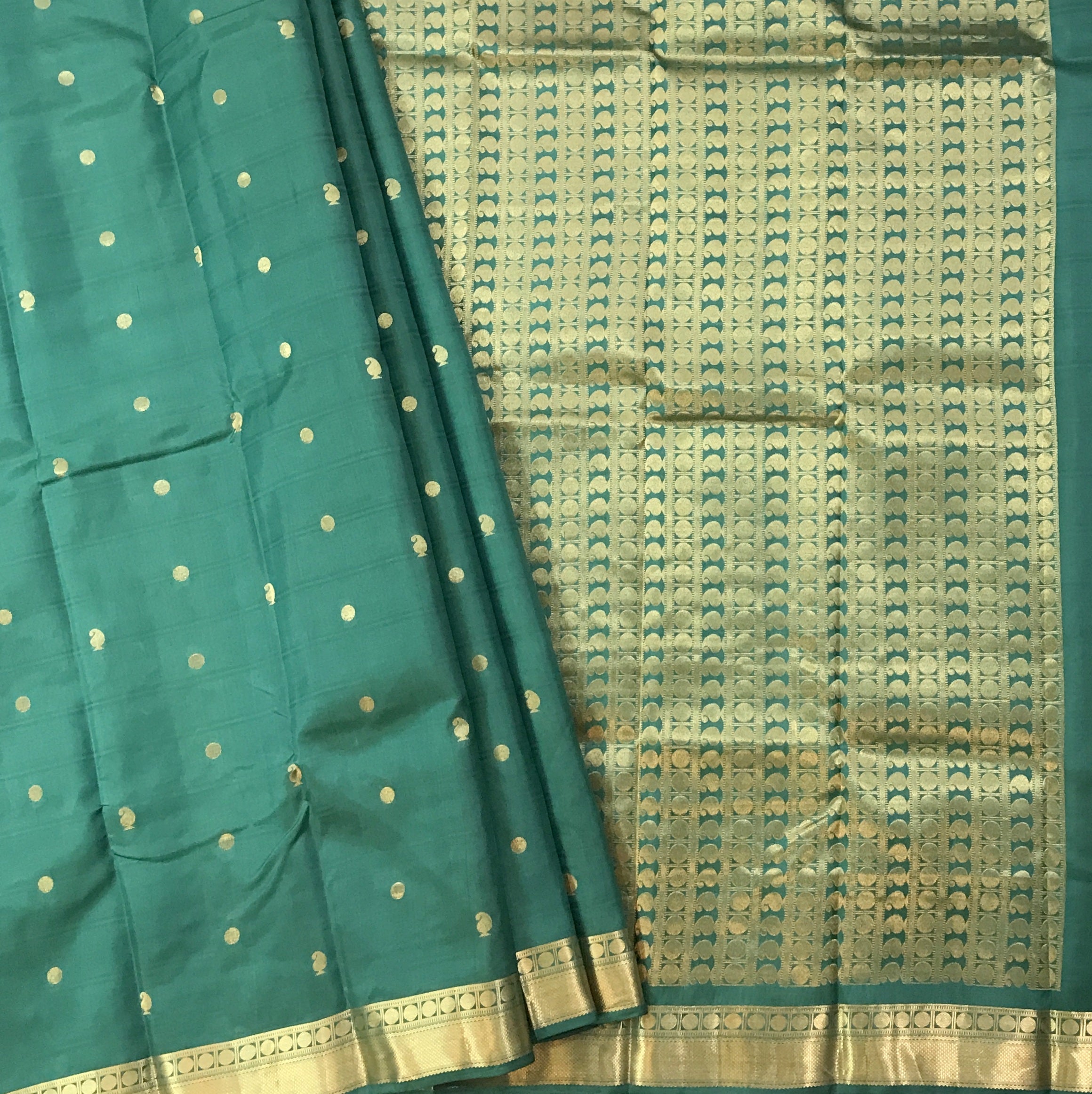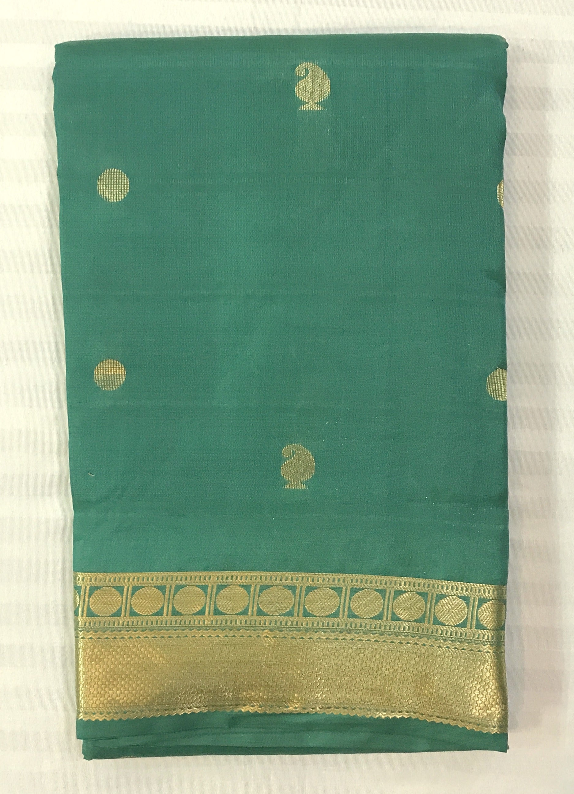 A very beautiful green Kanjeevaram with very beautiful golden zari border looks ravishing. May you be casual or at a party, or a small function, you can flaunt it at anywhere.