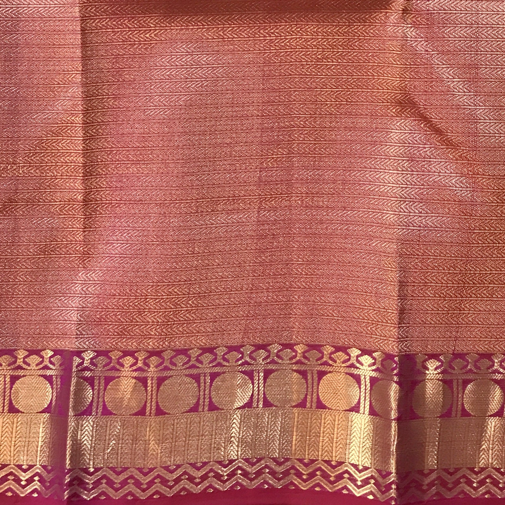 A very beautiful pink Kanjeevaram with very beautiful golden zari border looks ravishing. May you be casual or at a party, or a small function, you can flaunt it at anywhere.