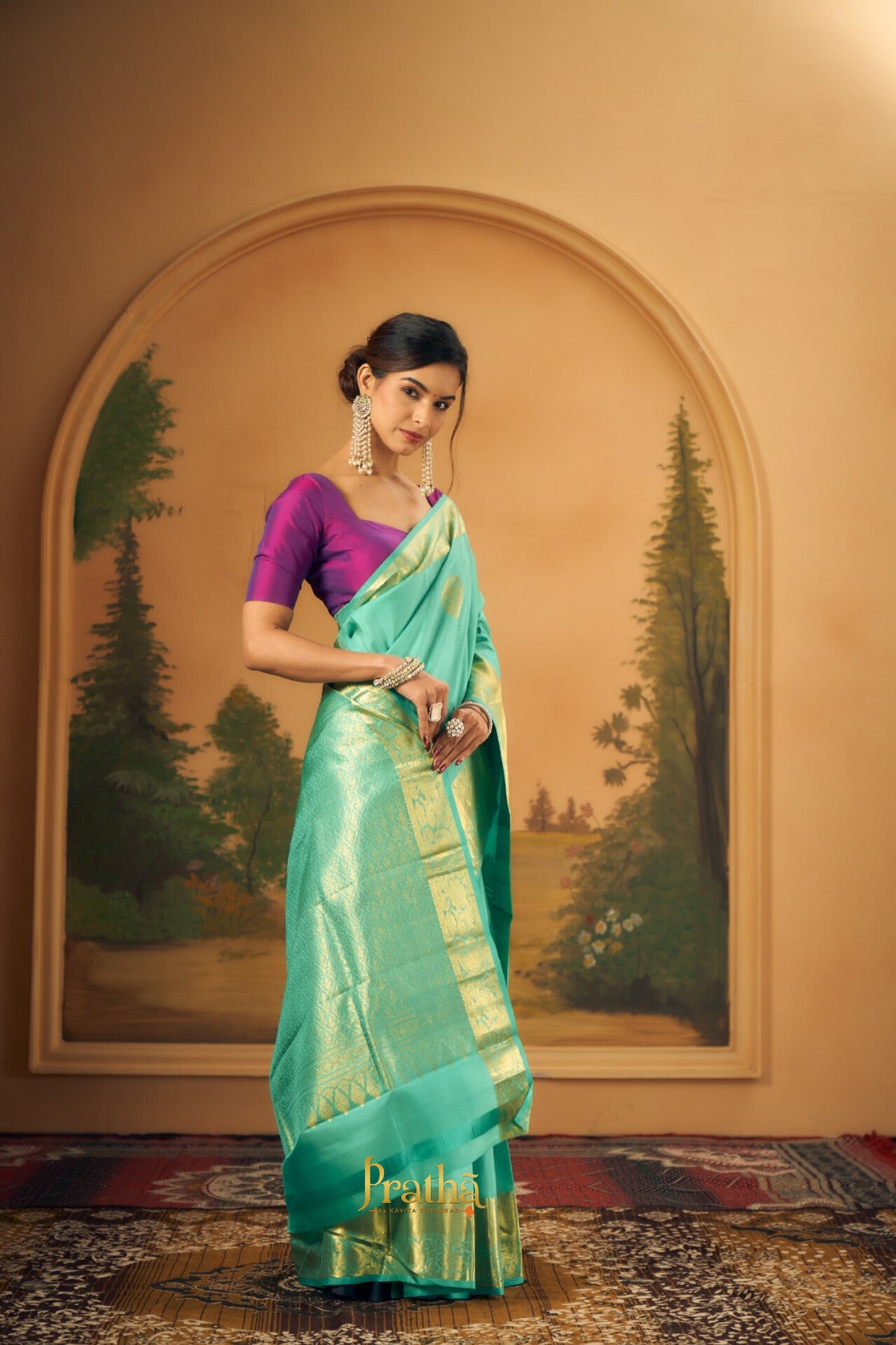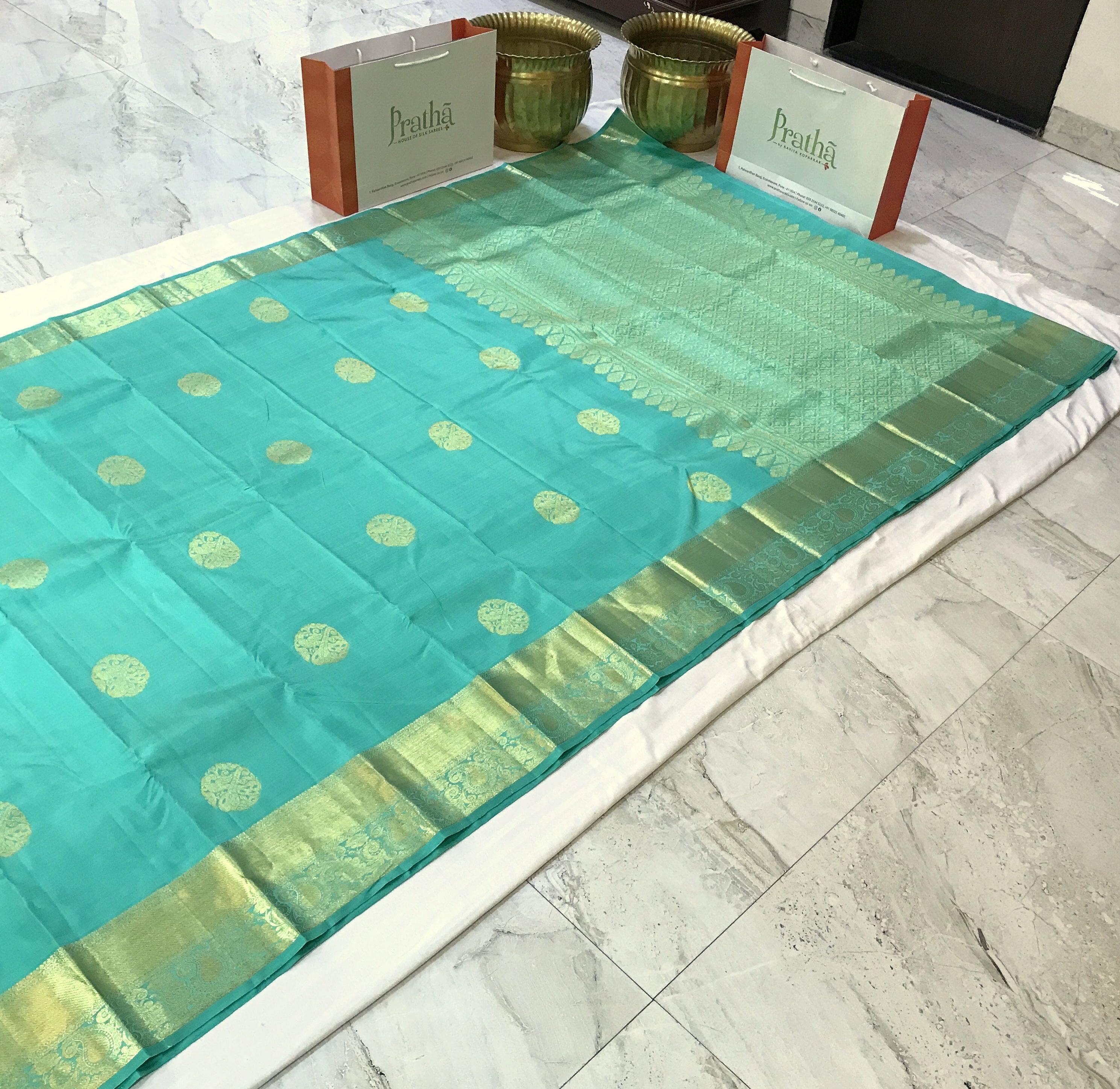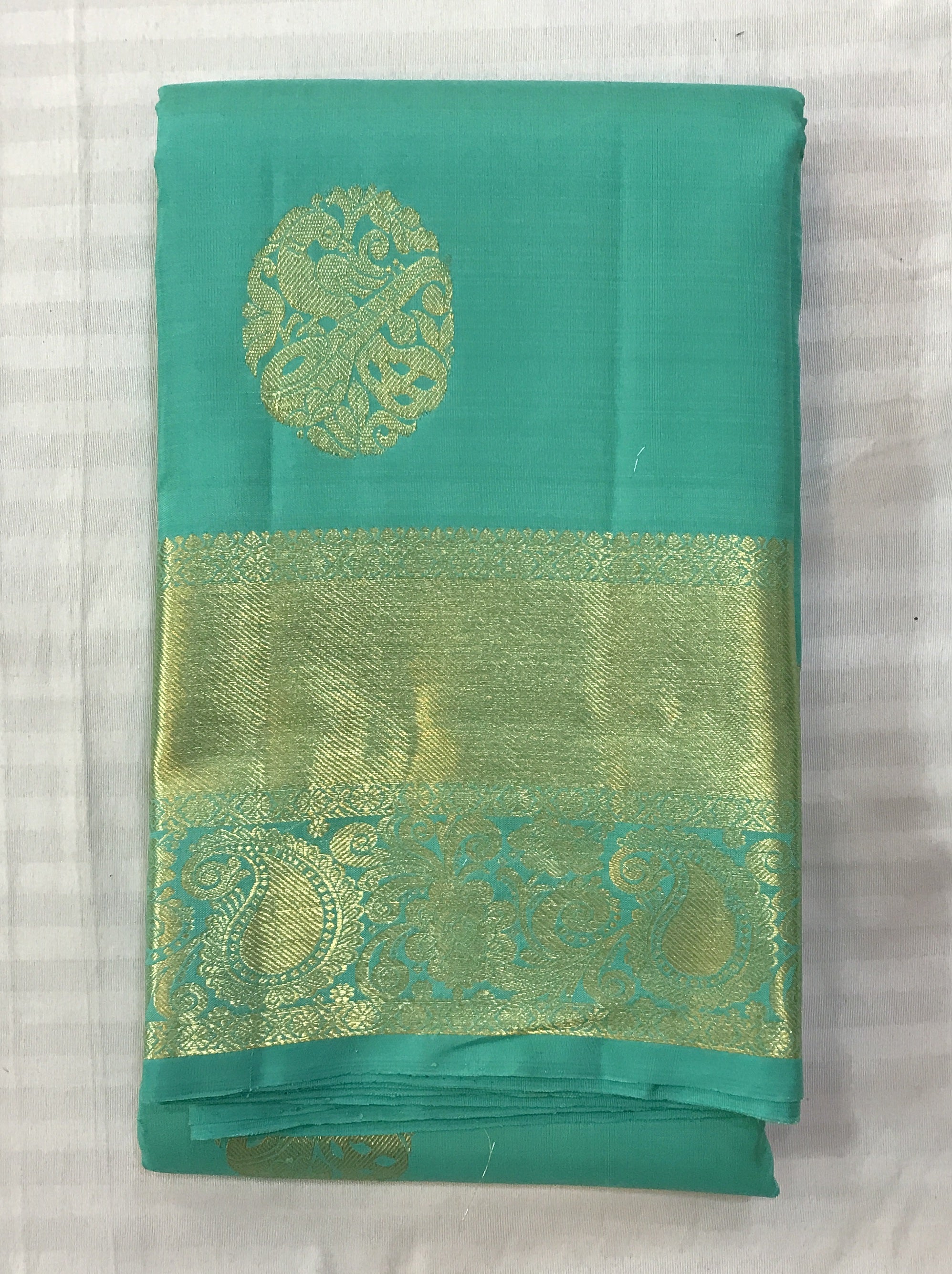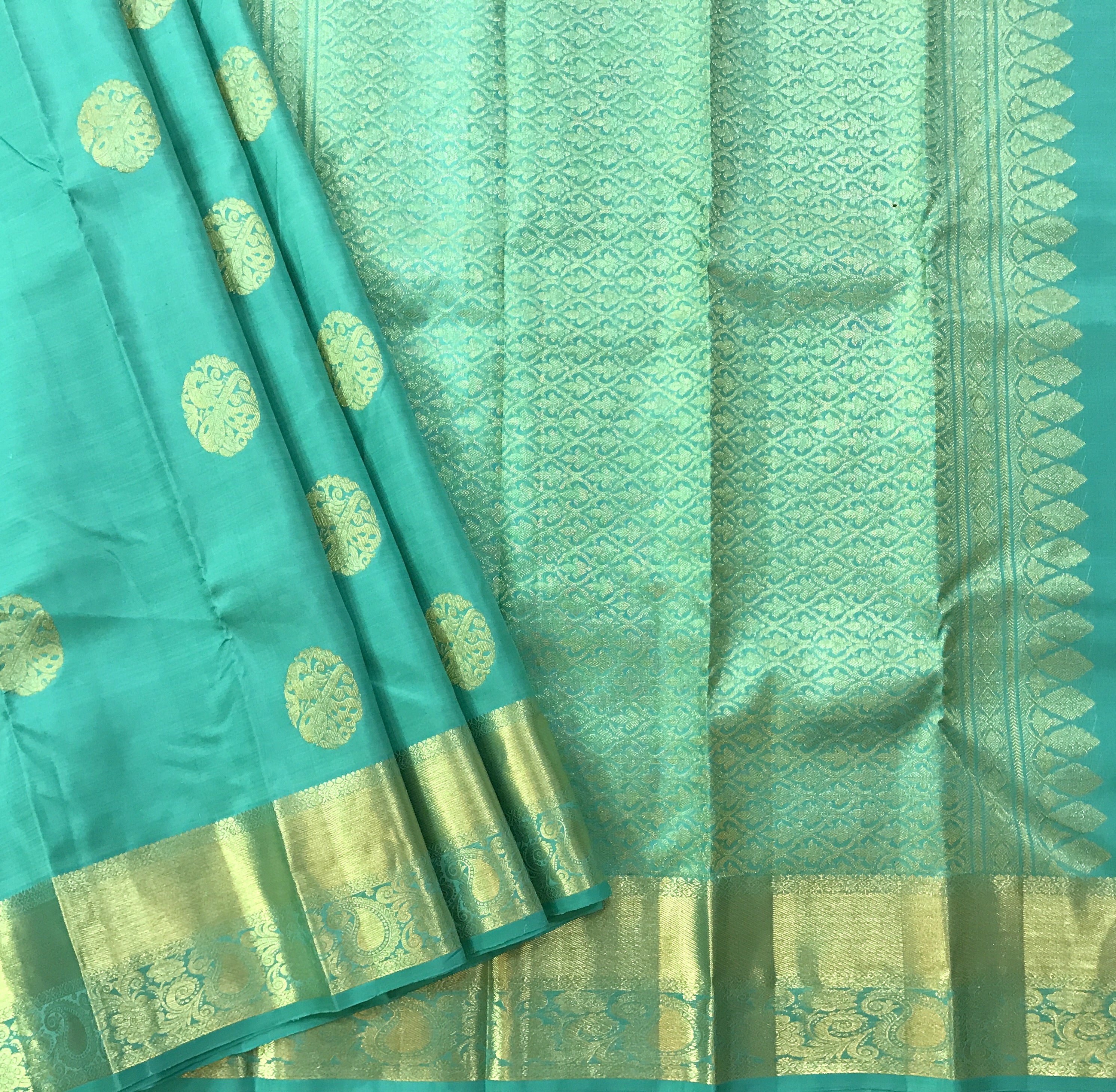 This perfect combination of pista-green with broad golden zari border, there is a balance of colour in this Pratha Kanjeevaram. The intricate big leaf shaped butti in golden zari and the equally intricate golden zari design on the border and a very beautiful zari pallu makes this saree an attractive one!