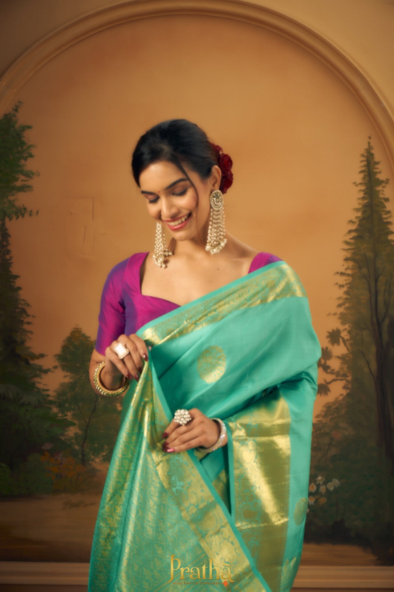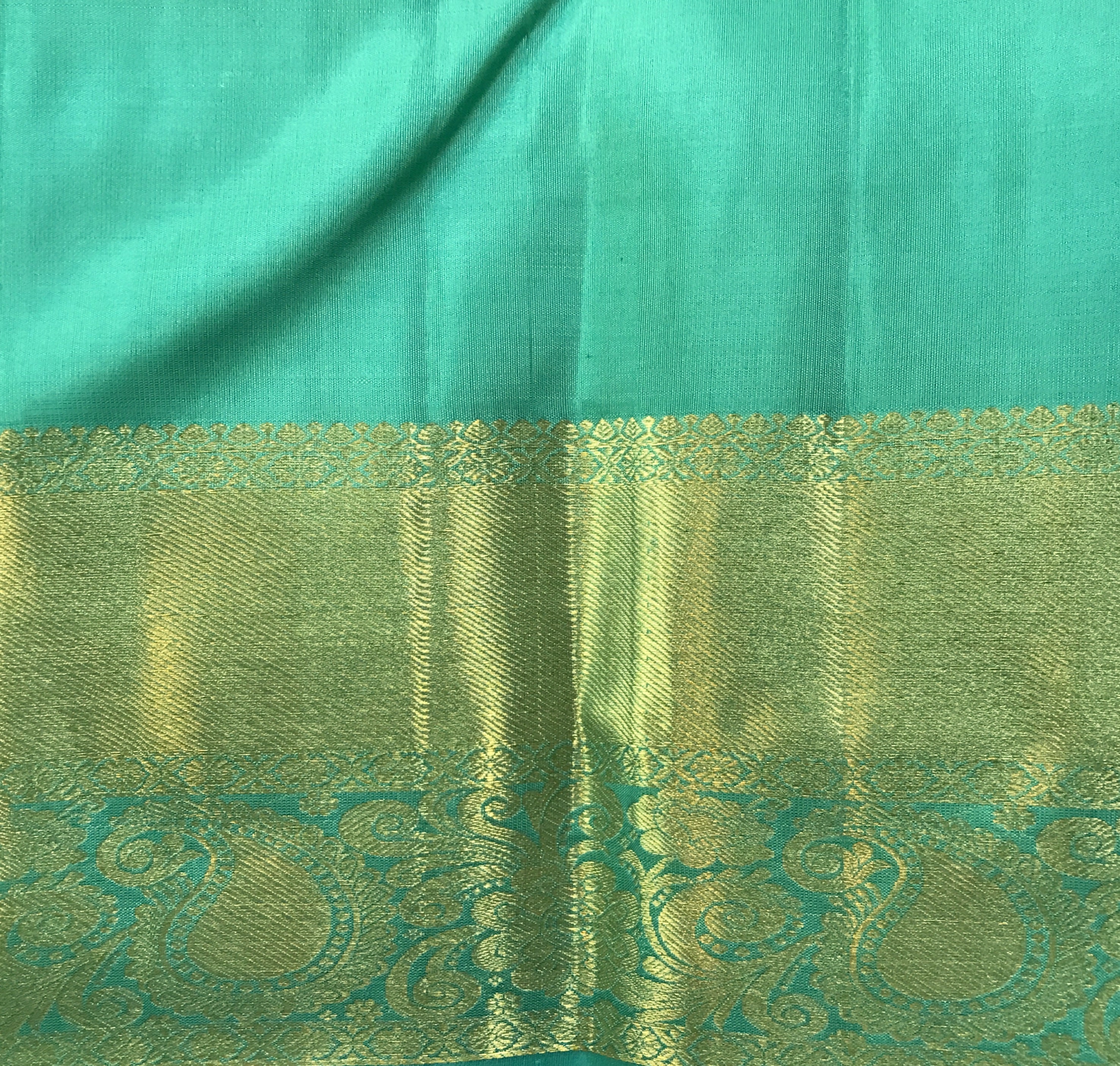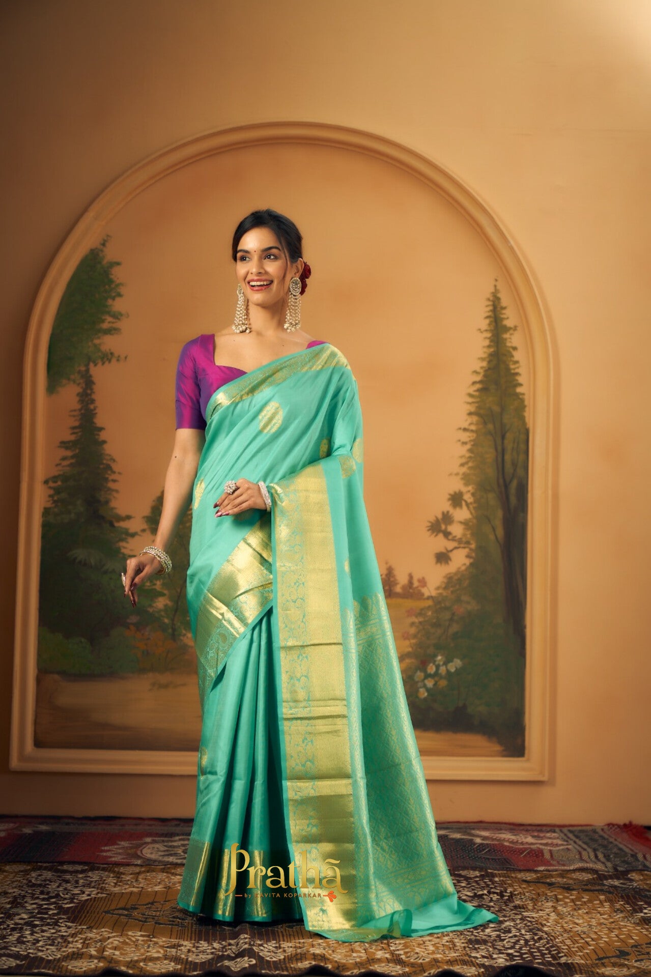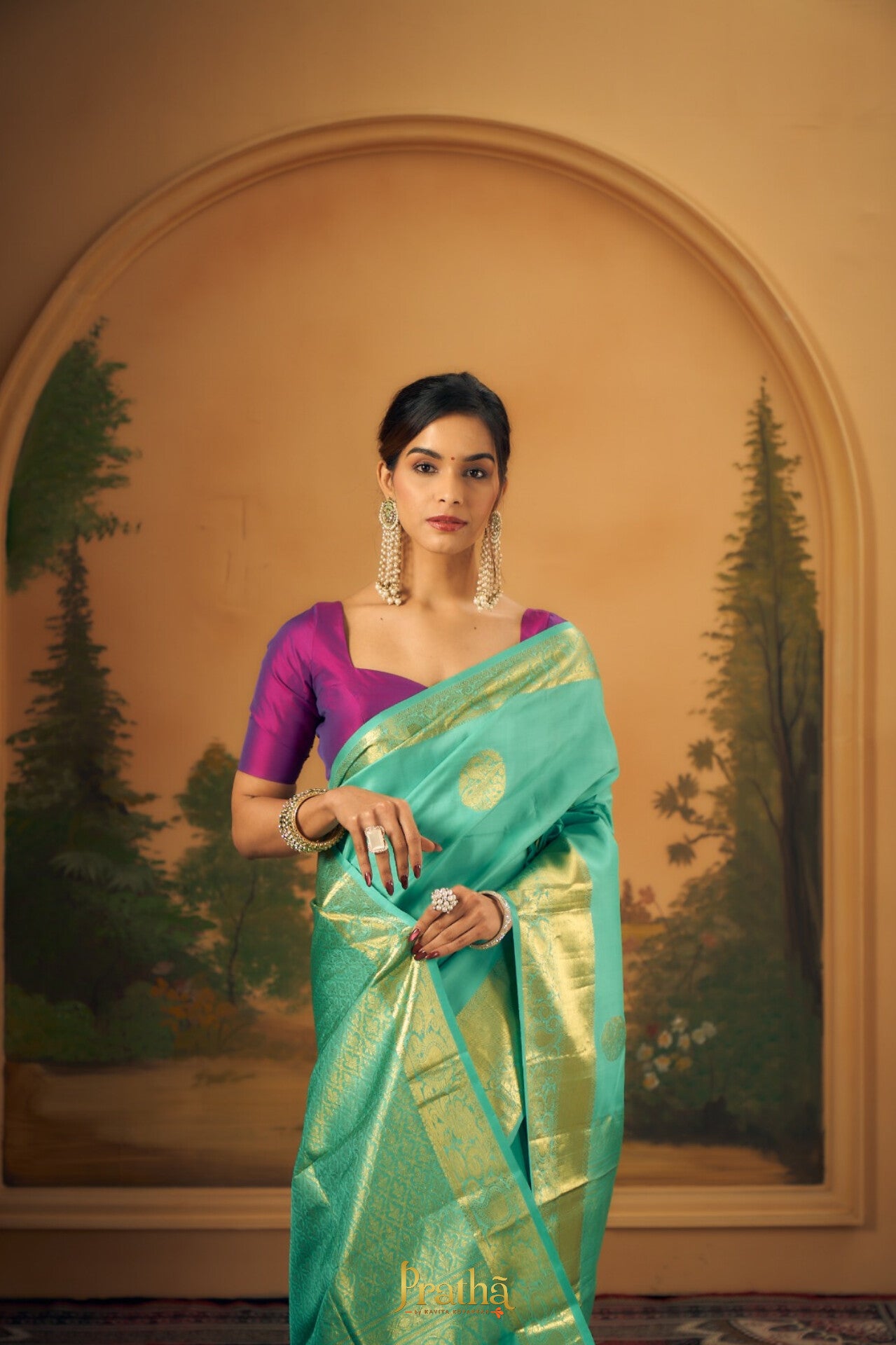 This perfect combination of pista-green with broad golden zari border, there is a balance of colour in this Pratha Kanjeevaram. The intricate big leaf shaped butti in golden zari and the equally intricate golden zari design on the border and a very beautiful zari pallu makes this saree an attractive one!